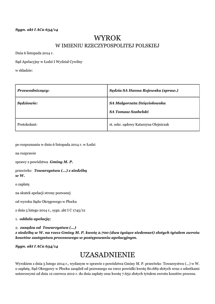 Sygn. akt I ACa 634/14 WYROK W IMIENIU RZECZYPOSPOLITEJ POLSKIEJ Dnia 6 listopada 2014 r. Sąd Apelacyjny w Łodzi I Wydział Cywilny w składzie: Przewodniczący: Sędzia SA Hanna Rojewska (spraw.) Sędziowie: SA Małgorzata Dzięciołowska SA Tomasz Szabelski Protokolant: st. sekr. sądowy Katarzyna Olejniczak po rozpoznaniu w dniu 6 listopada 2014 r. w Łodzi na rozprawie sprawy z powództwa Gminy M. P. przeciwko Towarzystwu (...) z siedzibą w W. o zapłatę na skutek apelacji strony pozwanej od wyroku Sądu Okręgowego w Płocku z dnia 5 lutego 2014 r., sygn. akt I C 1745/12 1. oddala apelację; 2. zasądza od Towarzystwa (...) z siedzibą w W. na rzecz Gminy M. P. kwotę 2.700 (dwa tysiące siedemset) złotych tytułem zwrotu kosztów zastępstwa procesowego w postępowaniu apelacyjnym. Sygn. akt I ACa 634/14 UZASADNIENIE Wyrokiem z dnia 5 lutego 2014 r., wydanym w sprawie z powództwa Gminy M. P. przeciwko Towarzystwu (...) w W. o zapłatę, Sąd Okręgowy w Płocku zasądził od pozwanego na rzecz powódki kwotę 80.689 złotych wraz z odsetkami ustawowymi od dnia 12 czerwca 2012 r. do dnia zapłaty oraz kwotę 7.652 złotych tytułem zwrotu kosztów procesu. Powyższy wyrok zapadł na podstawie poczynionych przez Sąd pierwszej instancji ustaleń faktycznych, z których wynika, że powódka Gmina M. P. była inwestorem zadania inwestycyjnego pn.: „Poprawa infrastruktury, płynności transportu i bezpieczeństwa na drogach w gminie P.". Wykonawcą została firma (...). C. w W.. W § 15 umowy łączącej powódkę z Wykonawcą ustalono, iż w przypadku wykrycia wad Zamawiający jest zobowiązany o nich zawiadomić Wykonawcę na piśmie w terminie 7 dni od daty jej ujawnienia. Istnienie wady powinno być stwierdzone protokolarnie z wyznaczeniem przez Zamawiającego terminu na usunięcie wad. Wykonawca zobowiązał się, w okresie gwarancji, do bezpłatnego usunięcia wad w terminie wyznaczonym przez zamawiającego. Ustalono też, iż jeżeli Wykonawca nie usunie wad w terminie 7 dni od daty wyznaczonej przez zamawiającego na usuniecie, to zamawiający może zlecić usunięcie wad stronie trzeciej na koszt Wykonawcy. W tym przypadku koszty usuwania wad będą pokrywane w pierwszej kolejności z zabezpieczenia należytego wykonania umowy (umowa nr ZP.272.6.2011). W dniu 7 grudnia 2011 r. Towarzystwo (...) w W. jako Gwarant zawarło na okres od 7 grudnia 2011 r. do 20 grudnia 2014 r. umowę Gwarancji ubezpieczeniowej właściwego usunięcia wad i usterek nr (...) z (...) Barbara F. C. w W. jako Wykonawcą, na rzecz Beneficjenta - Gminy M. P.; w nawiązaniu do umowy o realizację zadania inwestycyjnego pn.: „Poprawa infrastruktury, płynności transportu i bezpieczeństwa na drogach w gminie P." Nr ZP.272.6. (...) z dnia 30.03.2011 r. Na jej mocy Gwarant oświadczył, że „nieodwołalnie i bez stawiana warunków poza przewidzianymi w niniejszym dokumencie gwarantuje na rzecz Beneficjenta zapłatę do kwoty 80.689 złotych”. W § 2 umowy ustalono, iż „Gwarancja niniejsza zabezpiecza roszczenia Beneficjenta w stosunku do Wykonawcy powstałe z tytułu nie zapłacenia przez Wykonawcę należności, powstałych w okresie obowiązywania niniejszej Gwarancji, w związku z niewłaściwym usunięciem wad lub usterek, naruszającym postanowienia otrzymanej gwarancji jakości lub rękojmi za wady wynikające z Umowy". Zgodnie z § 3 ust. 1 i 2 umowy „na podstawie niniejszej gwarancji Gwarant zapłaci na rzecz Beneficjenta kwotę roszczenia w terminie 14 dni od dnia otrzymania oryginału pierwszego pisemnego wezwania do zapłaty wraz z oświadczeniem, iż żądana kwota wskazana w wezwaniu jest należna. Na wezwaniu oraz na oświadczeniu powinny widnieć podpisy osób właściwie umocowanych do składania oświadczeń woli w imieniu Beneficjenta. Wezwanie Beneficjenta do zapłaty, o którym mowa w ust. 1, pod rygorem nieważności, musi być złożone w formie pisemnej i podpisane przez osoby upoważnione do składania oświadczeń woli w imieniu Beneficjenta w zakresie jego praw i zobowiązań majątkowych". W § 4 ustalono, iż każda kwota zapłacona z gwarancji obniża wartość gwarancji o wysokość kwoty zapłaconej. Ponadto w § 5 określono, iż „żadna zmiana czy uzupełnienie lub inna modyfikacja warunków Umowy, które mogą zostać przeprowadzone na podstawie tej Umowy lub dokumentów przetargowych nie uwalniają Gwaranta od odpowiedzialności wynikającej z niniejszej gwarancji. Gwarant zrzeka się obowiązku notyfikacji o takiej zmianie uzupełnieniu czy modyfikacji". W § 7 przewidziano warunki utraty ważności gwarancji. W dniu 7 grudnia 2011 r. został sporządzony Protokół końcowy odbioru robót zadania inwestycyjnego. Wykonawca udzielił Zamawiającemu pisemnej gwarancji jakości i rękojmi na okres 36 miesięcy. Ustalono, iż jakość robót jest dobra. W dniu 8 grudnia 2011 r. pozwany zawarł z Wykonawcą umowę nr (...) udzielenia gwarancji ubezpieczeniowej usunięcia wad i usterek. W dniu 21 marca 2012 r. ujawniły się usterki wykonanych przez Wykonawcę robót drogowych. Dlatego powódka pismem z dnia 22 marca 2012 r. wezwała Wykonawcę do natychmiastowego usunięcia, nie później niż do dnia 29 marca 2012 r., wady na odcinku od ul. (...) do G.. Do pisma dołączono dokumentację fotograficzną i protokół kontroli z dnia 21 marca 2012 r. Wykonawca odebrał pismo w dniu 21 marca 2012 r. Wada polegała na zapadnięciu jezdni w ulicy (...), o czym powódka dodatkowo zawiadomiła Wykonawcę pismem z dnia 23 kwietnia 2012 r. O kolejnych zapadnięciach jezdni Wykonawca został poinformowany przez powódkę pismem z dnia 7 maja 2012 r. Powódka poniosła koszty naprawy usterek, które były wyższe od sumy gwarancji. Postanowieniem z dnia 16 maja 2012 r. Sąd Rejonowy dla m.st. Warszawy w W. ogłosił upadłość B. C.,, prowadzącej działalność gospodarczą pod nazwą (...), obejmującą likwidację majątku dłużnika. Pismem z dnia 22 maja 2012 r. 