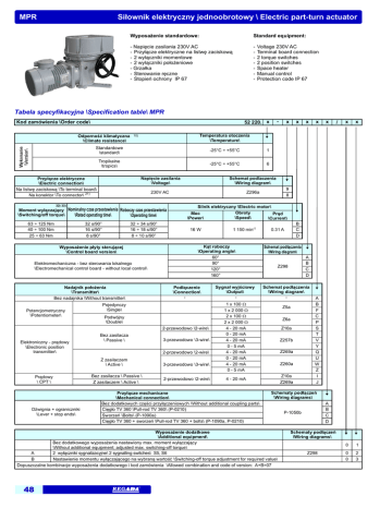 MPR Siłownik elektryczny jednoobrotowy \ Electric part-turn actuator Wyposażenie standardowe: Standard equipment: - Napięcie zasilania 230V AC - Przyłącze elektryczne na listwę zaciskową - 2 wyłączniki momentowe - 2 wyłączniki położeniowe - Grzałka - Sterowanie ręczne - Stopień ochrony IP 67 - Voltage 230V AC Terminal board connection 2 torque switches 2 position switches Space heater Manual control Protection code IP 67 Tabela specyfikacyjna \Specification table\ MPR Odporność klimatyczna \Climate resistance\ Standardowe \standard\ -25°C ÷ +55°C 1 Tropikalne \tropics\ -25°C ÷ +55°C 6 Napięcie zasilania \Voltage\ Schemat podlaczenia \Wiring diagram\ 230V AC Z296a 32) 33) Moment wyłączający Nominalny czas przestawienia Roboczy czas przestawienia \Switching/off torque\ \Rated operating time\ \Operating time\ 32 s/90° 16 s/90° 8 s/90° 32 ÷ 34 s/90° 16 ÷ 18 s/90° 8 ÷ 10 s/90° Wyposażenie płyty sterującej \Control board version\ Elektromechaniczna - bez sterowania lokalnego \Electromechanical control board - without local control\ Nadajnik położenia \Transmitter\ Bez nadajnika \Without transmitter\ Potencjometryczny \Potentiometer\ Dźwignia + ograniczniki \Lever + stop ends\ x x / x x 16 W Podwójny \Double\ 3-przewodowo \3-wire\ 2-przewodowo \2-wire\ 3-przewodowo \3-wire\ Bez zasilacza \ Passive \ Z zasilaczem \ Active \ 1 150 min-1 Kąt roboczy \Operating angle\ 60° 90° 120° 160° Pojedynczy \Single\ Bez zasilacza \ Passive \ 9 8 2-przewodowo \2-wire\ Sygnał wyjściowy \Output\ - Schemat podłączenia \Wiring diagram\ ® A B C D Z298 Schemat podłączenia \Wiring diagram\ - 1 x 100 1 x 2 000 2 x 100 2 x 2 000 4 - 20 mA 0 - 20 mA 4 - 20 mA 0 - 5 mA 4 - 20 mA 0 - 20 mA 4 - 20 mA 0 - 5 mA Z5a Z6a Z10a Z257b Z269a Z260a Z10a Z269a 4 - 20 mA Przyłącze mechaniczne \Mechanical connection\ Bez dodatkowych części przyłączeniowych \Without additional coupling parts\ Cięgło TV 360 \Pull-rod TV 360\ (P-0210) Sworzeń \Bolts\ (P-1090a) Cięgło TV 360 + sworzeń \Pull-rod TV 360 + bolts\ (P-1090a, P-0210) B C D 0.31 A A B F C P S T V Y Q U W Z I J Schematy podłączeń \Wiring diagrams\ Wyposażenie dodatkowe \Additional equipment\ Bez dodatkowego wyposażenia nastawiony max. moment wyłączający \Without additional equipment; adjusted max. switching-off torque\ A 2 wyłączniki sygnalizacyjne\ 2 sygnalling switches\ S5, S6 B Nastawienie momentu wyłączającego na wybraną wartość \Switching-off torque adjustment for required value\ Dopuszczalne kombinacje wyposażenia dodatkowego i kod zamówienia \Allowed combination and code of version: A+B=07 48 x Silnik elektryczny \Electric motor\ Obroty Prąd \Speed\ \Current\ Podłączenie \Connection\ - Z zasilaczem \ Active \ Prądowy \ CPT \ x Moc \Power\ 2-przewodowo \2-wire\ Elektroniczny - prądowy \Electronic position transmitter\ x Temperatura otoczenia \Temperature\ 10) Przyłącze elektryczne \Electric connection\ Na listwę zaciskową \To terminal board\ Na konektor \To connector\ 21) 63 ÷ 125 Nm 40 ÷ 100 Nm 25 ÷ 63 Nm - 52 220. x Kod zamówienia \Order code\ A B C D P-1050b Schematy podłączeń \Wiring diagrams\ Z298 0 1 0 0 2 3 MPR Siłownik elektryczny jednoobrotowy \ Electric part-turn actuator Uwagi: 10) Patrz "Środowisko robocze” na str. 2. 21) Schematy podłączeń są pokazane bez oznaczeń stosowanych w przyłączu konektorowym. Schematy te są dostępne na zapytanie. 32) Moment wyłączający należy podać w zamówieniu słownie. W innym przypadku ustawia się maksymalny moment z wybranego zakresu. Momentu nie można samodzielnie zmienić.. 33) Maksymalny moment obciążenia wynosi: - 0,8 wartości max. momentu wyłączającego w reżimie pracy S2-10 min, lub S4-25%, 6-90 cykli/h. - 0,6 wartości max. momentu wyłączającego w reżimie pracy S4-25%, 90 ÷ 1200 cykli/h. Notes: 10) See "Working enviroment" on page 2. 21) Wiring diagrams are not showing connector pin numbers. Complete diagram on request. 32) State the switch-off torque in your order. If not stated it is adjusted to the maximum value of the chosen range. 33) The maximum load torque equals the max. switching-off torque multiplied by: 0.8 for duty cycle S2-10 min, or S4-25%, 6 - 90 cycles per hour 0.6 for duty cycle S4-25%, 90 - 1200 cycles per hour Schematy podłączenia \Wiring diagrams\ MPR Przyłącze elektryczne: 2 na listwę zaciskową z 32 zaciskami o przekroju przewodów 2,5 mm przez 3 przepusty kablowe M25x1,5 dla średnicy przewodów 12,5 do 19 mm. Electric connection: 2 to terminal board with 32 clamps, wire cross section max. 2.5 mm via 3 cable glands M25x1.5 for cable diameter 12.5 to 19 mm. Uwagi: 1. Podłączenie jest limitowane ilością zacisków (32) na listwie siłownika 2. W siłownikach z przyłączem na listwę zaciskową zacisk 1/60 na schemacie podłączenia Z269a i Z260a jest wyprowadzony tylko na zacisk nr 1. 3. Zworę X3:6-X:7 i X3:2-X:8 pokazana na schemacie podłączenia Z296 w siłowniku z przyłączem na listwę zaciskową należy wykonać samemu. 4. Inne podłączenia elektryczne siłownika nie pokazane w katalogu możliwe po uzgodnieniu z producentem. Notes: 1. Wiring connection is limited by max. number of 32 terminals. 2. For the EA version with connection to the terminal board, the terminal 1/60 (the wiring diagrams Z269a and Z260a) is led out to the terminal No. 1. 3. For the EA version with connection to the terminal board, the actuator is not equipped with the jumper X3:6-X:7 and X3:2-X:8 (Z296) in manufacturing plant (it is necessary to connect it by customer). 4. Different wirings of actuators than shown in the catalogue are possible after agreement with producer. Legenda: Z5a...........podłączenie pojedynczego potencjometrycznego nadajnika położenia Z6a...........podłączenia podwójnego potencjometrycznego nadajnika położenia Z10a.........podłączenie elektronicznego lub pojemnościowego prądowego nadajnika położenia 2-przewodowo bez zasilacza Z257b.......podł