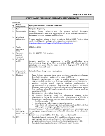 Załącznik nr 1 do SIWZ SPECYFIKACJA TECHNICZNA ZESTAWÓW KOMPUTEROWYCH komputer Nazwa Lp. komponentu 1. Typ 2. Zastosowanie 3. 4. 5. 6. 7. 8. Wydajność obliczeniowa Wymagane minimalne parametry techniczne Komputer stacjonarny Komputer będzie wykorzystywany dla potrzeb aplikacji biurowych, wyspecjalizowanych systemów wspomagających prace wydziałów/oddziałów , dostępu do Internetu oraz poczty elektronicznej Procesor powinien osiągać w teście wydajności SYSmark2007 Preview Rating wynik min. 173 punkty według wyników opublikowanych na stronie: http://www.bapco.com/support/fdrs/SYSmark2007web.html Pamięć operacyjna RAM Parametry pamięci masowej Wydajność grafiki 4GB (2x2048MB) Wyposażenie multimedialne Obudowa Karta dźwiękowa zintegrowana z płytą główną Min. 250 GB SATA, 7200 obr./min. komputer powinien być wyposażony w grafikę umożliwiającą pracę dwumonitorową (tryb pracy klon) posiadającą 256 MB własnej pamięci, posiadającą dwa porty VGA tj. jeden port DVI i drugi port DVI lub D-SUB, dopuszczalny niski profil karty − Typu desktop, małogabarytowa, suma wymiarów zewnętrznych obudowy (wysokość + szerokość + głębokość) nie więcej niż 840mm, − fabrycznie przystosowana do pracy w układzie pionowym i poziomym, nagrywarka DVD przystosowana do pracy w układzie pionowym i poziomym, − powinna posiadać czujnik otwarcia obudowy współpracujący z oprogramowaniem zarządzająco – diagnostycznym producenta komputera; Obudowa musi umożliwiać zastosowanie zabezpieczenia fizycznego w postaci linki metalowej (złącze blokady Kensingtona) oraz kłódki (oczko w obudowie do założenia kłódki) − Zasilacz o mocy odpowiedniej do zestawu − W obudowę komputera musi być wbudowany wizualny system diagnostyczny, służący do sygnalizowania i diagnozowania problemów z komputerem i jego komponentami; a w szczególności musi sygnalizować: Przebieg procedury POST Awarii procesora lub pamięci podręcznej procesora Uszkodzenia lub braku pamięci RAM, uszkodzenia złączy PCI, kontrolera Video, dysku twardego, płyty głównej, kontrolera USB 9. system Microsoft Windows 7 Professional PL 64-bitowy, zainstalowany system operacyjny operacyjny, nie wymagający aktywacji za pomocą telefonu lub Internetu w firmie Microsoft + pakiety biurowe nośnik. Zainstalowany Microsoft Office 2010 OEM Home and Business PL 10. BIOS - Funkcja blokowania wejścia do BIOS oraz blokowania startu systemu operacyjnego, (gwarantujący utrzymanie zapisanego hasła nawet w przypadku odłączenia wszystkich źródeł zasilania i podtrzymania BIOS) - Funkcja blokowania/odblokowania BOOT-owania stacji roboczej z - - - - 11. Certyfikaty standardy i − − − − − zewnętrznych urządzeń Możliwość polegająca na kontrolowaniu urządzeń wykorzystujących magistralę komunikacyjną PCI, bez uruchamiania systemu operacyjnego z dysku twardego komputera lub innych podłączonych do niego urządzeń zewnętrznych. Pod pojęciem kontroli Zamawiający rozumie funkcjonalność polegającą na blokowaniu/odblokowaniu slotów PCI. Możliwość, bez uruchamiania systemu operacyjnego z dysku twardego komputera lub innych, podłączonych do niego urządzeń zewnętrznych, ustawienia hasła na poziomie systemu, administratora oraz dysku twardego oraz możliwość ustawienia następujących zależności pomiędzy nimi: brak możliwości zmiany hasła pozwalającego na uruchomienie systemu bez podania hasła administratora. Możliwość włączenia/wyłączenia zintegrowanej karty dźwiękowej, karty sieciowej, portu równoległego, portu szeregowego z poziomu BIOS, bez uruchamiania systemu operacyjnego z dysku twardego komputera lub innych, podłączonych do niego, urządzeń zewnętrznych. Możliwość ustawienia portów USB w trybie „no BOOT”, czyli podczas startu komputer nie wykrywa urządzeń bootujących typu USB, natomiast po uruchomieniu systemu operacyjnego porty USB są aktywne. Możliwość wyłączania portów USB w tym: wszystkich portów, tylko portów znajdujących się na przodzie obudowy. Certyfikat ISO9001 dla producenta komputera (załączyć do oferty dokument potwierdzający spełnianie wymogu) Oferowane modele komputerów muszą posiadać certyfikat Microsoft, potwierdzający poprawną współpracę oferowanych modeli komputerów z systemem operacyjnym Windows 7 (załączyć do protokołu odbioru wydruk ze strony Microsoft WHCL) Deklaracja zgodności CE (załączyć do protokołu odbioru) oznaczenie na obudowie komputera Potwierdzenie spełnienia kryteriów środowiskowych, w tym zgodności z dyrektywą RoHS Unii Europejskiej o eliminacji substancji niebezpiecznych w postaci oświadczenia producenta komputera (wg wytycznych Krajowej Agencji Poszanowania Energii S.A., zawartych w dokumencie „Opracowanie propozycji kryteriów środowiskowych dla produktów zużywających energię możliwych do wykorzystania przy formułowaniu specyfikacji na potrzeby zamówień publicznych”, pkt. 3.4.2.1; dokument z grudnia 2006), w szczególności zgodności z normą ISO 1043-4 dla płyty głównej oraz elementów wykonanych z tworzyw sztucznych o masie powyżej 25 gram (załączyć do oferty dokument potwierdzający spełnianie wymogu) Komputer musi spełniać wymogi normy Energy Star 5.0 Wymagany wpis dotyczący oferowanego komputera w internetowym katalogu http://www.eu-energystar.org lub http://www.energystar.gov – (załączyć do protokołu odbioru - dopuszcza się wydruk ze strony internetowej) 12. Ergonomia Głośność jednostki centralnej mierzona zgodnie z normą ISO 7779 oraz wykazana zgodnie z normą ISO 9296 w pozycji obserwatora w trybie jałowym (IDLE) wynosząca maksymalnie 26 dB (załączyć do oferty oświadczenie producenta) 13. Warunki gwarancji - 3-letnia gwarancja producenta (załączyć do protokołu odbioru oświadczenie producenta) świadczona na miejscu u klienta - Czas naprawy - do dwóch dni roboczych - Firma serwisująca musi posiadać