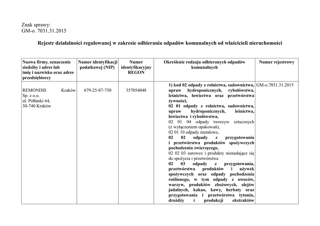 Znak sprawy: GM-o. 7031.31.2015 Rejestr działalności regulowanej w zakresie odbierania odpadów komunalnych od właścicieli nieruchomości Nazwa firmy, oznaczenie Numer identyfikacji Numer siedziby i adres lub podatkowej (NIP) identyfikacyjny imię i nazwisko oraz adres REGON przedsiębiorcy REMONDIS Sp. z o.o. ul. Półłanki 64, 30-740 Kraków Kraków 679-25-87-750 357054048 Określenie rodzaju odbieranych odpadów komunalnych Numer rejestrowy 1) kod 02 odpady z rolnictwa, sadownictwa, GM-o.7031.31.2015 upraw hydroponicznych, rybołówstwa, leśnictwa, łowiectwa oraz przetwórstwa żywności, 02 01 odpady z rolnictwa, sadownictwa, upraw hydroponicznych, leśnictwa, łowiectwa i rybołówstwa, 02 01 04 odpady tworzyw sztucznych (z wyłączeniem opakowań), 02 01 10 odpady metalowe, 02 02 odpady z przygotowania i przetwórstwa produktów spożywczych pochodzenia zwierzęcego, 02 02 03 surowce i produkty nienadające się do spożycia i przetwórstwa 02 03 odpady z przygotowania, przetwórstwa produktów i używek spożywczych oraz odpady pochodzenia roślinnego, w tym odpady z owoców, warzyw, produktów zbożowych, olejów jadalnych, kakao, kawy, herbaty oraz przygotowania i przetwórstwa tytoniu, drożdży i produkcji ekstraktów drożdżowych, przygotowania i fermentacji melasy (z wyłączeniem 02 07), 02 03 02 odpady konserwantów, 02 03 04 surowce i produkty nie nadające się do spożycia i przetwórstwa, 02 05 odpady z przemysłu mleczarskiego, 02 05 01 surowce i produkty nieprzydatne do spożycia oraz przetwarzania, 02 06 odpady z przemysłu piekarniczego i cukierniczego, 02 06 01 surowce i produkty nieprzydatne do spożycia i przetwórstwa, 02 06 02 odpady konserwantów, 02 07 odpady z produkcji napojów alkoholowych i bezalkoholowych (z wyłączeniem kawy, herbaty i kakao), 02 07 04 surowce i produkty nie przydatne do spożycia i przetwórstwa, 2) kod 03 odpady z przetwórstwa drewna oraz z produkcji płyt i mebli, masy celulozowej, papieru i tektury, 03 01 odpady z przetwórstwa drewna oraz z produkcji płyt i mebli, 03 01 01 odpady kory i korka, 03 01 05 trociny, wióry, ścinki, drewno, płyta wiórowa i fornier inne niż wymienione w 03 01 04, 03 03 odpady z produkcji oraz z przetwórstwa masy celulozowej, papieru i tektury, 03 03 01 odpady z kory i drewna, 03 03 07 mechaniczne wydzielone odrzuty z przeróbki makulatury i tektury, 03 03 08 odpady z sortowania papieru i tektury przeznaczone do recyklingu, 3) kod 04 odpady z przemysłu skórzanego, futrzanego i tekstylnego, 04 02 odpady z przemysłu tekstylnego, 04 02 21 odpady z nieprzetworzonych włókien tekstylnych, 04 02 22 odpady z przetworzonych włókien tekstylnych, 4) kod 07 odpady z produkcji, przygotowania, obrotu i stosowania produktów przemysłu chemii organicznej, 07 02 odpady z produkcji, przygotowania, obrotu i stosowania tworzyw sztucznych oraz kauczuku i włókien syntetycznych, 07 02 80 odpady z przemysłu gumowego i produkcji gumy, 07 05 odpady z produkcji, przygotowania, obrotu i stosowania farmaceutyków, 07 05 14 odpady stałe inne niż wymienione w 07 05 13, 07 06 odpady z produkcji, przygotowania, obrotu i stosowania tłuszczów, natłustek, mydeł, detergentów, środków dezynfekujących i kosmetyków, 07 06 81 zwroty kosmetyków i próbek, 5) kod 08 odpady z produkcji, przygotowania, obrotu i stosowania powłok ochronnych (farb, lakierów, emalii ceramicznych), kitu, klejów, szczeliw i farb drukarskich, 08 03 odpady z produkcji, przygotowania, obrotu i stosowania farb drukarskich, 08 03 18 odpadowy toner drukarski inny niż wymieniony w 08 03 17, 6) kod 15 odpady opakowaniowe; sorbenty, tkaniny do wycierania, materiały filtracyjne i ubrania ochronne nieujęte w innych grupach, 15 01 odpady opakowaniowe (włącznie z selektywnie gromadzonymi komunalnymi odpadami opakowaniowymi), 15 01 01 opakowania z papieru i tektury, 15 01 02 opakowania z tworzyw sztucznych, 15 01 03 opakowania z drewna, 15 01 04 opakowania z metali, 15 01 05 opakowania wielomateriałowe, 15 01 06 zmieszane odpady opakowaniowe, 15 01 07 opakowania ze szkła, 15 01 09 opakowania z tekstyliów, 15 02 sorbenty, materiały filtracyjne, tkaniny do wycierania i ubrania ochronne, 15 02 03 sorbenty, materiały filtracyjne, tkaniny do wycierania (np. szmaty, ścierki) i ubrania ochronne inne niż wymienione w 15 02 02, 7) kod 16 odpady nieujęte w innych grupach, 16 01 zużyte lub nienadające się do użytkowania pojazdy (włączając maszyny pozadrogowe), odpady z demontażu, przeglądu i konserwacji pojazdów ( z wyłączeniem grup 13 i 14 oraz podgrup 16 06 i 16 08), 16 01 03 zużyte opony, 16 01 06 zużyte lub nie nadające się do użytkowania pojazdy nie zawierające cieczy i innych niebezpiecznych elementów, 16 01 12 okładziny hamulcowe inne niż wymienione w 16 01 11, 16 01 17 metale żelazne, 16 01 18 metale nieżelazne, 16 01 19 tworzywa sztuczne, 16 01 20 szkło, 16 01 22 inne nie wymienione elementy, 16 01 99 inne nie wymienione odpady, 16 02 odpady urządzeń elektrycznych i elektronicznych, 16 02 14 zużyte urządzenia inne niż wymienione w 16 02 09 do 16 02 13, 16 02 16 elementy usunięte z zużytych urządzeń inne niż wymienione w 16 02 15, 16 03 partie produktów nieodpowiadające wymaganiom oraz produkty przeterminowane lub nieprzydatne do użytku, 16 03 80 produkty spożywcze przeterminowane lub nieprzydatne do spożycia, 16 80 odpady różne, 16 80 01 magnetyczne i optyczne nośniki informacji, 8). kod 17 odpady z budowy, remontów i demontażu obiektów budowlanych oraz infrastruktury drogowej (włączając glebę i ziemię z terenów zanieczyszczonych), 17 01 odpady materiałów i elementów budowlanych oraz infrastruktury drogowej (np. beton, cegły, płytki, ceramika), 17 01 01 odpady betonu oraz gruz betonowy z rozbiórek i remontów, 17 01 02 gruz ceglany, 17 01 03 odpady innych materiałów ceramicznych i elementów wyposażenia, 17 01 07 zmieszane odpady z betonu, gruz ceglany, odpadowych materiał