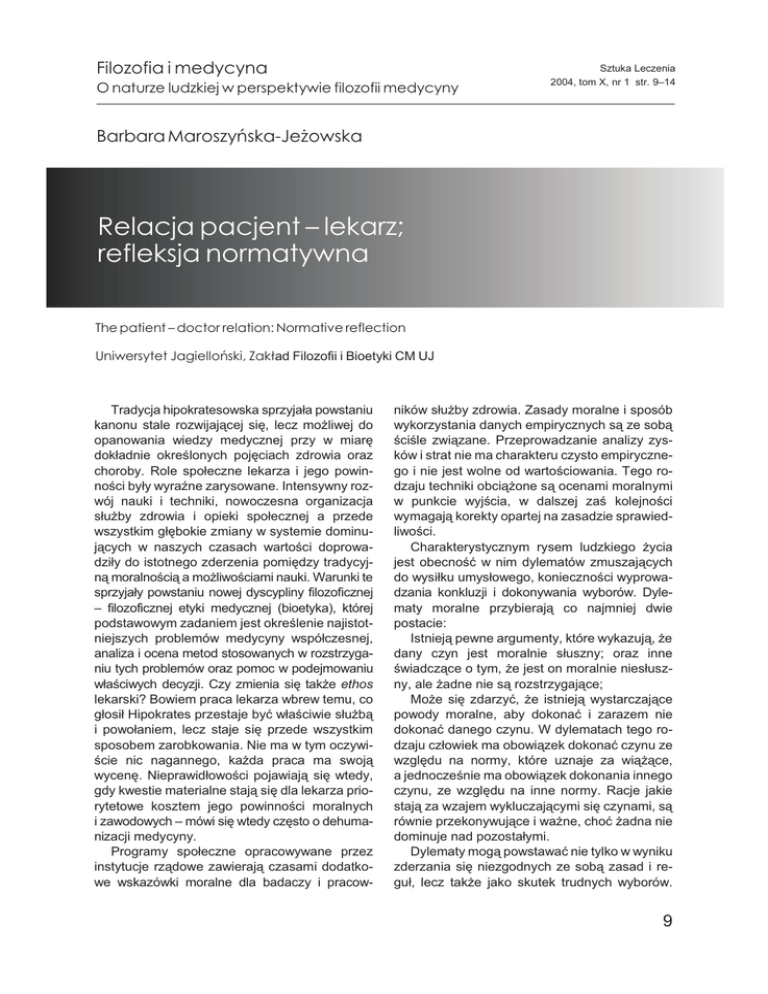 Filozofia i medycyna O naturze ludzkiej w perspektywie filozofii medycyny Sztuka Leczenia 2004, tom X, nr 1 str. 9–14 Barbara Maroszyñska-Je¿owska Relacja pacjent – lekarz; refleksja normatywna The patient – doctor relation: Normative reflection Uniwersytet Jagielloñski, Zak³ad Filozofii i Bioetyki CM UJ Tradycja hipokratesowska sprzyja³a powstaniu kanonu stale rozwijaj¹cej siê, lecz mo¿liwej do opanowania wiedzy medycznej przy w miarê dok³adnie okreœlonych pojêciach zdrowia oraz choroby. Role spo³eczne lekarza i jego powinnoœci by³y wyraŸne zarysowane. Intensywny rozwój nauki i techniki, nowoczesna organizacja s³u¿by zdrowia i opieki spo³ecznej a przede wszystkim g³êbokie zmiany w systemie dominuj¹cych w naszych czasach wartoœci doprowadzi³y do istotnego zderzenia pomiêdzy tradycyjn¹ moralnoœci¹ a mo¿liwoœciami nauki. Warunki te sprzyja³y powstaniu nowej dyscypliny filozoficznej – filozoficznej etyki medycznej (bioetyka), której podstawowym zadaniem jest okreœlenie najistotniejszych problemów medycyny wspó³czesnej, analiza i ocena metod stosowanych w rozstrzyganiu tych problemów oraz pomoc w podejmowaniu w³aœciwych decyzji. Czy zmienia siê tak¿e ethos lekarski? Bowiem praca lekarza wbrew temu, co g³osi³ Hipokrates przestaje byæ w³aœciwie s³u¿b¹ i powo³aniem, lecz staje siê przede wszystkim sposobem zarobkowania. Nie ma w tym oczywiœcie nic nagannego, ka¿da praca ma swoj¹ wycenê. Nieprawid³owoœci pojawiaj¹ siê wtedy, gdy kwestie materialne staj¹ siê dla lekarza priorytetowe kosztem jego powinnoœci moralnych i zawodowych – mówi siê wtedy czêsto o dehumanizacji medycyny. Programy spo³eczne opracowywane przez instytucje rz¹dowe zawieraj¹ czasami dodatkowe wskazówki moralne dla badaczy i pracow- ników s³u¿by zdrowia. Zasady moralne i sposób wykorzystania danych empirycznych s¹ ze sob¹ œciœle zwi¹zane. Przeprowadzanie analizy zysków i strat nie ma charakteru czysto empirycznego i nie jest wolne od wartoœciowania. Tego rodzaju techniki obci¹¿one s¹ ocenami moralnymi w punkcie wyjœcia, w dalszej zaœ kolejnoœci wymagaj¹ korekty opartej na zasadzie sprawiedliwoœci. Charakterystycznym rysem ludzkiego ¿ycia jest obecnoœæ w nim dylematów zmuszaj¹cych do wysi³ku umys³owego, koniecznoœci wyprowadzania konkluzji i dokonywania wyborów. Dylematy moralne przybieraj¹ co najmniej dwie postacie: Istniej¹ pewne argumenty, które wykazuj¹, ¿e dany czyn jest moralnie s³uszny; oraz inne œwiadcz¹ce o tym, ¿e jest on moralnie nies³uszny, ale ¿adne nie s¹ rozstrzygaj¹ce; Mo¿e siê zdarzyæ, ¿e istniej¹ wystarczaj¹ce powody moralne, aby dokonaæ i zarazem nie dokonaæ danego czynu. W dylematach tego rodzaju cz³owiek ma obowi¹zek dokonaæ czynu ze wzglêdu na normy, które uznaje za wi¹¿¹ce, a jednoczeœnie ma obowi¹zek dokonania innego czynu, ze wzglêdu na inne normy. Racje jakie staj¹ za wzajem wykluczaj¹cymi siê czynami, s¹ równie przekonywuj¹ce i wa¿ne, choæ ¿adna nie dominuje nad pozosta³ymi. Dylematy mog¹ powstawaæ nie tylko w wyniku zderzania siê niezgodnych ze sob¹ zasad i regu³, lecz tak¿e jako skutek trudnych wyborów. 9 Relacja pacjent-lekarz; relacja normatywna Bez wzglêdu na to, jaki wariant postêpowania wybieramy, jakiœ inny obowi¹zek zostaje naruszony – który nie przestaje na nas ci¹¿yæ w sytuacji bezkonfliktowej. Konflikt miêdzy obowi¹zkami moralnymi a interesem w³asnym rodzi czêsto dylematy praktyczne ale nie moralne. Jeœli racje moralne walcz¹ o pierwszeñstwo z racjami pozamoralnymi, pojawia siê trudne pytanie, o to, które z nich wybraæ? Nawet jeœli wybór nie ma wagi dylematu. Uwa¿a siê czasem, ¿e istnieje wiele rodzajów dylematów praktycznych, lecz nigdy moralnych, bowiem myœl o sprzecznych obowi¹zkach jest niespójna logicznie – jedyna powinnoœæ, to powinnoœæ wynikaj¹ca z powiêkszania najwy¿szej wartoœci1. Niemniej jednak konflikt taki przeradza siê w dylemat, gdy nie jest mo¿liwe odwo³anie siê do najwy¿szej zasady, pozwalaj¹ce na wybranie najwy¿szej powinnoœci. Pojawia siê wówczas potrzeba moralnego uzasadnienia, jak mówi³ John Devey „refleksja zaczyna siê z wyobra¿eniem sobie mo¿liwych linii postêpowania”2. Wybór wi¹¿e siê uznaniem jednej z nich jako moralnie uzasadnionej. Celem jest wykazanie, ¿e ¿ywione przekonanie albo podejmowane dzia³anie wspiera na wystarczaj¹cych racjach. Problemem jest odró¿nienie wartoœci racji s¹du moralnego od jego konkluzywnoœci. Czym innym bêdzie w konsekwencji uzasadnienie wartoœciowe ale niekonkluzywne (wystarczaj¹ce do uzasadnienia), a czym innym uzasadnienie wartoœciowe i konkluzywne. Czêsto wspiera siê to rozumowanie tak¿e postulatem zgodnoœci z sumieniem. Sumienie jako cnota zatwierdzaj¹ca wymóg dok³adnego rozpoznania w³asnych przekonañ, do którego podstaw¹ powinny byæ zewnêtrzne normy moralne oraz znajomoœæ faktów sk³adaj¹cych siê na sytuacjê, w której przysz³o dzia³aæ. Dopiero po spe³nieniu tych warunków mo¿na orzec, ¿e dzia³anie zgodne z sumieniem jest uzasadnione. Z grubsza bior¹c cz³owiek postêpuje zgodnie z sumieniem, jeœli stara siê ustaliæ co jest s³uszne i zamierza to czyniæ, a zarazem wk³ada w to dzia³anie odpowiedni wysi³ek i jest do niego odpowiednio motywowany3. Cnota zgodnoœci z sumieniem wyra¿a – jak siê czêsto podkreœla – te same treœci co etyka kantowska, chocia¿ obecna jest tak¿e w utylitaryzmie, gdzie sumienie jest wyrazem sta³ego i powa¿nego zaanga¿owania siê w przestrzeganie zasady u¿ytecznoœci. We wszystkich prawie teoriach etycznych sumienie pomaga w ostro¿nym interpretowaniu sytuacji moralnej, w uszczegó³owianiu norm – które powinno siê przestrzegaæ, wybieraniu z dwóch niezgodnych norm – przewa¿aj¹cej, przeciwdzia³aniu wypadkom naruszania norm oraz minimalizowaniu okazji do ich ³amania. Reasumuj¹c: kiedy napotykamy na powa¿ne konflikty sumienia