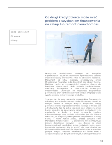Co drugi kredytobiorca może mieć problem z uzyskaniem finansowania na zakup lub remont nieruchomości 10:01 2016-12-29 CIJ Journal Přílohy: Drastyczne zmniejszenie dostępu do kredytów hipotecznych – to jeden ze skutków wprowadzenia ustawy implementującej Dyrektywę MCD w obecnym kształcie. Dokument od kilku miesięcy procesowany przez Ministerstwo Finansów, lada dzień trafi pod obrady Sejmu. Niektóre zapisy w rzeczywistości ograniczą dostęp do kredytów hipotecznych około połowie kredytobiorców, uderzając szczególnie w mieszkańców mniejszych miejscowości. Likwidując im możliwość bezpłatnego porównania ofert konkurencyjnych banków, zwiększą także ryzyko wyboru niekorzystnego produktu. Szacuje się, że przy wsparciu pośredników finansowych udzielany jest obecnie co drugi kredyt hipoteczny. Model, w którym klienci w jednym miejscu, bezpłatnie, mogą porównać oferty większości banków, istnieje w Polsce już od kilkunastu lat. W dobie redukcji sieci własnych przez banki, doradcy są znaczącym kanałem dystrybucji tych produktów w kraju. – Koszt uzyskania kredytu mieszkaniowego przy udziale pośrednika jest dla klienta taki sam, jak w sytuacji skorzystania bezpośrednio z usług banku – mówi Adrian Jarosz, prezes Związku Firm Doradztwa Finansowego. – U pośrednika klient otrzymuje jednak dodatkowe korzyści – ma dostęp do ofert konkurencyjnych względem siebie instytucji, które może bezpłatnie porównać. Aby to zrobić, nie musi chodzić po kilkunastu oddziałach banków. U pośrednika jest w stanie w jednym miejscu uzyskać informacje na temat ofert i zawęzić negocjacje do tych wybranych, najkorzystniejszych 1/2 w danym momencie na rynku. źródło: Związek Firm Doradztwa Finansowego 2/2