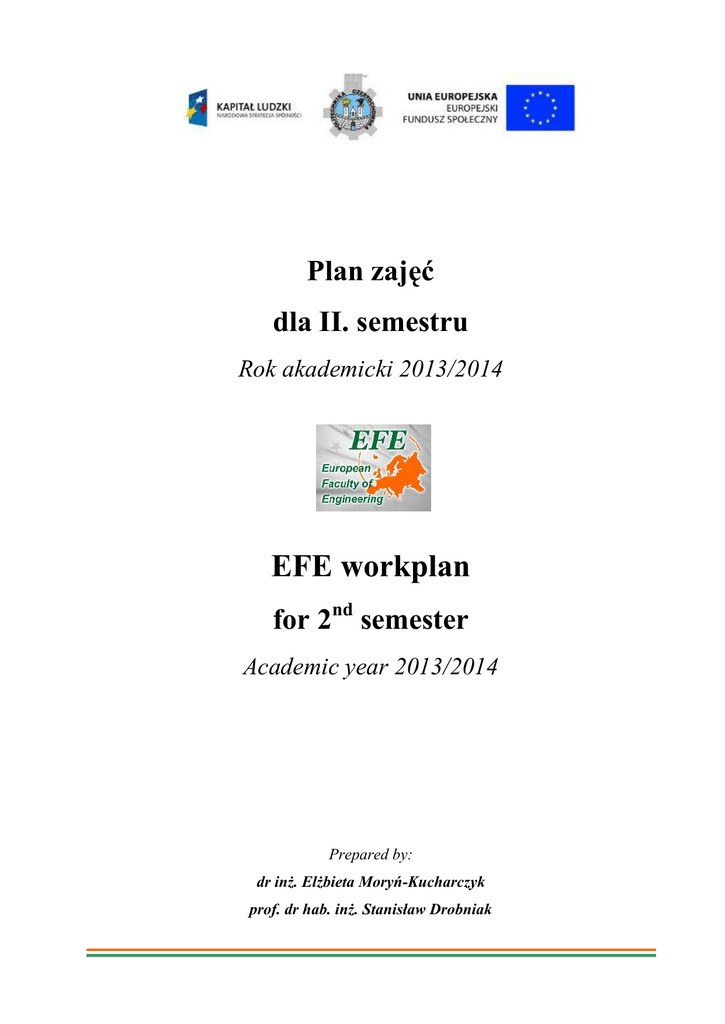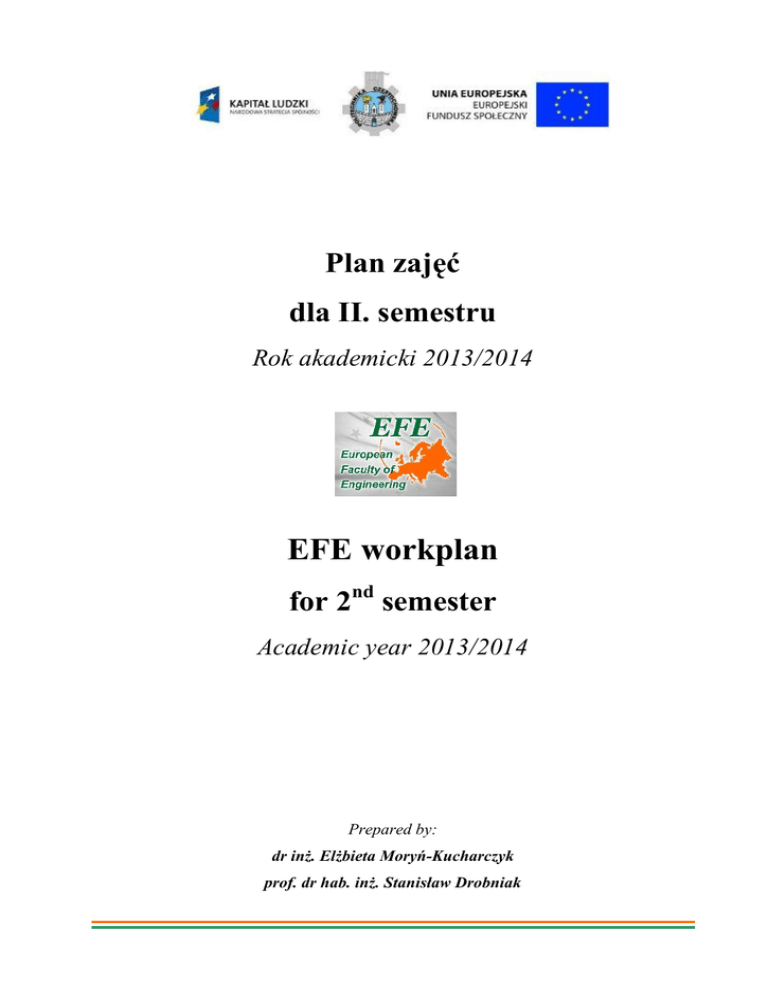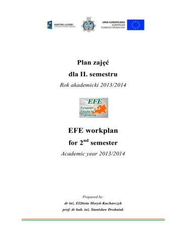 Plan zajęć dla II. semestru Rok akademicki 2013/2014 EFE workplan for 2nd semester Academic year 2013/2014 Prepared by: dr inż. Elżbieta Moryń-Kucharczyk prof. dr hab. inż. Stanisław Drobniak Przedmioty i wykładowcy Subjects and Lecturers 1. Matematyka II (Mathematics II), (45w, 30ćw)Z [6 ECTS] Dr hab. inż. M.Klimek, prof. PCz Dr inż. A.Ciekot 2. Język angielski (Communication skills), (60ćw)Z [2 ECTS] Mgr Z.Sobańska Mgr T.Gałkowski 3. Konstrukcja i eksploatacja maszyn oraz grafika inżynierska II – projektowanie inżynierskie - informatyczne podstawy projektowania (Engineering Design II - CAD), (15w, 45l)E [5 ECTS] Dr inż. P.Waryś Dr inż. D.Cekus 4. Biologia, ekologia i ochrona środowiska I (Biology, Ecology and Environmental Protection I), (15w, 15ćw, 30l)Z [4 ECTS] Dr M.Zabochnicka-Świątek Mgr inż. M.Próba 5. Fizyka techniczna – Mechanika techniczna z wytrzymałością materiałów II (Engineering Physics-Mechanics II), (30w, 25ćw, 5l)E [5 ECTS] Dr hab. inż. J.Przybylski, prof. PCz Dr inż. K.Sokół 6. Fizyka techniczna – Podstawowe prawa elektrodynamiki i magnetyzmu (Engineering Physics-Electromagnetism), (30w, 15ćw)Z [3 ECTS] Prof. dr hab. inż. Z.Piątek 7. Fizyka techniczna – Optyka falowa i wybrane zagadnienia fizyki współczesnej (Engineering Physics-Wave Optics and Contemporary Physics), (30w, 15l)E [4 ECTS] Dr hab. P.Pawlik, prof. PCz 8. Wychowanie fizyczne (Sports), (30ćw)Z [1 ECTS] Uwaga: na zajęcia z WF należy zapisywać się indywidualnie w pierwszym tygodniu semestru letniego w Studium Wychowania Fizycznego i Sportu mieszczącym się w Klubie Politechnik. Notice: for sports please sign in individually in the first week of summer semester in the Sports Unit in “Politechnik” Club. 2 Plan zajęć – Lecture Timetable – 2nd semester semestr II, rok akademicki 2013/2014 Hour Monday Tuesday godz. poniedziałek wtorek 8-9 9-10 10-11 11-12 Mathematics II (Lecture) room A11 Dr hab. inż. M.Klimek, prof. PCz 14-15 15-16 Thursday środa czwartek Engineering PhysicsMechanics II Biology, (Tutorials+Labor Engineering Ecology and atory) Design II – Environmental CWM/ A11 CAD Protection I (Lecture+Labora (Lecture+Tutoria Dr inż. K.Sokół tory) ls) Communication room 171 room D2 Communication skills Dr inż. P.Waryś Dr skills (Tutorials) Dr inż. D.Cekus M.Zabochnicka(Tutorials) SJO Świątek SJO Mgr Mgr Z.Sobańska T.Gałkowski 12-13 13-14 Wednesday Biology, Ecology and Environmental Protection I (Laboratory) room L5 Mgr inż. M.Próba Engineering PhysicsMechanics II (Lecture) room A11 Dr hab. inż. J.Przybylski, prof. PCz Engineering Physics-Wave Optics and Contemporary Physics (Lecture) room A11 Dr hab. P.Pawlik, prof. PCz Engineering Physics-Wave Optics and Contemporary Physics (Laboratory – every 2nd week 2 hours) room 121 Dr hab. P.Pawlik, prof. PCz Friday piątek Mathematics II (Tutorials) room A11 Dr inż. A.Ciekot Engineering PhysicsElectromagneti sm (Lecture+Tutoria ls) L24 Prof. dr hab. inż. Z.Piątek 16-17 + Wychowanie fizyczne (Sports) - 2 hours every week Sale (lecture halls): A11, D2, 171 WIMiI (ul. Dąbrowskiego 73) L5, L24 WIŚiB – Instytut Inżynierii Środowiska (ul. Brzeźnicka 60A) SJO Studium Języków Obcych (ul. Dąbrowskiego 69) CWM Centrum Współpracy Międzynarodowej (ul. Dąbrowskiego 69) 121 WIPiTM (ul. Armii Krajowej 19) 3 Prowadzący zajęcia z przedmiotu (Lecturer): Matematyka I (Mathematics I) Dr hab. inż. Małgorzata Klimek, prof. PCz [email protected] Wydział Inżynierii Mechanicznej i Informatyki Instytut Matematyki al. Armii Krajowej 21 42-201 Częstochowa Zainteresowania naukowe prof. Małgorzaty Klimek obejmują własności równań konstruowanych w niestandardowych rachunkach różniczkowych – w tym w analizie na przestrzeniach dyskretnych, nieprzemiennych oraz w analizie operatorów niecałkowitego rzędu. Obok opracowania metod rozwiązywania tych nowych klas równań bada także prawa zachowania i zastosowania analizy niecałkowitego rzędu w modelowaniu matematycznym. Wykłada matematykę, analizę matematyczną i metody operatorowe. Od kilkunastu lat recenzuje prace z fizyki matematycznej i matematyki dla wielu czasopism m.in. dla Journal of Mathematical Physics, Journal of Physics A, Nonlinear Dynamics, Computers and Mathematics with Applications. Od 2013 r. prof. Małgorzata Klimek pełni funkcję Prodziekana ds. nauczania Wydziału Inżynierii Mechanicznej I Informatyki. Dr inż. Anita Ciekot Instytut Matematyki, WIMiI al. Armii Krajowej 21, pokój: 337 42-201 Częstochowa tel.: (0-34) 3250-355 Prowadzący zajęcia z przedmiotu: Język angielski (English) Mgr Zofia Sobańska [email protected] Studium Języków Obcych Ul. Dąbrowskiego 69 42-200 Częstochowa tel. 034 32 50 569 Ms Zofia Sobańska is Deputy Head of the Foreign Languages Centre. She obtained her MA in English Philology at the University of Lodz. After graduation, she taught English at a number of schools, and before coming to CUT she worked as a teacher of English and ESP lecturer at the College for Foreign Languages in Czestochowa. Since 1992 she has been a senior lecturer of English at the Foreign Languages Department of CUT, where she gives classes in both General English, Business English and ESP. Her specialism is Methodology of the English Language Teaching and she is a co-author of the articles in the field. Her professional interests are focused on cultural awareness in foreign 4 language teaching, which was reflected in her Postgraduate Thesis entitled “The Use of Film Reviews for Developing Intercultural Awareness through Reading and Writing”. She organizes a series of conferences which explore issues concerning the methodology of the English language teaching. She is an active member of the International Association of Teachers of English as a Foreign Language- IATEFL-Poland. Mgr Marian Gałkowski [email protected] Studium Języków Obcych Ul. Dąbrowskiego 69 42-200 Częstochowa tel. 034 32 50 377 Mari