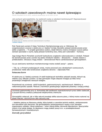 O szkołach zawodowych można nawet śpiewająco Marek Kozubal 20-03-2012, ostatnia aktualizacja 20-03-2012 22:58 Jak zachęcić gimnazjalistów, by wybierali naukę w szkołach technicznych? Zaprezentować konkretny zawód. Martyna o geologii nawet zaśpiewała autor: Krzysztof Skłodowski źródło: Fotorzepa W szkole przy ul. Saskiej uczniowie zaprezentowali 14 profesji +zobacz więcej Piotr Panek jest uczniem II klasy Technikum Mechatronicznego przy ul. Wiśniowej. Na zorganizowanym wczoraj w szkole przy ul. Saskiej Turnieju Zawodów pokazał skonstruowane przez siebie urządzenie. – To projekt generatora wodoru, dzięki któremu można zmniejszyć zużycie paliwa. Zamiast opowiadać o czymś, lepiej pokazać konkretną rzecz, którą sam wykonałem – tłumaczy. Jego kolega Marcin Floriański uruchomił hydrauliczne urządzenie wykorzystywane w windach. Pokazał też skonstruowane przez uczniów tej szkoły miniaturki robotów – dinozaurów. – Zostały złożone z prefabrykatów. Dinozaury mogą chodzić – demonstrował Marcin zainteresowanym gimnazjalistom. Czy po ukończeniu technikum mechatronicznego można znaleźć pracę? – pytano. – Tak, np. w firmach produkujących windy, można pracować przy obrabiarkach numerycznych, produkować meble albo konstruować urządzenia obronne – odpowiada Piotr. Sztuczna krew W szkole przy ul. Saskiej uczniowie 14 szkół kształcących techników pokazali zawody, których się właśnie uczą. Kilkuset uczniów z II klas gimnazjów mogło obejrzeć trwające po kilka minut prezentacje umiejętności starszych kolegów. Prezentowali się uczniowie szkół fryzjerskich, gastronomicznych, mechanicznych. Niektórzy w niekonwencjonalny sposób. Martyna z technikum geodezyjnego zaśpiewała piosenkę o swojej profesji. Uczniowie gastronomika przy ul. Komorskiej dali spróbować wyprodukowanych przez siebie ciasteczek, a przyszli technicy analitycy pokazywali eksperymenty chemiczne. Gimnazjaliści zobaczyli, jak w kilka sekund powstaje obfita sztywna piana, z której można wykonać np. ptasie mleczko, sztuczną krew albo sztuczną colę. – Jesteśmy jedyną na Mazowszu szkołą, która kształci w zawodzie technik analityk, zainteresowanie tym kierunkiem jest olbrzymie. Dla gimnazjalistów zainteresowanych nauką w tym zawodzie organizujemy wykłady i lekcje pokazowe – mówi Jolanta Bińka, kierownik laboratorium. Nauczycielka chemii w tej szkole dodaje, że absolwenci mogą znaleźć pracę m.in. w przedsiębiorstwach farmaceutycznych i kosmetycznych. Zawody przyszłości – Na targach edukacyjnych uczeń może dostać ulotkę do ręki, tutaj może zobaczyć, czym w przyszłości może się zajmować. I ma rok na podjęcie decyzji o tym, jak kształtować swoją drogę zawodową – tłumaczy ideę Turnieju Zawodów Marek Kupiecki, dyrektor Zespołu Szkół przy ul. Saskiej. – Promujemy szkolnictwo zawodowe, bo takie jest zapotrzebowanie rynku pracy. Pracodawcy chcą zatrudniać osoby, które posiadają konkretny zawód i umiejętności – tłumaczy też Barbara Drewnowska z miejskiego Biura Edukacji. Od kilku lat liczba uczniów zainteresowanych nauką w szkołach zawodowych wzrasta. W poprzednim roku najbardziej oblegane były technikum mechatroniczne przy Wiśniowej, fototechniczne przy Spokojnej oraz gastronomiczne przy Poznańskiej. Dużą popularnością cieszą się też szkoły fryzjerskie, kosmetyczne i kształcące mechaników samochodowych. Zdaniem stołecznych doradców zawodowych za kilka lat będzie większe zapotrzebowanie na informatyków, elektrotechników, osoby z branży turystycznej, gastronomicznej i hotelarskiej czy budowlanki. Praca będzie też dla osób zajmujących się usługami osobistymi i medycznymi, np. kształtowaniem postaw prozdrowotnych i opieką nad osobami starszymi. Życie Warszawy