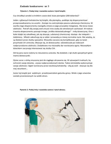 Zadanie konkursowe nr 3 Pytanie 1. Podaj imię i nazwisko autora i tytuł książki. Czy chciałbyś zarobić w krótkim czasie dość duże pieniądze (200 dolarów)? Jeden z głównych bohaterów tej książki, dla pieniędzy, poddaje się eksperymentowi przeprowadzanemu na uczelni. Zostaje mu wstrzyknięta pewna substancja chemiczna. W wyniku tego eksperymentu nastąpiły zmiany w jego przysadce mózgowej . Ma teraz nowe zdolności. Potrafi siłą swojej woli zmusić inne osoby do określonych zachowań. W trakcie trwania eksperymentu poznaje innego „królika doświadczalnego” - miłą dziewczynę. Ona z kolei dzięki tej szkodliwej, jak się okazuje, substancji chemicznej- dostaje dar telepatii i telekinezy. Młodzi zakochują się w sobie i prowadzą w miarę normalne życie. Nie wiedzą, że są śledzeni przez służby specjalne. Wszystko zaczyna się komplikować, gdy na świat przychodzi ich córeczka. Okazuje się, że dziewczynka odziedziczyła po rodzicach nadprzyrodzone zdolności. Dodatkowo ma niezwykły dar wzniecania ognia. Niezwykłym dzieckiem zaczynają interesować się służby CIA. Od tej pory życie rodziny to nieustanna ucieczka. Na dodatek z rąk służb specjalnych ginie mama dziewczynki. Ojciec wraz z córką zmuszony jest do ciągłego ukrywania się. W sytuacjach trudnych, by ochronić swoje dziecko, używa nadprzyrodzonych darów. Także ośmiolatka wykorzystuje swoje zdolności. Ogień wzniecany przez tytułową bohaterkę - siłą jej woli- okazuje się dla niej ratunkiem… Autor tej książki jest wybitnym przedstawicielem gatunku grozy. Wiele z jego utworów zostało przeniesionych na wielki ekran. Pytanie 2. Podaj imię i nazwisko autora i tytuł obrazu.