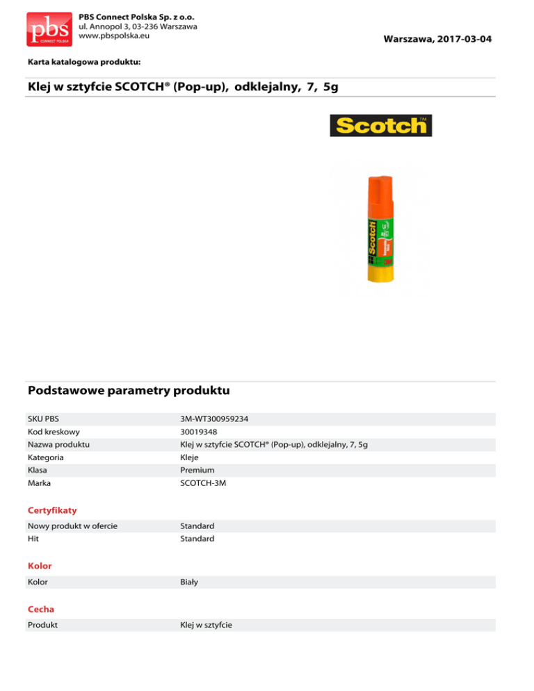 PBS Connect Polska Sp. z o.o. ul. Annopol 3, 03-236 Warszawa www.pbspolska.eu Karta katalogowa produktu: Klej w sztyfcie SCOTCH® (Pop-up), odklejalny, 7, 5g Podstawowe parametry produktu SKU PBS 3M-WT300959234 Kod kreskowy 30019348 Nazwa produktu Klej w sztyfcie SCOTCH® (Pop-up), odklejalny, 7, 5g Kategoria Kleje Klasa Premium Marka SCOTCH-3M Certyfikaty Nowy produkt w ofercie Standard Hit Standard Kolor Kolor Biały Cecha Produkt Klej w sztyfcie Warszawa, 2017-03-04 PBS Connect Polska Sp. z o.o. ul. Annopol 3, 03-236 Warszawa www.pbspolska.eu Karta katalogowa produktu cd. Klej w sztyfcie SCOTCH® (Pop-up), odklejalny, 7, 5g Podstawowe parametry produktu Typ Standard W ofercie od 2014-02 Wymiary Rozmiar 7,5g Zamiennik Zamiennik 3M-FS910052786 Wspólny słownik zamówień CPV 24910000-6 Jednostki logistyczne Opakowanie 1 12 szt Opakowanie 2 144 szt Warszawa, 2017-03-04