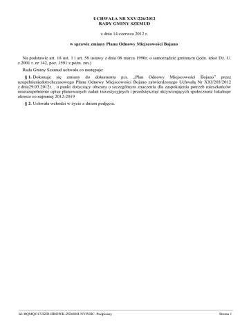 UCHWAŁA NR XXV/226/2012 RADY GMINY SZEMUD z dnia 14 czerwca 2012 r. w sprawie zmiany Planu Odnowy Miejscowości Bojano Na podstawie art. 18 ust. 1 i art. 58 ustawy z dnia 08 marca 1990r. o samorządzie gminnym (jedn. tekst Dz. U. z 2001 r. nr 142, poz. 1591 z późn. zm.) Rada Gminy Szemud uchwala co następuje: § 1. Dokonuje się zmiany do dokumentu p.n. „Plan Odnowy Miejscowości Bojano” przez uzupełnieniedotychczasowego Planu Odnowy Miejscowości Bojano zatwierdzonego Uchwałą Nr XXI/203/2012 z dnia29.03.2012r. . o punkt dotyczący obszaru o szczególnym znaczeniu dla zaspokojenia potrzeb mieszkańców orazuzupełnienie opisu planowanych zadań inwestycyjnych i przedsięwzięć aktywizujących społeczność lokalnąw okresie co najmniej 2012-2019 § 2. Uchwała wchodzi w życie z dniem podjęcia. ————————————————————————————————————————————————————————— Id: RQMQJ-CUIZD-HBOWK-ZSMOH-NYWHC. Podpisany Strona 1 Załącznik do Uchwały Nr XXV/226/2012 Rady Gminy Szemud z dnia 14 czerwca 2012 roku PLAN ODNOWY MIEJSCOWOŚCI BOJANO BOJANO CZERWIEC 2012 Spis treści ————————————————————————————————————————————————————————— Id: RQMQJ-CUIZD-HBOWK-ZSMOH-NYWHC. Podpisany Strona 2 1.Wstęp 2. Cel opracowania i przedmiot opracowania 3.Analiza zasobów miejscowości a)środowisko przyrodnicze b)środowisko kulturowe c)dziedzictwo historyczne i religijne d) obiekty i tereny e) gospodarka, rolnictwo f)sąsiedzi, przyjezdni g)instytucje h)ludzie, organizacje społeczne 4. Obszar o szczególnym znaczeniu 5. Analiza SWOT 6. Wizja rozwoju miejscowości Bojano 7. Opis planowanych zadań inwestycyjnych i przedsięwzięć aktywizujących społeczność lokalną w okresie co najmniej 7 lat od dnia przyjęcia planu odnowy miejscowości 8. Odniesienie do dokumentów strategicznych Gminy Szemud 1.Wstęp Plan Odnowy Miejscowości jest dokumentem o charakterze planowania strategicznego. Stanowi on niezbędny załącznik do wniosków o dofinansowanie ze środków Unii Europejskiej (m. in.: Program Rozwoju Obszarów Wiejskich na lata 2007-2013, Regionalny Program Operacyjny Województwa Pomorskiego 2007-2013) inwestycji wpływających na rozwój wsi i wspierających społeczności lokalne. Plan Odnowy Miejscowości Bojano zawiera charakterystykę wsi i jej zasobów, diagnozę aktualnej sytuacji, analizę SWOT, wizję rozwoju, cele oraz konieczne do wykonania zadania inwestycyjne. Dokument powstał przy udziale mieszkańców wsi, a jego zapisy zaakceptowane zostały na Zebraniu Wiejskim. Zapisy Planu Odnowy Miejscowości Bojano są spójne z dokumentami strategicznymi wyższego rzędu. 2. Cel opracowania i przedmiot opracowania ————————————————————————————————————————————————————————— Id: RQMQJ-CUIZD-HBOWK-ZSMOH-NYWHC. Podpisany Strona 3 analiza korzystnych i niekorzystnych cech wewnętrznych sołectwa, oraz potencjalnych szans i zagrożeń występujących w otoczeniu, które mogą mieć wpływ na przyszłość sołectwa i mieszkańców, wizja rozwoju wsi, priorytety rozwojowe, cele i projekty. Sołectwo musi dysponować Planem Rozwoju Wsi w celu wykorzystania w pełni istniejącego potencjału i szans rozwojowych, w tym dostępu do środków pomocowych i funduszy centralnych( harmonogram działań może ulegać zmianom). 3. ANALIZA ZASOBÓW MIEJSCOWOŚCI BOJANO. W analizie zasobów bierzemy pod uwagę następujące rodzaje zasobów: środowisko przyrodnicze, środowisko kulturowe, dziedzictwo religijne i historyczne, obiekty i tereny, gospodarka, rolnictwo, sąsiedzi i przyjezdni, instytucje, ludzie, organizacje społeczne. a) Środowisko przyrodnicze Większość obszarów sołectwa to tereny rolnicze przekształcone w działki budowlane pod budownictwo jednorodzinne i usługowe. Około 20 % stanowią lasy mieszane wchodzące częściowo w skład otuliny Trójmiejskiego Parku Krajobrazowego, częściowo zaś stanowią własność prywatną. Charakterystyczne jest tu występowanie licznych zagajników sosnowych z unikalnymi enklawami sosny czarnej. W otulinie parku krajobrazowego wyznaczony jest ciekawy krajobrazowo ze względu na rzeźbę terenu i przyrodniczo „Szlak Czarny” z charakterystycznymi torfowiskami i trzęsawiskami ze stanowiskami reliktowych roślin jak np. pło mszarne czy unikalne gatunki storczyka. Ma tu swoje stanowisko lęgowe cietrzew. Sołectwo leży w obszarze źródliskowym rzeki Kaczej mającej swe ujście bezpośrednio do Zatoki Gdańskiej. Rzeka wypływa z mokradeł rozpościerających się na wys. 150-190 m npm. Na terenie sołectwa znajduje się też wiele drobnych zbiorników wodnych, mokradeł i torfowisk będących siedliskiem różnorodnego ptactwa wodnego jak np. bocian czarny czy perkoz szmaragdowy oraz unikalnych lobeliowych leśnych oczek wodnych. Charakterystyczna dla naszego sołectwa jest różnorodna rzeźba terenu oraz położenie w otulinie Trójmiejskiego Parku Krajobrazowego. W Bojanie w styczniu 2003 roku z inicjatywy dyrekcji TPK został utworzony użytek ekologiczny „ Wielka kolonia lęgowa mewy śmieszki” tzw. Rezerwat mewy śmieszki w Bojanie. Teren sołectwa obfituje także w liczne stałe stanowiska lęgowe Żurawia. b) Środowisko kulturowe Na terenie sołectwa w miejscu zwanym Głodowo znajdują się obiekty o wartości historycznej i zabytkowej: - cmentarz żołnierzy radzieckich z pomnikiem, na którym co roku odbywa się uroczysta msza św. z udziałem konsula Rosji. - stanowisko archiwalne grobów skrzynkowych , w którym znaleziono 2 popielnice z czasów osadnictwa kultury Łużyckie ( prywatna posesja p. Herman ). - liczne przydrożne kapliczki i krzyże wyznaczające niegdyś drogę wędrowcom. - zabytkowy b