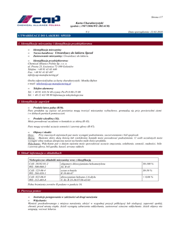 Strona 1/7 Karta Charakterystyki zgodnie z 1907/2006/WE (REACH) V-1 Data sporządzenia: 22.02.2010 UTWARDZACZ DO LAKIERU SPEED 1. Identyfikacja mieszaniny i identyfikacja przedsiębiorstwa • • • Identyfikacja mieszaniny Nazwa handlowa: Utwardzacz do lakieru Speed Zastosowanie mieszaniny: Utwardzacz do lakieru. • Identyfikacja przedsiębiorstwa: Chemical Alliance Polska Sp. z o. o. ul. Prosta 23, Łozienica 72-100 Goleniów Telefon: +48 91 41 65 440 Fax: +48 91 41 65 487 [email protected] Osoba odpowiedzialna za kartę charakterystyki: Monika Bęben e-mail: [email protected] • Telefon alarmowy Tel. + 48 91 416 54 40 czynny Pn-Pt 8:00-15:00 Tel. + 48 12 411 99 99 Informacja toksykologiczna 2. Identyfikacja zagrożeń • Produkt łatwo palny (R10). Pary produktu są cięższe od powietrza mogą tworzyć mieszaniny wybuchowe, gromadzą się przy powierzchni ziemi i w dolnych partiach pomieszczeń. • Produkt szkodliwy (Xi). Może powodować uczulenie w kontakcie ze skórą (R 43). Pary mogą wywołać uczucie senności i zawroty głowy (R 67). • Objawy i skutki: Oczy: Przy znacznych stężeniach par może wystąpić podrażnienie, zaczerwienienie i ból spojówek. Skóra: Skażenie skóry dużą ilością lub wielokrotny kontakt może powodować podrażnienie. U osób uczulonych może wystąpić silna reakcja alergiczna nawet na bardzo małe ilości produktu. Wdychanie: Wdychanie par o dużym stężeniu może spowodować uczucie zmęczenia, osłabienie, senność, nudności, bóle i zawroty głowy, ból gardła, kaszel, urwany oddech. 3. Skład/ informacja o składnikach Niebezpieczne składniki mieszaniny wraz z klasyfikacją CAS: 28182-81-2 WE: 500-060-2 CAS: 123-86-4 WE: 204-658-1 CAS: 822-06-0 WE: 212-485-8 oligomery diizocyjanianu heksametylenu Xi; R 43 octan n-butylu R 10-66-67 diizocyjanian heksano-1,6-diylu T, Xi; R 23-36/37/38-42/43 50-100 % 30-50 % < 0,06 % Pełne brzmienia zwrotów R podano w punkcie 16. 4. Pierwsza pomoc • Instrukcje postępowania w zależności od drogi narażenia Wdychanie: Wynieść poszkodowanego z miejsca narażenia, ułożyć w wygodnej pozycji półleżącej lub siedzącej, zapewnić spokój, chronić przed utratą ciepła. Jeżeli wystąpią zaburzenia oddychania, zastosować sztuczne oddychanie. Jeżeli objawy nie ustępują, wezwać lekarza. • Strona 2/7 Karta Charakterystyki zgodnie z 1907/2006/WE (REACH) V-1 Data sporządzenia: 22.02.2010 UTWARDZACZ DO LAKIERU SPEED • Kontakt z oczami: Natychmiast płukać dużą ilością letniej wody, najlepiej bieżącej, przez co najmniej 15 min. Usunąć szkła kontaktowe. Unikać silnego strumienia wody ze względu na ryzyko mechanicznego uszkodzenia rogówki. Jeżeli podrażnienie nie ustępuje, należy skonsultować się z lekarzem-okulistą. • Kontakt ze skórą: Natychmiast zdjąć zanieczyszczoną odzież; skażoną skórę dokładnie zmywać wodą. Jeżeli wystąpią jakiekolwiek podrażnienia, skontaktować się z lekarzem. • Połknięcie: Jeżeli nastąpi połknięcie, nie prowokować wymiotów. Jeżeli poszkodowany jest przytomny, przepłukać jamę ustną i podać dużą ilość wody do wypicia. Zapewnić pomoc lekarską. • Ogólne zalecenia: Powinny być przestrzegane zwykłe środki ostrożności jak przy pracy z chemikaliami. Jeżeli wystąpią jakiekolwiek niepokojące objawy, wezwać lekarza. • Wskazówki dla lekarza: Stosować leczenie objawowe. 5. Postępowanie w przypadku pożaru Zawiadomić otoczenie o pożarze; usunąć z obszaru zagrożonego wszystkie osoby nie biorące udziału w akcji. W razie potrzeby zarządzić ewakuację. Wezwać Straż Pożarną i Policję. • Zalecane środki gaśnicze: Piana, dwutlenek węgla lub proszki gaśnicze. Pojemniki narażone na działanie ognia chłodzić z bezpiecznej odległości rozproszonym strumieniem wody (niebezpieczeństwo wybuchu); o ile to możliwe, usunąć je z terenu zagrożonego. • Zabronione środki gaśnicze: Zwarty strumień wody • Niebezpieczne produkty rozkładu: Podczas pożaru mogą powstawać tlenki węgla (CO, CO 2), opary izocyjanianów, tlenki azotu (NOx). • Specjalistyczny sprzęt przeciw pożarowy: Odzież gazoszczelna w wersji antyelektrostatycznej, izolujący sprzęt ochrony układu oddechowego. Nie dopuścić do przedostania się środków gaszących do wód gruntowych i powierzchniowych. Środki gaśnicze zbierać osobno, nie wylewać do kanalizacji. • Inne informacje: Środki gaśnicze zbierać osobno, nie wlewać do kanalizacji. Ewentualne wycieki zasypać substancją adsorpcyjną (sorbentem), piaskiem lub ziemią. 6. Postępowanie w przypadku niezamierzonego uwolnienia do środowiska • Zagrożenia dla zdrowia i środki ochrony ludzi: Środki ostrożności: Zapewnić odpowiednią wentylację. Nakładać odzież ochronną i rękawice. Nie wdychać oparów. Zabezpieczyć studzienki ściekowe. Unikać bezpośredniego kontaktu z preparatem. Pary rozcieńczyć rozproszonym strumieniem wody. Nie pić, nie jeść i nie palić w trakcie używania.. • Zagrożenia dla środowiska i środki ochrony środowiska: Zabezpieczyć przed wprowadzeniem do miejskiego systemu wodno – kanalizacyjnego, cieków wodnych i wód gruntowych. • Metody unieszkodliwiania, zbierania i oczyszczania środowiska: Usunąć osoby niezabezpieczone z zagrożonego obszaru. Zabezpieczyć studzienki ściekowe. Unikać bezpośredniego kontaktu z produktem. Unikać wdychania par. Uszkodzone opakowanie umieścić w opakowaniu zastępczym. Małe ilości zaabsorbować w chemicznie obojętny materiał wiążący (piasek, ziemia okrzemkowa), przenieść do szczelnie zamykanych pojemników przekazać do utylizacji. Zanieczyszczoną powierzchnię spłukać wodą. 7. Postępowanie z mieszaniną i jej magazynowanie • Postępowanie z preparatem - środki ostrożności: Stosować tylko w dobrze wentylowanych pomieszczeniach z wentylacją wywiewną. Trzymać z daleka od źródeł wysokiej temperatury i źródeł zapłonu. Wskazane j