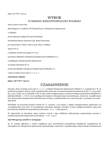 Sygn. akt VII U 740/15 WYROK W IMIENIU RZECZYPOSPOLITEJ POLSKIEJ Dnia 9 marca 2016 roku Sąd Okręgowy w Lublinie VII Wydział Pracy i Ubezpieczeń Społecznych w składzie: Przewodniczący Sędzia SO Jacek Chaciński Protokolant Starszy Sekretarz sąd. Beata Pełczyńska po rozpoznaniu w dniu 1 marca 2016 roku w Lublinie sprawy M. D. z udziałem zainteresowanego D. D. (1) przeciwko Zakładowi Ubezpieczeń Społecznych oddziałowi w L. o podleganie ubezpieczeniom społecznym na skutek odwołania M. D. od decyzji Zakładu Ubezpieczeń Społecznych Oddziału w L. z dnia 24 lutego 2015 roku nr (...)- (...) odwołanie oddala. Sygn. akt VII U 740/15 UZASADNIENIE Decyzją z dnia 24 lutego 2015 roku nr (...)- (...) Zakład Ubezpieczeń Społecznych Oddział w L. Inspektorat w B. na podstawie przepisów ustawy z dnia 13 października 1998 roku o systemie ubezpieczeń społecznych (Dz. U. z 2013 roku, poz. 1442, z późn. zm.) stwierdził, że M. D. jako osoba współpracująca z osobą prowadzącą pozarolniczą działalność u płatnika składek (...) D. D. (1) nie podlega obowiązkowo ubezpieczeniom emerytalnemu, rentowym, wypadkowemu oraz dobrowolnie ubezpieczeniu chorobowemu od dnia 10 października 2014 roku (decyzja z 24 lutego 2015 roku akta ZUS). Odwołanie od powyższej decyzji wniosła M. D. wnosząc o jej zmianę i objęcie ubezpieczeniem społecznym od 10 października 2014 roku. W uzasadnieniu odwołania skarżąca wskazała, iż była współpracownikiem męża przy prowadzeniu działalności gospodarczej (odwołanie – k. 2 – 7 akta sprawy). W odpowiedzi na odwołanie organ rentowy wnosił o jego oddalenie podtrzymując argumentację zawartą w zaskarżonej decyzji (odpowiedź na odwołanie – k. 8 – 9 a.s.). Sąd Okręgowy ustalił co następuje : M. D. została zgłoszona z tytułu współpracy przy prowadzeniu pozarolniczej działalności gospodarczej do obowiązkowych ubezpieczeń społecznych (emerytalnego, rentowych i wypadkowego), dobrowolnego ubezpieczenia chorobowego oraz ubezpieczenia zdrowotnego od 10 października 2014 roku. Skarżąca od dnia 12 stycznia 2015 roku przebywa na długotrwałym zwolnieniu lekarskim związanym z ciążą (uzasadnienie decyzji z 24 lutego 2015 roku akta ZUS). W dokumencie rozliczeniowym ZUS RCA za miesiąc październik 2014 roku płatnik wykazał za skarżącą podwyższoną w stosunku do urzędowej podstawę wymiaru składek na ubezpieczenia społeczne w kwocie 6646,13 zł, za miesiące listopad i grudzień 2014 roku w kwocie 9365,00 zł miesięcznie, w miesiącu styczniu 2015 roku w kwocie 3512,02 zł (uzasadnienie decyzji z 24 lutego 2015 roku - akta ZUS). Wobec powyższego Zakład Ubezpieczeń Społecznych Oddział w L. Inspektorat w B. pismem z dnia 26 stycznia 2015 roku wezwał płatnika składek (...) D. D. (1) do przedłożenia dokumentacji umożliwiającej ustalenie współpracy M. D. przy prowadzeniu pozarolniczej działalności gospodarczej, o czym ubezpieczona została również poinformowana (uzasadnienie decyzji z 24 lutego 2015 roku - akta ZUS). W odpowiedzi na powyższe, oświadczeniem z dnia 30 stycznia 2015 roku płatnik wskazał, iż M. D. podjęła współpracę w październiku 2014 roku z uwagi na uruchomienie sklepu zewnętrznego internetowego (uzasadnienie decyzji z 24 lutego 2015 roku - akta ZUS). W tym stanie rzeczy wydana została zaskarżona decyzja z dnia 24 lutego 2015 roku. W celu dokonania niezbędnych ustaleń Sąd dopuścił dowody z dokumentów znajdujących się w aktach sprawy i aktach ZUS oraz dowody osobowe w postaci zeznań skarżącej M. D. (protokół – k. 31 v. – 32 v. oraz a.s.), zainteresowanego D. D. (1) (protokół – k. 32 v. – 33 a.s oraz a.s.) oraz zeznań świadków: R. D. (protokół – k. 33 a.s.), E. M. (protokół – k. 33 – 33 v. a.s.), T. M. (protokół – k. 33 v. a.s.) i P. T. (protokół – k. 33 v. – 34 a.s.). M. D. jest z wykształcenia nauczycielką. Zawodowo pracowała do 2009 roku. Po tej dacie skarżąca zajmowała się domem oraz wychowaniem dzieci, nigdzie nie pracowała i nie prowadziła żadnej działalności gospodarczej (zeznania wnioskodawczyni – k. 31 v. – 32 v. a.s.). Mąż wnioskodawczyni rozpoczął prowadzenie działalności gospodarczej od 2010 roku. Działalność ta polegała na sprzedaży części rowerowych przez internet. Początkowo sprzedaż odbywała się wyłącznie za pośrednictwem portalu (...)W październiku 2014 roku mąż ubezpieczonej otworzył sklep internetowy pod nazwą B. (zeznania wnioskodawczyni – k. 31 v. – 32 v. a.s., zeznania zainteresowanego – k. 32 v. – 33 a.s., zeznania świadka R. D. – k. 33 a.s., zeznania świadka T. M. – k. 33 v. a.s.). M. D. pomagała mężowi przy prowadzeniu działalności gospodarczej w ten sposób, że zajmowała się sprawami związanymi z wysyłką towaru. Zajmowała się ważeniem, pakowaniem i dostarczaniem paczek na pocztę. Ponadto po paczki przyjeżdżał również kurier. Kwestiami finansowymi i rozliczeniowymi zajmował się mąż wnioskodawczyni. Po zakończonej aukcji internetowej, program komputerowy automatycznie wystawiał ponownie ofertę (zeznania wnioskodawczyni – k. 31 v. – 32 v. a.s., zeznania zainteresowanego – k. 32 v. – 33 a.s., zeznania świadka R. D. – k. 33 a.s., zeznania świadka A. M. – k. 33 – 33 v. a.s., zeznania świadka T. M. – k. 33 v. a.s., zeznania świadka P. T. – k. 33 v. – 34 a.s.). M. D. w dniu 16 września 2014 roku posiadała informację o fakcie zajścia przez nią w ciążę, zaś w październiku 2014 roku posiadała informację, iż jest to ciąża bliźniacza. Wnioskodawczyni zaczęła pomagać mężowi przy prowadzeniu działalności gospodarczej będąc w około 4 tygodniu ciąży (zeznania wnioskodawczyni – k. 31 v. – 32 v. a.s., dokumentacja medyczna – k. 105 – 111 a.s.). Wnioskodawczyni w okresie od 4 grudnia 2014 roku do 9 grudnia 2014 roku była leczona w (...) na oddziale (...). M. D. została pr