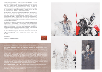 Jakże wielu ma Polska wspaniałych bohaterów, wielkich patriotów: królów, rycerzy, polityków, żołnierzy. Ludzi odważnych, walecznych, niezłomnych, kierujących się miłością do ojczyzny i do pięknych wartości przechowywanych w polskim narodzie od pokoleń. Gotowych zawsze poświęcić swoje życie dla obrony kraju, dla wolności swoich rodaków, dla prawdy o polskiej historii. Bez nich nie byłoby nas tutaj. Pamięć o nich to nasze trwanie. Wystawa Pawła Jaszczuka to hołd wybitnym Polakom – NIEZŁOMNYM. Lista ich nazwisk jest tak długa, że trudno ją wyczerpać, tak więc autor portretów zmuszony dokonać pewnego wyboru, chciał zainspirować wszystkich, do tworzenia takich list, do ich uzupełniania, do sięgnięcia w głąb naszej historii, do jej ciemnych, wyklętych kart – to bardzo pouczająca lekcja i chciałoby się, aby była obowiązkową w naszych polskich szkołach. Wybrani przez Pawła Jaszczuka NIEZŁOMNI stanowią pewne ogniwo tradycji walki o niepodległość. Cykl portretów pokazuje ciągłość tej tradycji na przestrzeni pokoleń: od insurekcji kościuszkowskiej, przez powstanie listopadowe, styczniowe, przez powstanie warszawskie, oraz walkę zbrojnego podziemia niepodległościowego. To autentyczne świadectwo tego,co najświętsze dla narodu polskiego. Siła NIEZŁOMNYCH nie gaśnie. Przebija się do nas dziś z tragicznych mogił. Woła o prawdę. Woła o Polskę i oskarża tych co ją z serc wyrzucili. Pamiętajmy! Chwała i cześć bohaterom gen. Kazimierz Pułaski (1745 -1779) marszałek konfederacji barskiej. gen. Tadeusz Kościuszko (1746 - 1817) Naczelnik Narodowej Siły Zbrojnej insurekcji kościuszkowskiej. Wykształcenie zdobył początkowo w szkole u pijarów, a następnie ukończył Szkołę Rycerską. Jego opiekun – Adam Kazimierz Czartoryski – sprawił, że był stypendystą królewskim w Paryżu. W 1775 roku wziął udział w walkach o niepodległość Stanów Zjednoczonych, podczas której uzyskał stopień generała brygady. W 1784 roku powrócił do kraju i osiał w rodzinnym majątku. Podczas wojny polskorosyjskiej w 1792 roku odznaczył się w walkach armii koronnej. Wybrany na przywódcę powstania ogłosił jego wybuch 24 marca 1794 roku, obejmując funkcję Najwyższego Naczelnika Sił Zbrojnych Narodowych. Odniósł zwycięstwo pod Racławicami, wydał uniwersał połaniecki, znosząc poddaństwo osobiste chłopów. Poniósł klęskę pod Szczekocinami, latem 1794 roku skutecznie bronił ufortyfikowanej Warszawy. W klęsce pod Maciejowicami został ranny i dostał się do niewoli. Uwolniony w 1796 roku przez cara Piotra I wyjechał do Ameryki by w 1798 przyjechać do Paryża. Uczestniczył w tworzeniu Legionów Polskich we Włoszech oraz powstaniu Legii Naddunajskiej. Odmówił współpracy zarówno Napoleonowi, jak i carowi Aleksandrowi I. Jego zwłoki spoczęły na Wawelu. gen. Józef Poniatowski (1763 - 1817) Wódz Naczelny Wojsk Polskich Księstwa Warszawskiego. gen. Ignacy Prądzyński (1792 - 1850) kwatermistrz generalny Sztabu Głównego i dowódca korpusu inżynierów w czasie powstania listopadowego. kpr. Mieczysław Monsior (zm. 1919) Żołnierz 5. kompanii 6 p.p. legionów polskich. Antoni Petrykiewicz (1746 - 1817) Był uczniem drugiej klasy gimnazjum lwowskiego. Od początków listopada 1918 brał udział w ciężkich walkach o Lwów z Ukraińcami. Walczył w oddziale „Straceńców” późniejszego generała Romana Abrahama. Został ciężko ranny broniąc „Reduty Śmierci” („Góry Stracenia”) na Persenkówce. Zmarł w szpitalu na Politechnice Lwowskiej 16 stycznia 1919. Generał Roman Abraham napisał o nim: „(...) W walce był nieustępliwy…” Naczelnik Józef Piłsudski nadał mu pośmiertnie Krzyż Srebrny Orderu Virtuti Militari. Pozostaje on do dzisiaj najmłodszym kawalerem tego orderu. Antoni Petrykiewicz został pochowany w katakumbach na Cmentarzu Obrońców Lwowa. płk. pilot Adam Zaleski (1886 - 1926) W czasie wojny polsko - bolszewickiej dowódca lotnictwa obrony Warszawy. Pieśń o Ziemi naszej (fragment) Wincenty Pol A czy znasz ty, bracie młody, Twoje ziemie, twoje wody? Z czego słyną, kędy giną, W jakim kraju i Dunaju? A czy znasz ty, bracie młody, Twojej ziemi bujne płody? Twe kurhany i mogiły, I twe dzieje, co się śćmiły? A czy wiesz ty, co w nich leży? O, nie zawsze, o, nie wszędzie, Młody orle, tak ci będzie, Jako dzisiaj przy macierzy! Trzeba będzie ważyć, służyć, Milczeć, cierpieć i wojować! I niejedno miłe zburzyć, A inaczej odbudować... Kto tam zgadnie, gdzie osiędziesz, Jaką wodą w świat popłyniesz, W której stronie walczyć będziesz I od czyjej broni zginiesz?... O Antosiu Petrykiewiczu Henryk Zbierzchowski W pamięci ten żołnierz mały, Który ocalił Lwów. Dla Polski chwały: Czapka większa od głowy, Pod którą widać włos płowy. A na obszernym mundurze Jak ze starszego brata Na łacie łata, Dziura na dziurze. Na proces moskiewski Kazimierz Wierzyński Oskarżajcie nas wszystkich, nie tylko szesnastu, Sądźcie poległych w grobie, to też winowajcy, Sądźcie szkielet, co z wojny pozostał się miastu, Gdy wyście jeszcze z diabłem kumali się, zdrajcy. Oskarżcie także wolność, nic znane wam słowo, Ten odwieczny zabobon, co zawsze nas dzieli, Cały kraj polski weźcie, zamknijcie go w celi I wprowadźcie pod sztykiem na salę sądową. I choć wyrok spiszecie w ciemnicach swych na dnie By w kremlińskiej go potem ujawnić asyście, Jeszcze ten, kto jest wolny, bez trudu odgadnie, Że zbrodniarzem w tej sali nic my, ale wyście. My przyjmiemy wasz werdykt. Nie zdoła was zawieść Polska pamięć i długie pokoleń wspomnienia, Bo cokolwiek się stanie, jak świat się pozmienia, Niezmienna wasza przemoc i gwałt i nienawiść. Lecz kto wolny, a myśli, że z oczu odpędzi Upiora waszych jaskiń, bagienny wasz opar, Błądzi, bo moskiewskiego świat uląkł się sędzi, Wolnych w walce opuścił, ciemięzcę