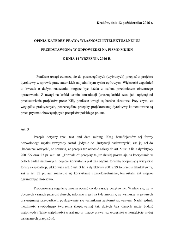 Kraków, dnia 12 października 2016 r. OPINIA KATEDRY PRAWA WŁASNOŚCI INTELEKTUALNEJ UJ PRZEDSTAWIONA W ODPOWIEDZI NA PISMO MKIDN Z DNIA 14 WRZEŚNIA 2016 R. Poniższe uwagi odnoszą się do poszczególnych (wybranych) przepisów projektu dyrektywy w sprawie praw autorskich na jednolitym rynku cyfrowym. Większość zagadnień to kwestie o dużym znaczeniu, mogące być każda z osobna przedmiotem obszernego opracowania. Z uwagi na krótki termin konsultacji (zresztą krótki czas, jaki upłynął od przedstawienia projektów przez KE), poniższe uwagi są bardzo skrótowe. Przy czym, ze względów praktycznych, poszczególne przepisy projektowanej dyrektywy komentowane są przez pryzmat obowiązujących przepisów polskiego pr. aut. Art. 3 Przepis dotyczy tzw. text and data mining. Krąg beneficjentów tej formy dozwolonego użytku zawężony został jedynie do „instytucji badawczych”, zaś jej cel do „badań naukowych”, co sprawia, że przepis ten odnosić należy do art. 5 ust. 3 lit. a dyrektywy 2001/29 oraz 27 pr. aut. art. „Formalnie” przepisy te już dzisiaj pozwalają na korzystanie w celach badań naukowych; pojęcie korzystania jest zaś ogólną formułą obejmującą wszystkie formy eksploatacji, jakkolwiek art. 5 ust. 3 lit. a dyrektywy 20012/29 to przepis fakultatywny, zaś w art. 27 pr. aut. różnicuje się korzystanie i zwielokrotnianie, ten ostatni akt niejako ograniczając ilościowo. Proponowaną regulację można ocenić co do zasady pozytywnie. Wydaje się, że w obecnych czasach przyrost danych, informacji jest na tyle znaczny, że wymusza w pewnych przynajmniej przypadkach posługiwanie się technikami zautomatyzowanymi. Nadal jednak możliwość swobodnego tworzenia (kopiowania) tak dużych baz danych może budzić wątpliwości (takie wątpliwości wyrażano w nauce prawa już wcześniej w kontekście wyżej wskazanych przepisów). Art. 4 Przepis ten dotyczy głównie e-learningu. Należy odnieść go do niedawno wprowadzonego do pr. aut. ust. 2 w art. 27. Proponowaną regulację ocenić należy co do zasady pozytywnie – niewątpliwie konieczne jest wyraźne przesądzenie, czy taka forma dozwolonego użytku dydaktycznego jest dozwolona. Wątpliwości może budzić możliwość wyłączenia tego wyjątku przewidziana w ust. 2 projektowanego przepisu (argument podniesiony już przez Centrum Cyfrowe Projekt: Polska). Wydaje się, że dostatecznym zabezpieczeniem interesów uprawnionych jest możliwość godziwej rekompensaty z ust. 4 projektowanej regulacji i stąd brak konieczności wprowadzania możliwości wyłączenia tego wyjątku. Problemów interpretacyjnych przysparzać może natomiast ograniczenie zakresu tego wyjątku do celów niekomercyjnych przy jednoczesnym posłużeniu się niezdefiniowanym pojęciem placówki edukacyjnej – taka redakcja przepisu prowokuje do pytania o możliwość skorzystania z niego przez różnego rodzaju instytucje szkolnictwa prywatnego, co do zasady nastawione na osiągnięcie zysku. Ani sam projektowany przepis, ani odpowiednie motywy preambuły, nie pozwalają na udzielenie jednoznacznej odpowiedzi na to pytanie. Art. 5 Przepis dotyczy kopii w celu zachowania zbiorów instytucji dziedzictwa kulturowego. Należy odnosić go do art. 28 ust. 1 pkt. 2 i ust. 2 pr. aut. Zasadność wprowadzenia takiego wyjątku nie budzi raczej wątpliwości. Ewentualnie kwestią szczegółową wymagającą rozważenia jest interpretacja tego fragmentu projektowanego przepisu, który stanowi o celu wykonania kopii – ograniczonego tutaj wyłącznie „do celu zachowania”. Sugerować należy takie rozumienie tego przepisu (lub może jego doprecyzowanie), że kopia sporządzona celem zachowania zbiorów może być następnie sama udostępniania udostępniania). Art. 7 (w miejsce oryginalnego egzemplarza, wyłączonego wówczas od Przepis dotyczy dzieł niedostępnych w obrocie handlowym. Odnieść należy go do art. 3 [10] – 35 [12] pr. aut. Jeśli chodzi o ocenę tej regulacji, to należy mieć na uwadze, że kwestia ta jest obecnie kontrowersyjna (zob. opinia rzecznika generalnego w sprawie C-301/15). Niezależnie od tego, zwraca w szczególności uwagę definicja utworu (innego przedmiotu), który uznać można za niedostępny w obrocie handlowym. Projektowana definicja jest bardzo wąska, m.in. poprzez odwołanie się do wszystkich tłumaczeń. Twierdzić można, że utwór dostępny jedynie w tłumaczeniu w mało znanym języku jest de facto niedostępny dla czytelników nieznających tego języka. Art. 11 Przepis dotyczy pokrewnego prawa wydawców. Odnieść można go – w pewnym sensie – do art. 11 pr. aut., który dotyczy jednak autorskich praw majątkowych. Trudno zająć kategoryczne stanowisko co do tego, czy wprowadzenie takiego nowego prawa faktycznie jest uzasadnione, w szczególności w sytuacji, gdy wydawcy często są uprawnieni, na podstawie umów z autorami, z tytułu autorskich praw majątkowych do treści publikowanych w prasie, co również gwarantuje im pewną ochronę (dostrzegając jednocześnie, że ochrona skonstruowana w oparciu o prawo pokrewne może mieć inny zakres). Kwestia wymagałaby obszernej analizy ekonomicznej w zakresie rynku prasy, sytuacji ekonomicznej wydawców, skali cyfrowego korzystania z prasy przez inne podmioty. Art. 13 Przepis dotyczy w istocie obowiązku monitorowania/filtrowania treści zamieszczanych w serwisach hostingowych, zwanego tutaj obowiązkiem „stosowania skutecznych technologii rozpoznawania treści”. Propozycja wprowadzenia tego obowiązku w sytuacji, gdy TS UE wypowiadał się w tej kwestii co do zasady negatywnie lub przynajmniej powściągliwie, budzi wątpliwości. A w każdym razie precyzyjne zredagowanie przepisu, który wprowadzałby taki obowiązek, uwzględniając jednak orzecznictwo TS UE, może być utrudnione. Art. 14 Przepis dotyczy rodzaju obowiązku (roszczenia?) informacyjnego twórców (artystów wykonawców) wobec licencjobiorców lub nab