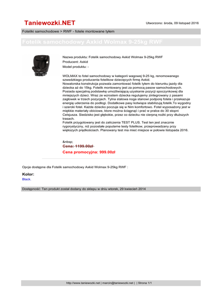 Taniewozki.NET Utworzono: środa, 09 listopad 2016 Foteliki samochodowe > RWF - fotele montowane tyłem Fotelik samochodowy Axkid Wolmax 9-25kg RWF Nazwa produktu: Fotelik samochodowy Axkid Wolmax 9-25kg RWF Producent: Axkid Model produktu: WOLMAX to fotel samochodowy w kategorii wagowej 9-25 kg, renomowanego szwedzkiego producenta fotelikow dziecięcych firmę Axkid. Nowatorska konstrukcja pozwala zamontować fotelik tyłem do kierunku jazdy dla dziecka aż do 15kg. Fotelik montowany jest za pomocą pasow samochodowych. Posiada specjalną podstawkę umożliwiającą uzyskanie pozycji spoczynkowej dla mniejszych dzieci. Wraz ze wzrostem dziecka regulujemy zintegrowany z pasami zagłowek w trzech pozycjach. Tylna stalowa noga stanowi podporę fotela i przekazuje energię uderzenia do podłogi. Dodatkowe pasy kotwiące stabilizują fotelik.To wygodny i szeroki fotel. Każde dziecko poczuje się w Nim komfortowo. Fotel wyposażony jest w miękkie materiały obiciowe, ktore można ściągnąć i prać w pralce do 30 stopni Celsjusza. Siedzisko jest głębokie, przez co dziecku nie cierpną nożki przy dłuższych trasach. Fotelik przygotowany jest do zaliczenia TEST PLUS. Test ten jest znacznie rygorystyczny, niż pozostałe popularne testy fotelikow, przeprowadzany przy większych prędkościach. Planowany test ma mieć miejsce w połowie listopada 2016. Cena: 1199.00zł Cena promocyjna: 999.00zł Opcje dostępne dla Fotelik samochodowy Axkid Wolmax 9-25kg RWF : Kolor: Black. Dostępność: Ten produkt został dodany do sklepu w dniu wtorek, 29 kwiecień 2014 http://www.taniewozki.net | [email protected] | | Strona 1/1