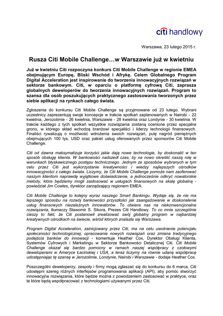Warszawa, 23 lutego 2015 r. Rusza Citi Mobile Challenge…w Warszawie już w kwietniu Już w kwietniu Citi rozpoczyna konkurs Citi Mobile Challenge w regionie EMEA obejmującym Europę, Bliski Wschód i Afrykę. Celem Globalnego Program Digital Acceleration jest inspirowanie do tworzenia innowacyjnych rozwiązań w sektorze bankowym. Citi, w oparciu o platformę cyfrową Citi, zaprasza globalnych deweloperów do tworzenia innowacyjnych rozwiązań. Program to szansa dla osób poszukujących praktycznego zastosowania tworzonych przez siebie aplikacji na rynkach całego świata. Zgłoszenia do konkursu Citi Mobile Challenge są przyjmowane od 23 lutego. Wybrani uczestnicy zaprezentują swoje koncepcje w trakcie spotkań zaplanowanych w Nairobi - 22 kwietnia, Jerozolimie - 26 kwietnia, Warszawie - 28 kwietnia oraz Londynie - 30 kwietnia. W trakcie każdego z tych spotkań wszystkie rozwiązania zostaną ocenione przez specjalne grono, w którego skład wchodzą branżowi specjaliści i liderzy technologii finansowych. Finaliści rywalizują o możliwość wdrożenia swoich rozwiązań, pulę nagród pieniężnych obejmujących 100 tys. USD oraz pakiet usług oferowanych przez sponsorów Citi Mobile Challenge. Citi od dawna maksymalizuje korzyści jakie dają nowe technologie, by doskonalić w ten sposób obsługę klienta. W bankowości nadszedł czas, by na nowo określić naszą rolę w warunkach błyskawicznego postępu technicznego. Jednym ze sposobów wybranych w tym celu przez Citi jest wykorzystanie kreatywności i wiedzy najlepszych ośrodków innowacyjności z całego świata. Liczymy, że Citi Mobile Challenge pomoże nam zaoferować naszym klientom naprawdę wyjątkowe doświadczenie, a jednocześnie odkryć nowatorskie metody, które będziemy mogli zastosować w usługach finansowych na skalę globalną powiedział Jim Cowles, dyrektor zarządzający regionem EMEA. Citi Mobile Challenge to kolejny wyraz naszego Smart Bankingu. Wydaje się, że nie ma lepszego sposobu na rozwój bankowości przyszłości jak zaangażowanie w doskonalenie usług finansowych niezależnych innowatorów. To otwiera nas na niekonwencjonalne rozwiązania, tłumaczy Sławomir S. Sikora, Prezes Citi Handlowy. To co mnie szczególnie cieszy to fakt, że Citi postanowił zrealizować swój globalny program w najbardziej kreatywnych ośrodkach na świecie, wśród których znalazła się Warszawa. Program Digital Acceleration, zainicjowany przez Citi, ma na celu uwolnienie potencjału społeczności technologicznej, opracowanie nowych rozwiązań oraz zmiana tradycyjnego podejścia banków do innowacji - komentuje Heather Cox, Dyrektor Obsługi Klienta, Systemów Cyfrowych i Marketingu w Sektorze Bankowości Detalicznej Citi. Citi Mobile Challenge okazał się bardzo pomocny w ramach naszej współpracy z czołowymi deweloperami w Ameryce Łacińskiej i USA, a teraz liczymy na równie udaną współpracę udostępniając tę szansę w Jerozolimie, Londynie, Nairobi i Warszawie - dodaje Heather Cox. Poszczególni deweloperzy, zespoły i firmy mogą zgłaszać się do konkursu do 6 marca. Citi udostępni szereg różnych interfejsów programowania aplikacji (API), aby pomóc stworzyć innowacyjne rozwiązania, które będzie można z powodzeniem zastosować w praktyce, oraz te które będą współpracować z technologiami używanymi przez Citi. Citi Mobile Challenge w regionie EMEA jest kolejnym krokiem po udanym debiucie programu w 2014 r. w Ameryce Łacińskiej i USA. Po pierwszym cyklu spotkań w Ameryce Łacińskiej do Citi wpłynęło 150 zgłoszeń, spośród których wybrano 50 finalistów zaproszonych do udziału w bezpośrednich spotkaniach zorganizowanych w Buenos Aires i Bogocie. W amerykańskiej edycji Citi Mobile Challenge zebrano 744 zgłoszeń z 62 krajów. Wybranych 60 finalistów zaproszono na finalne spotkania odbywające się w Dolinie Krzemowej, Nowym Jorku i Miami. Citi jest na finalnym etapie oceny programów pilotażowych wybranych spośród najlepszych zgłoszeń zaprezentowanych w czasie poprzednich edycji programu. Więcej informacji o Citi Mobile Challenge na stronie http://www.citimobilechallenge.com oraz w mediach społecznościowych pod hasłem #CitiMobileChallenge. *** Dodatkowych informacji udziela: Dorota Szostek-Rustecka, Dyrektor Biura Prasowego, tel. (0-22) 690 10 49 E-mail: [email protected] Marta Zalewska-Naser, Specjalista ds.kontaktów z mediami, tel. (0-22) 692 94 16 E-mail: [email protected] Marta Wiszniewska, Specjalista ds.kontaktów z mediami, tel. (0-22) 692 90 52 E-mail: [email protected] Bank Handlowy w Warszawie SA to jedna z największych instytucji finansowych w Polsce, oferująca pod marką Citi Handlowy bogaty i nowoczesny asortyment produktów i usług bankowości korporacyjnej, inwestycyjnej i detalicznej. Bank Handlowy obsługuje 7,4 tys. klientów korporacyjnych i ok. 760 tys. klientów indywidualnych poprzez nowoczesne kanały dystrybucji oraz sieć 60 oddziałów. W skład grupy kapitałowej Banku wchodzą takie podmioty jak: Dom Maklerski Banku Handlowego i Handlowy Leasing. Przynależność do Citigroup, największej na świecie instytucji finansowej, zapewnia klientom Banku Handlowego dostęp do usług finansowych w ponad 100 krajach. Citi (NYSE:C) to wiodąca globalna instytucja finansowa, mająca około 200 milionów klientów w ponad 140 krajach. Poprzez swoje dwie odrębne jednostki operacyjne: Citicorp i Citi Holdings, Citi obsługuje klientów indywidualnych, korporacyjnych, rządowych i instytucjonalnych zapewniając im bogaty wachlarz produktów i usług finansowych w zakresie bankowości detalicznej, bankowości korporacyjnej i inwestycyjnej, usług maklerskich i zarządzania aktywami. Dodatkowe informacje można uzyskać na stronie internetowej www.citigroup.com lub www.citi.com.
