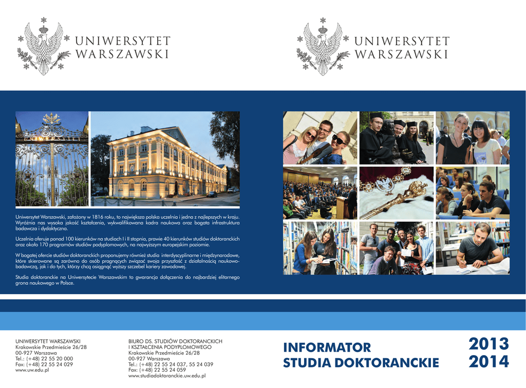 Uniwersytet Warszawski, założony w 1816 roku, to największa polska uczelnia i jedna z najlepszych w kraju. Wyróżnia nas wysoka jakość kształcenia, wykwalifikowana kadra naukowa oraz bogata infrastruktura badawcza i dydaktyczna. Uczelnia oferuje ponad 100 kierunków na studiach I i II stopnia, prawie 40 kierunków studiów doktoranckich oraz około 170 programów studiów podyplomowych, na najwyższym europejskim poziomie. W bogatej ofercie studiów doktoranckich proponujemy również studia interdyscyplinarne i międzynarodowe, które skierowane są zarówno do osób pragnących związać swoja przyszłość z działalnością naukowobadawczą, jak i do tych, którzy chcą osiągnąć wyższy szczebel kariery zawodowej. Studia doktoranckie na Uniwersytecie Warszawskim to gwarancja dołączenia do najbardziej elitarnego grona naukowego w Polsce. UNIWERSYTET WARSZAWSKI Krakowskie Przedmieście 26/28 00-927 Warszawa Tel.: (+48) 22 55 20 000 Fax: (+48) 22 55 24 029 www.uw.edu.pl BIURO DS. STUDIÓW DOKTORANCKICH I KSZTAŁCENIA PODYPLOMOWEGO Krakowskie Przedmieście 26/28 00-927 Warszawa Tel.: (+48) 22 55 24 037, 55 24 039 Fax: (+48) 22 55 24 059 www.studiadoktoranckie.uw.edu.pl INFORMATOR STUDIA DOKTORANCKIE 2013 2014 Informator Studia Doktoranckie 2013/2014 Warszawa 2013 Szanowni Państwo, Przyszli Doktoranci Uniwersytet Warszawski, założony w 1816 roku, to największa i jedna z najlepszych polskich uczelni. Wyróżnia nas wysoka jakość kształcenia, wykwalifikowana kadra naukowa oraz bogata infrastruktura badawcza i dydaktyczna. W ramach studiów doktoranckich Uniwersytet Warszawski oferuje ponad 30 programów studiów, w tym również interdyscyplinarnych i międzynarodowych, które skierowane są zarówno do osób pragnących związać swoją przyszłość z działalnością naukowo-badawczą, jak i do tych, które chcą osiągnąć wyższy szczebel kariery zawodowej. Studia doktoranckie na Uniwersytecie Warszawskim umożliwiają zdobycie zaawansowanej wiedzy i umiejętności w określonej dyscyplinie naukowej, przygotowując jednocześnie do samodzielnej działalności badawczej. Studia doktoranckie na naszym Uniwersytecie to również możliwość dołączenia do najbardziej elitarnego grona naukowego w Polsce, rozwijania współpracy międzynarodowej oraz uczestniczenia w innowacyjnych na skalę światową programach naukowo-badawczych. Studia doktoranckie są dziś także kluczem do osiągnięcia sukcesów zawodowych. Pracownicy ze stopniem doktora są dziś szczególnie cenieni przez pracodawców, a stopień magistra jest już często niewystarczający , aby skutecznie rozwijać karierę zawodową. Programy studiów doktoranckich na UW są dostosowane do coraz bardziej wymagającego rynku pracy, dlatego nasze studia doktoranckie kształtują najwyższej jakości pracowników, których kompetencje cenione są na całym świecie. W celu zapoznania się z bogata ofertą studiów doktoranckich na Uniwersytecie Warszawskim, oddajemy do Państwa rąk niniejszy Informator. Gorąco zachęcamy do rozpoczęcia studiów doktoranckich na Uniwersytecie Warszawskim i życzymy wszystkim przyszłym Doktorantom sukcesów w karierze naukowej i zawodowej. PROREKTOR prof. dr hab. Marta Kicińska-Habior SPIS TREŚCI Wydział „Artes Liberales” - Stacjonarne Studia Doktoranckie...............................................................................5 Wydział Biologii - Stacjonarne Studia Doktoranckie............................................................................................7 Wydział Chemii - Stacjonarne Studia Doktoranckie.............................................................................................9 Wydział Filozofii i Socjologii, Instytut Filozofii - Stacjonarne Studia Doktoranckie.................................................12 Wydział Filozofii i Socjologii, Instytut Socjologii - Stacjonarne Studia Doktoranckie.............................................15 Wydział Fizyki - Stacjonarne Studia Doktoranckie..............................................................................................18 Wydział Geografii i Studiów Regionalnych - Stacjonarne Studia Doktoranckie...................................................20 Wydział Geologii - Stacjonarne Studia Doktoranckie........................................................................................23 Wydział Historyczny - Stacjonarne Studia Doktoranckie.....................................................................................26 Wydział Historyczny i Wydział „Artes Liberales” - Środowiskowe Studia Doktoranckie.........................................28 Wydział Historyczny i Instytut Stosowanych Nauk Społecznych - Stacjonarne Międzywydziałowe Środowiskowe Studia Doktoranckie................................................................30 Wydział Historyczny i Instytut Stosowanych Nauk Społecznych - Niestacjonarne Międzywydziałowe Środowiskowe Studia Doktoranckie...........................................................33 Wydział Historyczny i Ośrodek Badań nad Antykiem Europy Południowo-Wschodniej - Stacjonarne Interdyscyplinarne Studia Doktoranckie.......................................................................................36 Wydział Historyczny, Wydział Filozofii i Socjologii, Wydział Polonistyki - Niestacjonarne Interdyscyplinarne Humanistyczne Studia Doktoranckie...........................................................37 Wydział Lingwistyki Stosowanej - Stacjonarne Studia Doktoranckie....................................................................40 Wydział Matematyki, Informatyki i Mechaniki - Stacjonarne Studia Doktoranckie...............................................43 Wydział Nauk Ekonomicznych - Stacjonarne Studia Doktoranckie.....................................................................45 Wydział Nauk Ekonomicznych - Niestacjonarne Studia Doktoranckie...................................................