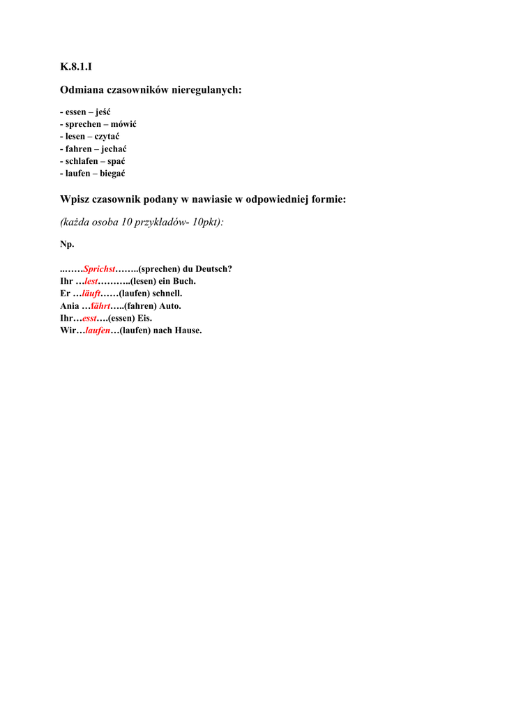 K.8.1.I Odmiana czasowników nieregulanych: - essen – jeść - sprechen – mówić - lesen – czytać - fahren – jechać - schlafen – spać - laufen – biegać Wpisz czasownik podany w nawiasie w odpowiedniej formie: (kaŜda osoba 10 przykładów- 10pkt): Np. ..……Sprichst……..(sprechen) du Deutsch? Ihr …lest………..(lesen) ein Buch. Er …läuft……(laufen) schnell. Ania …fährt…..(fahren) Auto. Ihr…esst….(essen) Eis. Wir…laufen…(laufen) nach Hause.