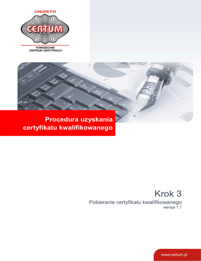 Procedura uzyskania certyfikatu kwalifikowanego Krok 3 Pobieranie certyfikatu kwalifikowanego wersja 1.7 Spis treści 1. WYMAGANIA ................................................................................................................................................ 3 2. PROCES WGRYWANIA CERTYFIKATU KWALIFIKOWANEGO NA KARTĘ ................................. 3 2.1. AUTOMATYCZNA INSTALACJA CERTYFIKATU KWALIFIKOWANEGO................................... 7 2.2. ZAAWANSOWANA INSTALACJA CERTYFIKATU KWALIFIKOWANEGO .............................. 11 Krok 3 – Pobieranie Certyfikatu Kwalifikowanego Wersja 1.7 2 1. Wymagania W celu wgrania certyfikatu kwalifikowanego na kartę kryptograficzną, wymagane są: • przeglądarka Internet Explorer (wersja 6.0 lub wyŜsza) albo Mozilla Firefox (wersja 2.0 lub wyŜsza), • zainstalowane oprogramowanie Java w wersji co najmniej 1.6, • zainstalowany Zestaw CERTUM – sterowniki do czytnika oraz oprogramowanie proCertum CardManager. 2. Proces wgrywania certyfikatu kwalifikowanego na kartę Certyfikat kwalifikowany wydawany jest przez CERTUM PCC po otrzymaniu kompletu poprawnie wypełnionych dokumentów. W poniŜszej instrukcji zawarte zostały kolejne kroki procesu pobierania certyfikatu kwalifikowanego. • Procedurę pobierania certyfikatu kwalifikowanego moŜesz rozpocząć w momencie otrzymania w dokumentach adres e-mail, informacji potwierdzającej wydanie przez CERTUM PCC certyfikatu kwalifikowanego (rys. 2.1). Rys 2.1 Wiadomość przesłana Subskrybentowi w chwili wydania certyfikatu kwalifikowanego • W wiadomości elektronicznej otrzymasz TELEKOD – jest to unikalny, przypisany dla Twojej karty numer, który będzie wykorzystywany w procesie pobierania certyfikatu kwalifikowanego. • Otrzymasz takŜe link do strony, za pośrednictwem której moŜesz pobrać certyfikat kwalifikowany. JeŜeli posiadasz polskie obywatelstwo wybierz opcję „Obywatel Polski” (rys. 2.2). Krok 3 – Pobieranie Certyfikatu Kwalifikowanego Wersja 1.7 3 Rys 2.2 Logowanie do systemu pobierania certyfikatu kwalifikowanego dla obywatela Polski • Zaloguj się do systemu podając TELEKOD, numer swojej karty kryptograficznej, numer PESEL oraz kod z obrazka. • JeŜeli nie posiadasz polskiego obywatelstwa wybierz opcję „Obcokrajowiec” (rys. 2.3) Rys 2.3 Logowanie do systemu pobierania certyfikatu kwalifikowanego dla Obcokrajowców • Zaloguj się do systemu podając TELEKOD, datę urodzenia, miejsce urodzenia, imię i nazwisko oraz numer swojej karty kryptograficznej. Krok 3 – Pobieranie Certyfikatu Kwalifikowanego Wersja 1.7 4 • Po zalogowaniu się sprawdź dane właściciela certyfikatu kwalifikowanego (rys. 2.4). JeŜeli wszystkie dane są poprawne, wciśnij przycisk „Pobierz certyfikat”. W przypadku wykrycia jakichkolwiek niezgodności skontaktuj się z Infolinią Unizeto Technologies SA. Rys 2.4 Informacje o Subskrybencie • W kolejnym oknie moŜesz wybrać tryb wgrywania certyfikaty na kartę kryptograficzną. MoŜesz wybrać : – automatyczną instalację certyfikatu za pośrednictwem apletu JAVA – w dwóch prostych krokach otrzymasz kod PUK, nadasz kod PIN oraz wgrasz certyfikat na kartę LUB – zaawansowaną (niestandardową) instalację certyfikatu – za jej pośrednictwem pobierzesz certyfikat w postaci pliku .cer na dowolną lokalizację na swojej stacji roboczej, zapiszesz kod PUK z konta, a następnie za pomocą aplikacji proCertum CardManager wgrasz samodzielnie certyfikat na kartę (rys 2.5) oraz zaakceptujesz certyfikat.(rys. 2.1.2) Krok 3 – Pobieranie Certyfikatu Kwalifikowanego Wersja 1.7 5 Rys 2.5 Okno wyboru kwalifikowanego. Automatycznej lub Zaawansowanej instalacji certyfikatu Krok 3 – Pobieranie Certyfikatu Kwalifikowanego Wersja 1.7 6 2.1. Automatyczna instalacja certyfikatu kwalifikowanego Przed przystąpieniem do Automatycznej instalacji certyfikatu kwalifikowanego upewnij się, Ŝe w czytniku kart kryptograficznych znajduje się prawidłowa karta kryptograficzna. Automatyczna instalacja certyfikatu kwalifikowanego odbywa się w 2 krokach: Krok 1 - Nadanie kodu PIN (rys. 2.1.1) Krok 2 – Wgranie certyfikatu kwalifikowanego na kartę i jego akceptacja (rys. 2.1.2) Rys. 2.1.1 Krok 1 – nadanie nowego kodu PIN Krok 3 – Pobieranie Certyfikatu Kwalifikowanego Wersja 1.7 7 Krok 1 - Nadanie kodu PIN Aby nadać nowy kod PIN: W pierwszej kolejności zaznacz opcję „PokaŜ PUK”. Następnie zapisz sobie wyświetlony kod PUK. JeŜeli wcześniej w oprogramowaniu proCertum CardManager dokonana była zmiana kodu PUK zaznacz pole „Zmieniłem juŜ wcześniej fabryczny kod PUK w oprogramowaniu proCertum CardManager”, a następnie wprowadź odpowiedni kod w polu „KOD PUK”. UWAGA! Trzykrotne błędne podanie w tym polu kodu PUK trwale blokuje kartę kryptograficzną. W przypadku zablokowania karty kryptograficznej skontaktuj się z Infolinią Unizeto Technologies S.A. Po zainstalowaniu certyfikatu kwalifikowanego, zalecamy ustanowienie nowego kod PUK za pośrednictwem oprogramowania proCertum CardManager i przechowywanie go . Następnie w polu „Wprowadź nowy kod PIN” podaj nowy kod PIN. Kod PIN naleŜy powtórnie wpisać w polu „Wprowadź nowy kod PIN” (powtórz). UWAGA! Kod PIN moŜe składać się z następujących znaków a-z, A-Z, 0-9, wielkość liter ma znaczenie. Kod PIN będzie wymagany w procesie składania bezpiecznego podpisu elektronicznego. Trzykrotne błędne podanie kodu PIN prowadzi do jego zablokowania. W celu jego odblokowania wymagane będzie podanie kodu PUK. NaleŜy kliknąć na przycisk „Zatwierdź PIN i wgraj certyfikat”. Krok 2 - Akceptacja certyfikatu Rys. 2.1.2 Krok 2 – Akceptacja certyfikatu Krok 3 – Pobieranie Certyfikatu Kwalifikowanego Wersja 1.7 8 • Na samym początku wciśnij przycisk „PokaŜ certyfikat” w celu zweryfikowania danych zawartych w certyfikacie. • W oknie, które się następnie pojawi (rys. 2.1.3) zawarte zostanę wszystkie informacje dla dan