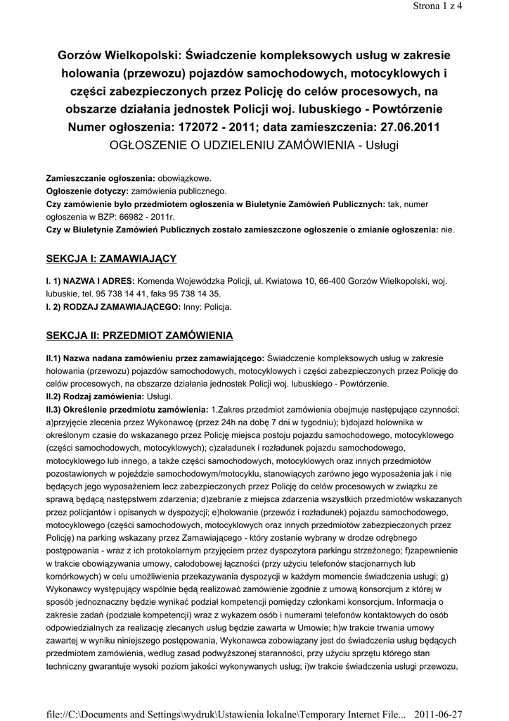 Strona 1 z 4 Gorzów Wielkopolski: Świadczenie kompleksowych usług w zakresie holowania (przewozu) pojazdów samochodowych, motocyklowych i części zabezpieczonych przez Policję do celów procesowych, na obszarze działania jednostek Policji woj. lubuskiego - Powtórzenie Numer ogłoszenia: 172072 - 2011; data zamieszczenia: 27.06.2011 OGŁOSZENIE O UDZIELENIU ZAMÓWIENIA - Usługi Zamieszczanie ogłoszenia: obowiązkowe. Ogłoszenie dotyczy: zamówienia publicznego. Czy zamówienie było przedmiotem ogłoszenia w Biuletynie Zamówień Publicznych: tak, numer ogłoszenia w BZP: 66982 - 2011r. Czy w Biuletynie Zamówień Publicznych zostało zamieszczone ogłoszenie o zmianie ogłoszenia: nie. SEKCJA I: ZAMAWIAJĄCY I. 1) NAZWA I ADRES: Komenda Wojewódzka Policji, ul. Kwiatowa 10, 66-400 Gorzów Wielkopolski, woj. lubuskie, tel. 95 738 14 41, faks 95 738 14 35. I. 2) RODZAJ ZAMAWIAJĄCEGO: Inny: Policja. SEKCJA II: PRZEDMIOT ZAMÓWIENIA II.1) Nazwa nadana zamówieniu przez zamawiającego: Świadczenie kompleksowych usług w zakresie holowania (przewozu) pojazdów samochodowych, motocyklowych i części zabezpieczonych przez Policję do celów procesowych, na obszarze działania jednostek Policji woj. lubuskiego - Powtórzenie. II.2) Rodzaj zamówienia: Usługi. II.3) Określenie przedmiotu zamówienia: 1.Zakres przedmiot zamówienia obejmuje następujące czynności: a)przyjęcie zlecenia przez Wykonawcę (przez 24h na dobę 7 dni w tygodniu); b)dojazd holownika w określonym czasie do wskazanego przez Policję miejsca postoju pojazdu samochodowego, motocyklowego (części samochodowych, motocyklowych); c)załadunek i rozładunek pojazdu samochodowego, motocyklowego lub innego, a także części samochodowych, motocyklowych oraz innych przedmiotów pozostawionych w pojeździe samochodowym/motocyklu, stanowiących zarówno jego wyposażenia jak i nie będących jego wyposażeniem lecz zabezpieczonych przez Policję do celów procesowych w związku ze sprawą będącą następstwem zdarzenia; d)zebranie z miejsca zdarzenia wszystkich przedmiotów wskazanych przez policjantów i opisanych w dyspozycji; e)holowanie (przewóz i rozładunek) pojazdu samochodowego, motocyklowego (części samochodowych, motocyklowych oraz innych przedmiotów zabezpieczonych przez Policję) na parking wskazany przez Zamawiającego - który zostanie wybrany w drodze odrębnego postępowania - wraz z ich protokolarnym przyjęciem przez dyspozytora parkingu strzeżonego; f)zapewnienie w trakcie obowiązywania umowy, całodobowej łączności (przy użyciu telefonów stacjonarnych lub komórkowych) w celu umożliwienia przekazywania dyspozycji w każdym momencie świadczenia usługi; g) Wykonawcy występujący wspólnie będą realizować zamówienie zgodnie z umową konsorcjum z której w sposób jednoznaczny będzie wynikać podział kompetencji pomiędzy członkami konsorcjum. Informacja o zakresie zadań (podziale kompetencji) wraz z wykazem osób i numerami telefonów kontaktowych do osób odpowiedzialnych za realizację zlecanych usług będzie zawarta w Umowie; h)w trakcie trwania umowy zawartej w wyniku niniejszego postępowania, Wykonawca zobowiązany jest do świadczenia usług będących przedmiotem zamówienia, według zasad podwyższonej staranności, przy użyciu sprzętu którego stan techniczny gwarantuje wysoki poziom jakości wykonywanych usług; i)w trakcie świadczenia usługi przewozu, file://C:\Documents and Settings\wydruk\Ustawienia lokalne\Temporary Internet File... 2011-06-27 Strona 2 z 4 Wykonawca zobowiązany jest używać tylko takich środków transportu, których użycie będzie niezbędne dla prawidłowego wykonania zlecenia. Ilość części i akcesoriów pojazdów mechanicznych oraz innych przedmiotów zabezpieczonych przez Policję w miejscu zdarzenia, mieszcząca się i przewożona na jednym środku transportu będzie określana w umowie jako (transport); j)w trakcie świadczenia usługi przyjęcie pełnej odpowiedzialności cywilno-prawnej za holowane pojazdy lub ich części, oraz inne przedmioty zabezpieczone przez Policję w następstwie zdarzenia; k) wykonywanie dyspozycji w sposób określony w umowie, z uwzględnieniem formalności wymaganych w dyspozycji usunięcia pojazdu/części w protokole zdawczoodbiorczym, protokole opisu przedmiotu przed przekazaniem go na parking depozytowy; l)prowadzenie i przekazywanie do Zamawiającego w terminie do 5-go każdego miesiąca wykazu holowanych w okresie minionego miesiąca pojazdów. Wykaz będzie podstawą do wystawienia faktury za usługę holowania/załadunku/rozładunku w ramach zawartej umowy. 2.Pojazdy ciężarowe albo ciągniki samochodowe razem z przyczepą będą traktowane jako 1 pojazd samochodowy o dopuszczalnej masie całkowitej przekraczającej 16t. 3.Realizacja umowy będzie przebiegała etapowo, w miarę potrzeb ze strony Zamawiającego. 4.Termin płatności: 30 dni kalendarzowych od dnia dostarczenia faktury VAT do siedziby Zamawiającego. Szczegóły dotyczące płatności zawiera projekt Umowy (zał. nr 5 do SIWZ), dostępny na stronie internetowej Zamawiającego: www.lubuska.policja.gov.pl. 5.Ze względu na specyfikę przedmiotu zamówienia oraz charakter Zamawiającego, Zamawiający zastrzega, że część zamówienia nie może być powierzona podwykonawcom tj.: Zamawiający nie dopuszcza powierzenia Podwykonawcy obowiązków związanych z holowaniem (przewozem) pojazdu samochodowego, motocyklowego oraz części samochodowych, motocyklowych i innych przedmiotów zabezpieczonych przez Policję w następstwie zdarzenia (na mocy art. 36 ust. 5 ustawy P.z.p.). 6. Zamawiający dopuszcza możliwość składania ofert częściowych, w zależności od miejsca realizacji przedmiotu zamówienia. 7.Przedmiot zamówienia podzielono na 17 części - Zakres terytorialny świadczenia usługi dla każdej części obejmuje teren administracyjny podległy danej jednostce Policji: Część 1: nadzór kompetencyjny: KP Kostrzy