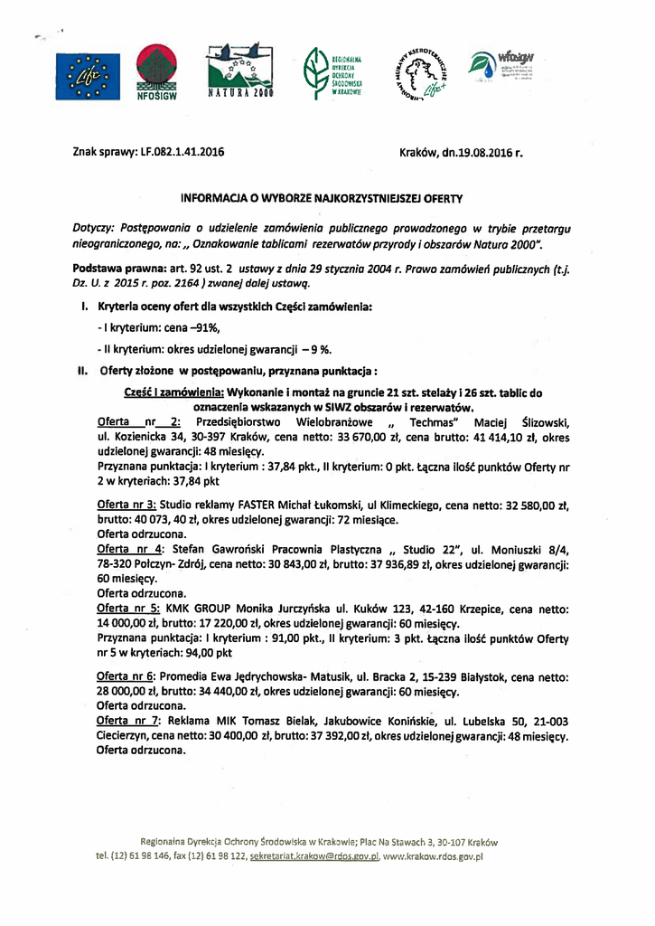 fl NATURA 1010 WKWOE Znak sprawy: LF.082.1.41.2016 Kraków, dn.19.08.2016 r. INFORMACJA O WYBORZE NAJKORZYSTNIEJSZEJ OFERTY Dotyczy: Postępowania o udzielenie zamówienia publicznego prowadzonego w trybie przetargu nieograniczonego, na:,, Oznakowanie tablicami rezerwatów przyrody i obszarów Natura 2000”. Podstawa prawna: art. 92 ust. 2 ustawy z dnia 29 styczniu 2004 r. Prawo zamówień publicznych (t.j. Dz. U. z 2015 r. poz. 2164) zwanej dalej ustawq. I. Kryteria oceny ofert dla wszystkich Części zamówienia: I kryterium: cena —91%, - - II. li kryterium: okres udzielonej gwarancji —9%. Oferty złożone w postępowaniu, przyznana punktacja: Cześć I zamówienia: Wykonanie i montaż na gruncie 21 szt. stelaży i 26 szt. tablic do oznaczenła wskazanych w SIWZ obszarów i rezerwatów. Oferta nr2: Przedsiębiorstwo Wielobranżowe Techmas” Maciej Ślizowski, ul. Kozienicka 34, 30-397 Kraków, cena netto: 33 670,00 zł, cena brutto: 41414,10 zł, okres udzielonej gwarancji: 48 miesięcy. Przyznana punktacja: I kryterium : 37,86 pkt., II kryterium: O pkt. Łączna ilość punktów Oferty nr 2 w kryteriach: 37,84 pkt „ Oferta nr 3: Studio reklamy FASTER Michał Łukomski, ul Klimeckiego, cena netto: 32580,00 zł, brutto: 40073,40 zł, okres udzielonej gwarancji: 72 miesiące. Oferta odrzucona. Oferta nr 4: Stefan Gawroński Pracownia Plastyczna Studio 22”, ul. Moniuszki 8/4, 78-320 Połczyn- Zdrój, cena netto: 30843,00 zł, brutto: 37 936,89 zł, okres udzielonej gwarancji: 60 miesięcy. Oferta odrzucona. Oferta nr 5: KMK GROUP Monika Jurczyńska ul. Kuków 123, 42-160 Krzepice, cena netto: 14000,00 zł, brutto: 17 220,00 zł, okres udzielonej gwarancji: 60 miesięcy. Przyznana punktacja: I kryterium : 91,00 pkt., II kryterium: 3 pkt. Łączna ilość punktów Oferty nr 5 w kryteriach: 94,00 pkt „ Oferta nr 6: Promedia Ewa iędrychowska- Matusik, ul. Bracka 2, 15-239 Białystok, cena netto: 28 000,00 zł, brutto: 34440,00 zł, okres udzielonej gwarancji: 60 miesięcy. Oferta odrzucona. Oferta nr 7: Reklama MIK Tomasz Bielak, Jakubowice Konińskie, ul. Lubelska 50, 21-003 Ciecierzyn, cena netto: 30400,00 zł, brutto: 37392,00 zł, okres udzielonej gwarancji: 48 miesięcy. Oferta odrzucona. Re8ionalna Dyrekcja Ochrony środowiska w Krakowie; Plac Na Stawach 3, 30-107 Kraków tel. (12) 6198 146, fax (12) 6198 122, sekretariat.krakowrdos.oy.pĘ www.krakow.rdos.goy.pi A NATUR A 2000 ( fq\ Ą%y!!V WXRAKOąJE Część II- Wykonanie i montaż na gruncie 12 szt. stelaży i 13 szt. tablic do oznaczenia do oznaczenia wskazanych w SIWZ obszarów. Oferta nr 1: Wiesław Borkowski BOR-ARS Reklamy i Szyldy, Tablice Przyrodnicze, Usługi netto: 15 280,00 zł, Budowalne, ul. Leśna 6, 34-450 Krościenko, cena brutto: 18794,40 zł, okres udzielonej gwarancji: 50 miesięcy. Oferta odrzucona. Oferta nr 2: Przedsiębiorstwo Wielobranżowe,, Techmas” Maciej Ślizowski, ul. Kozienicka 34, 30397 Kraków, cena netto: 18 590,00 zł, cena brutto: 22 865,70 zł, okres udzielonej gwarancji: 48 miesięcy. Przyznana punktacja: I kryterium :41,61 pkt., II kryterium: O pkt.Łączna ilość punktów Oferty nr2 w kryteriach: 41,61 pkt. Oferta nr3: Studio reklamy FASTER Michał Łukomski, ul Klimeckiego, 30-705 Kraków, cena netto: 18460,00 zł, brutto: 22705,80 zł, okres udzielonej gwarancji: 72 miesiące. Oferta odrzucona. Oferta nr 4: Stefan Gawroński Pracownia Plastyczna Studio 22”, ul. Moniuszki 8/4, 78-320 Połczyn- Zdrój, cena netto: 17 659,20 zł, brutto: 21720,80 zł, okres udzielonej gwarancji: 60 miesięcy. Oferta odrzucona. Oferta nr 5: KMK GROUP Monika Jurczyńska ul. Kuków 123, 42-160 Krzepice, cena netto: 8500,00 zł, brutto: 10455,00 zł, okres udzielonej gwarancji: 60 miesięcy. Przyznana punktacja: I kryterium : 91,00 pkt., II kryterium: 3 pkt.. Łączna ilość punktów Oferty nr Sw kryteriach: 94,00 pkt. „ Oferta nr 6: Promedia Ewa Jędrychowska- Matusik, ul. Bracka 2, 15-239 Białystok, cena netto: 18000,00 zł, brutto: 22 140,00 zł, okres udzielonej gwarancji: 60 miesięcy. Oferta odrzucona. Oferta nr 7: Reklama MIK Tomasz Bielak, Jakubowice Konińskie, ul. Lubelska 50, 21-003 Ciecierzyn, cena netto: 16800,00 zł, brutto: 20 664,00 zł, okres udzielonej gwarancji: 48 miesięcy. Oferta odrzucona. Część III- Wykonanie i montaż na gruncie 24 szt stelaży i 24 szt. tablic do oznaczania obszarów oraz 12 tablic informacyjnych o środowisku przyrodniczym do oznaczenia wskazanych w SIWZ obszarów. Oferta nr 2: Przedsiębiorstwo Wielobranżowe Techmas” Maciej Ślizowski, ul. Kozienicka 34, 30-397 Kraków, cena netto: 40680,00 zł, cena brutto: 50036,40 zł, okres udzielonej gwarancji: 48 miesięcy. Przyznana punktacja: I kryterium : 39,15 pkt., II kryterium: O pkt. Łączna ilość punktów Oferty nr 2 w kryteriach: 39,15 pkt „ Oferta nr 3: Studio reklamy FASTER Michał Łukomski, ul Klimeckiego, 30-705 Kraków, cena netto: 38570,00 zł, brutto: 47441,10 zł, okres udzielonej gwarancji: 72 miesiące. Oferta odrzucona Oferta nr 4: Stefan Gawroński Pracownia Plastyczna Studio 22”, ul. Moniuszki 8/4, 78-320 Połczyn- Zdrój, cena netto: 33 801,60 zł, brutto: 41 575,97 zł, okres udzielonej gwarancji: 60 miesięcy. „ tel. Regionalna Dyrekcja Ochrony środowiska w Krakowie; Plac Na Stawach 3, 30-107 Kraków fax (12) 6198 122, sekretariat,krakowrdos.oy.nl, www.krakow.rdcsoy.pl (12) 61 98 146, Eflay A /T”\ I. J%YV NFOSIGW Oferta odrzucona. Oferta nr 5: KMK GROUP Monika Jurczyńska ul. Kuków 123, 42-160 Krzepice, cena netto: 17500,00 zł, brutto: 21 525,00 zł, okres udzielonej gwarancji: 60 miesięcy. Przyznana punktacja: I kryterium : 91,00 pkt., II kryterium: 3 pkt. Łączna ilość punktów Oferty nr Sw kryteriach: 94,00 pkt. Oferta nr 6: Promedia Ewa Jędrychowska- Matusik, ul. Bracka 2, 15-239 Białystok, cena netto: 38 000,00 zł, brutto: 46740,00 zł, okres udzielonej gwarancji: 60 miesięcy. Oferta odrzucona. Oferta nr 7: Reklama MIK Tomasz 8ielak, Jakubowice Koniński