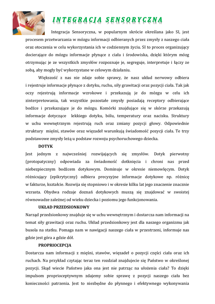 Integracja Sensoryczna, w popularnym skrócie określana jako SI, jest procesem przetwarzania w mózgu informacji odbieranych przez zmysły z naszego ciała oraz otoczenia w celu wykorzystania ich w codziennym życiu. SI to proces organizujący docierające do mózgu informacje płynące z ciała i środowiska, dzięki którym mózg otrzymując je ze wszystkich zmysłów rozpoznaje je, segreguje, interpretuje i łączy ze sobą, aby mogły być wykorzystane w celowym działaniu. Większość z nas nie zdaje sobie sprawy, że nasz układ nerwowy odbiera i rejestruje informacje płynące z dotyku, ruchu, siły grawitacji oraz pozycji ciała. Tak jak oczy rejestrują informacje wzrokowe i przekazują je do mózgu w celu ich zinterpretowania, tak wszystkie pozostałe zmysły posiadają receptory odbierające bodźce i przekazujące je do mózgu. Komórki znajdujące się w skórze przekazują informacje dotyczące lekkiego dotyku, bólu, temperatury oraz nacisku. Struktury w uchu wewnętrznym rejestrują ruch oraz zmiany pozycji głowy. Odpowiednie struktury mięśni, stawów oraz więzadeł warunkują świadomość pozycji ciała. Te trzy podstawowe zmysły leżą u podstaw rozwoju psychoruchowego dziecka. DOTYK Jest jednym (protopatyczny) z najwcześniej odpowiada za rozwijających świadomość się zmysłów. dotknięcia i Dotyk chroni pierwotny nas przed niebezpiecznym bodźcem dotykowym. Dominuje w okresie niemowlęcym. Dotyk różnicujący (epikrytyczny) odbiera precyzyjne informacje dotykowe np. różnicę w fakturze, kształcie. Rozwija się stopniowo i w okresie kilku lat jego znaczenie znacznie wzrasta. Obydwa rodzaje doznań dotykowych muszą się znajdować w swoistej równowadze zależnej od wieku dziecka i poziomu jego funkcjonowania. UKŁAD PRZEDSIONKOWY Narząd przedsionkowy znajduje się w uchu wewnętrznym i dostarcza nam informacji na temat siły grawitacji oraz ruchu. Układ przedsionkowy jest dla naszego organizmu jak busola na statku. Pomaga nam w nawigacji naszego ciała w przestrzeni, informuje nas gdzie jest góra a gdzie dół. PROPRIOCEPCJA Dostarcza nam informacji z mięśni, stawów, więzadeł o pozycji części ciała oraz ich ruchach. Na przykład czytając teraz ten rozdział znajdujecie się Państwo w określonej pozycji. Skąd wiecie Państwo jaka ona jest nie patrząc na ułożenia ciała? To dzięki impulsom proprioceptywnym zdajemy sobie sprawę z pozycji naszego ciała bez konieczności patrzenia. Jest to niezbędne do płynnego i efektywnego wykonywania różnorodnych ruchów, z czego zdawać sobie możemy sprawę w ciemnościach. Zmysł propriocepcji jest ściśle związany ze zmysłem dotyku i układem przedsionkowym. Z tego powodu często mówi się o przetwarzaniu dotykowo-proprioceptywnym lub przedsionkowo-proprioceptywnym. Wczesne rozpoznanie zaburzeń i rozpoczęcie terapii może pomóc Twojemu dziecku w przezwyciężeniu trudności i ułatwić mu start w szkole. Metoda SI przeznaczona jest przede wszystkim dla dzieci w wieku przedszkolnym i wczesnoszkolnym. Jeśli zauważą Państwo, że Wasze dziecko: reaguje na dotyk agresją lub wycofaniem się, boi się wysokości i ruchu lub odczuwa mdłości w wyniku niewielkiego ruchu bądź wysokości, niechętnie ryzykuje oraz próbuje nowych rzeczy, czuje duży dyskomfort w zatłoczonych miejscach, je mało zróżnicowane posiłki i/lub ma dużą wrażliwość na zapachy, jest nadmiernie pobudzone i aktywne, prezentuje nadmierną aktywnością ruchową będącej efektem jak i źródłem wrażeń sensorycznych, nie reaguje na ból i nie zauważa innych bodźców dotykowych, często i zbyt mocno dotyka inne osoby (co może wyglądać jak zachowanie agresywne), uczestniczy w niebezpiecznych zabawach np. zbyt wysokie wspinanie się, preferuje intensywne, długo trwające zabawy typu huśtanie, kręcenie, często bez objawów dyskomfortu, lubi bardzo głośne dźwięki np. głośno grająca muzyka, telewizor, ma opóźnioną mowę lub znaczną wadę wymowy, ma trudności z aktywnościami manualnymi, pisaniem, zapinaniem guzików itp. ma słabe umiejętności z zakresu dużej motoryki np. kopanie, łapanie, rzucanie piłki, ma trudności z naśladowaniem ruchów np. w zabawie, ma trudności z utrzymaniem równowagi, wykonaniem sekwencji ruchów lub obustronną koordynacją, preferuje znane aktywności i zabawy, preferuje aktywności statyczne, siedzące np. oglądanie telewizji, czytanie książki, ma podwyższony poziom pobudzenia i aktywności lub obniżony poziom aktywności, ociężałość, trudności z koncentracją, opóźniony rozwój ruchowy, trudności z utrzymaniem równowagi, trudności z koordynacją wzrokowo-ruchową, trudności z percepcją słuchową, trudności z nauką: czytaniem, pisaniem, matematyką, niskie poczucie wartości, zaburzone relacje społeczne, problemy emocjonalne. Deficyty integracji sensorycznej często współwystępują z zespołem nadpobudliwości psychoruchowej ADHD, zespołem Aspergera, autyzmem, Mózgowym Porażeniem Dziecięcym, zespołem Downa, zespołem FAS, rozszczepem kręgosłupa, obniżonym lub podwyższonym napięciem mięśniowym oraz innymi. Pojawiają się również u dzieci w normie rozwojowej. Jeśli Państwa dziecko posiada kilka z przedstawionych objawów może to oznaczać, że ma problemy z zaburzeniami Integracji Sensorycznej.