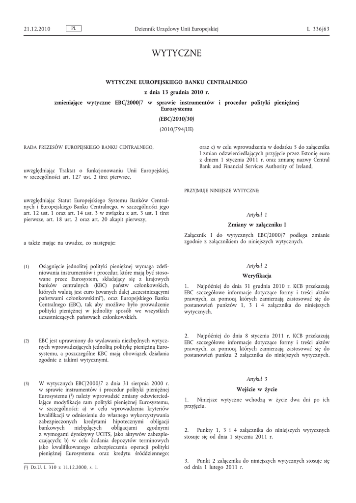21.12.2010 PL Dziennik Urzędowy Unii Europejskiej L 336/63 WYTYCZNE WYTYCZNE EUROPEJSKIEGO BANKU CENTRALNEGO z dnia 13 grudnia 2010 r. zmieniające wytyczne EBC/2000/7 w sprawie instrumentów i procedur polityki pieniężnej Eurosystemu (EBC/2010/30) (2010/794/UE) RADA PREZESÓW EUROPEJSKIEGO BANKU CENTRALNEGO, uwzględniając Traktat o funkcjonowaniu Unii Europejskiej, w szczególności art. 127 ust. 2 tiret pierwsze, oraz c) w celu wprowadzenia w dodatku 5 do załącznika I zmian odzwierciedlających przyjęcie przez Estonię euro z dniem 1 stycznia 2011 r. oraz zmianę nazwy Central Bank and Financial Services Authority of Ireland, PRZYJMUJE NINIEJSZE WYTYCZNE: uwzględniając Statut Europejskiego Systemu Banków Central nych i Europejskiego Banku Centralnego, w szczególności jego art. 12 ust. 1 oraz art. 14 ust. 3 w związku z art. 3 ust. 1 tiret pierwsze, art. 18 ust. 2 oraz art. 20 akapit pierwszy, a także mając na uwadze, co następuje: (1) Osiągnięcie jednolitej polityki pieniężnej wymaga zdefi niowania instrumentów i procedur, które mają być stoso wane przez Eurosystem, składający się z krajowych banków centralnych (KBC) państw członkowskich, których walutą jest euro (zwanych dalej „uczestniczącymi państwami członkowskimi”), oraz Europejskiego Banku Centralnego (EBC), tak aby możliwe było prowadzenie polityki pieniężnej w jednolity sposób we wszystkich uczestniczących państwach członkowskich. (2) EBC jest uprawniony do wydawania niezbędnych wytycz nych wprowadzających jednolitą politykę pieniężną Euro systemu, a poszczególne KBC mają obowiązek działania zgodnie z takimi wytycznymi. (3) W wytycznych EBC/2000/7 z dnia 31 sierpnia 2000 r. w sprawie instrumentów i procedur polityki pieniężnej Eurosystemu (1) należy wprowadzić zmiany odzwiercied lające modyfikacje ram polityki pieniężnej Eurosystemu, w szczególności: a) w celu wprowadzenia kryteriów kwalifikacji w odniesieniu do własnego wykorzystywania zabezpieczonych kredytami hipotecznymi obligacji bankowych niebędących obligacjami zgodnymi z wymogami dyrektywy UCITS, jako aktywów zabezpie czających; b) w celu dodania depozytów terminowych jako kwalifikowanego zabezpieczenia operacji polityki pieniężnej Eurosystemu oraz kredytu śróddziennego; (1) Dz.U. L 310 z 11.12.2000, s. 1. Artykuł 1 Zmiany w załączniku I Załącznik I do wytycznych EBC/2000/7 podlega zmianie zgodnie z załącznikiem do niniejszych wytycznych. Artykuł 2 Weryfikacja 1. Najpóźniej do dnia 31 grudnia 2010 r. KCB przekazują EBC szczegółowe informacje dotyczące formy i treści aktów prawnych, za pomocą których zamierzają zastosować się do postanowień punktów 1, 3 i 4 załącznika do niniejszych wytycznych. 2. Najpóźniej do dnia 8 stycznia 2011 r. KCB przekazują EBC szczegółowe informacje dotyczące formy i treści aktów prawnych, za pomocą których zamierzają zastosować się do postanowień punktu 2 załącznika do niniejszych wytycznych. Artykuł 3 Wejście w życie 1. Niniejsze wytyczne wchodzą w życie dwa dni po ich przyjęciu. 2. Punkty 1, 3 i 4 załącznika do niniejszych wytycznych stosuje się od dnia 1 stycznia 2011 r. 3. Punkt 2 załącznika do niniejszych wytycznych stosuje się od dnia 1 lutego 2011 r. L 336/64 PL Dziennik Urzędowy Unii Europejskiej Artykuł 4 Adresaci Niniejsze wytyczne są skierowane do KBC uczestniczących państw członkowskich. Sporządzono we Frankfurcie nad Menem dnia 13 grudnia 2010 r. W imieniu Rady Prezesów EBC Jean-Claude TRICHET Prezes EBC 21.12.2010 21.12.2010 PL Dziennik Urzędowy Unii Europejskiej ZAŁĄCZNIK W załączniku I do wytycznych EBC/2000/7 wprowadza się następujące zmiany: 1) w pkt 6.2.2 ustęp pierwszy otrzymuje brzmienie: „W ramach jednolitego systemu aktywów kwalifikowanych występują trzy rodzaje aktywów nierynkowych, które mogą stanowić zabezpieczenie: depozyty terminowe przyjmowane od uprawnionych kontrahentów, należności kredy towe i nierynkowe instrumenty dłużne zabezpieczone detalicznymi kredytami hipotecznymi (RMBD) (*). ___________ (*) Od 1 dnia stycznia 2007 r. do dnia 31 grudnia 2011 r. w odniesieniu do należności kredytowych obowiązywać będzie system przejściowy pozwalający każdemu z KBC na określenie minimalnej wielkości należności kredyto wych kwalifikujących się do wykorzystania jako zabezpieczenie, z wyłączeniem wykorzystania transgranicznego, oraz ewentualnych opłat transakcyjnych. Od dnia 1 stycznia 2012 r. obowiązywać będzie system całkowicie zunifikowany.”; 2) w pkt 6.2.3 wprowadza się następujące zmiany: a) akapit siódmy (piąty akapit pod nagłówkiem „Zasady wykorzystania aktywów kwalifikowanych”) otrzymuje brzmienie: „Powyższych przepisów dotyczących bliskich powiązań nie stosuje się do: a) bliskich powiązań pomiędzy kontra hentem a organem administracji publicznej krajów EOG mającym uprawnienie do nakładania podatków, a także przypadków, gdy gwarantem instrumentu dłużnego jest organ administracji publicznej kraju EOG uprawniony do nakładania podatków; b) zabezpieczonych obligacji bankowych wyemitowanych zgodnie z kryteriami określonymi w art. 22 ust. 4 dyrektywy UCITS; c) przypadków, gdy instrumenty dłużne są chronione specjalnymi prawnymi środkami zabezpieczającymi podobnymi do środków wymienionych w lit. b), jak ma to miejsce w przypadku: (i) nierynkowych instrumentów dłużnych zabezpieczonych detalicznymi kredytami hipotecznymi (RMBD) niebędących papierami wartościowymi; oraz (ii) strukturyzowanych obligacji bankowych zabezpieczonych mieszkaniowymi kredytami hipotecznymi lub strukturyzowanych obligacji bankowych zabezpieczonych komercyjnymi kredytami hipotecznymi, tj. określonych zabezpieczonych obligacji bankowych, których Komisja Europejska nie uznała za zgodne z dyrektywą UCITS, spełniających wszystkie kryteria dotyczące papierów wartościowych zabezpieczonych aktywami określone w punktach 6.