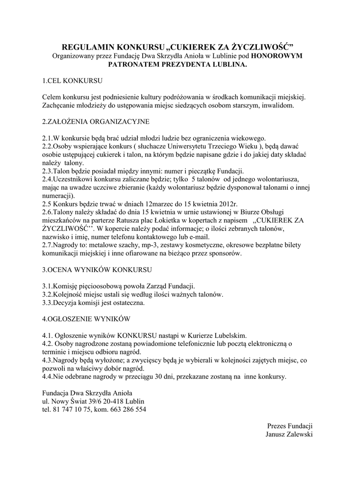REGULAMIN KONKURSU ,,CUKIEREK ZA ŻYCZLIWOŚĆ” Organizowany przez Fundację Dwa Skrzydła Anioła w Lublinie pod HONOROWYM PATRONATEM PREZYDENTA LUBLINA. 1.CEL KONKURSU Celem konkursu jest podniesienie kultury podróżowania w środkach komunikacji miejskiej. Zachęcanie młodzieży do ustępowania miejsc siedzących osobom starszym, inwalidom. 2.ZAŁOŻENIA ORGANIZACYJNE 2.1.W konkursie będą brać udział młodzi ludzie bez ograniczenia wiekowego. 2.2.Osoby wspierające konkurs ( słuchacze Uniwersytetu Trzeciego Wieku ), będą dawać osobie ustępującej cukierek i talon, na którym będzie napisane gdzie i do jakiej daty składać należy talony. 2.3.Talon będzie posiadał między innymi: numer i pieczątkę Fundacji. 2.4.Uczestnikowi konkursu zaliczane będzie; tylko 5 talonów od jednego wolontariusza, mając na uwadze uczciwe zbieranie (każdy wolontariusz będzie dysponował talonami o innej numeracji). 2.5 Konkurs będzie trwać w dniach 12marzec do 15 kwietnia 2012r. 2.6.Talony należy składać do dnia 15 kwietnia w urnie ustawionej w Biurze Obsługi mieszkańców na parterze Ratusza plac Łokietka w kopertach z napisem ,,CUKIEREK ZA ŻYCZLIWOŚĆ’’. W kopercie należy podać informacje; o ilości zebranych talonów, nazwisko i imię, numer telefonu kontaktowego lub e-mail. 2.7.Nagrody to: metalowe szachy, mp-3, zestawy kosmetyczne, okresowe bezpłatne bilety komunikacji miejskiej i inne ofiarowane na bieżąco przez sponsorów. 3.OCENA WYNIKÓW KONKURSU 3.1.Komisję pięcioosobową powoła Zarząd Fundacji. 3.2.Kolejność miejsc ustali się według ilości ważnych talonów. 3.3.Decyzja komisji jest ostateczna. 4.OGŁOSZENIE WYNIKÓW 4.1. Ogłoszenie wyników KONKURSU nastąpi w Kurierze Lubelskim. 4.2. Osoby nagrodzone zostaną powiadomione telefonicznie lub pocztą elektroniczną o terminie i miejscu odbioru nagród. 4.3.Nagrody będą wyłożone; a zwycięscy będą je wybierali w kolejności zajętych miejsc, co pozwoli na właściwy dobór nagród. 4.4.Nie odebrane nagrody w przeciągu 30 dni, przekazane zostaną na inne konkursy. Fundacja Dwa Skrzydła Anioła ul. Nowy Świat 39/6 20-418 Lublin tel. 81 747 10 75, kom. 663 286 554 Prezes Fundacji Janusz Zalewski