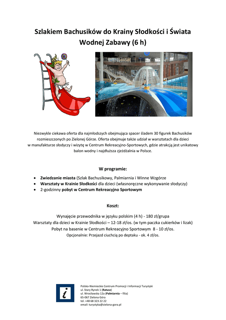 Szlakiem Bachusików do Krainy Słodkości i Świata Wodnej Zabawy (6 h) Niezwykle ciekawa oferta dla najmłodszych obejmująca spacer śladem 30 figurek Bachusików rozmieszczonych po Zielonej Górze. Oferta obejmuje także udział w warsztatach dla dzieci w manufakturze słodyczy i wizytę w Centrum Rekreacyjno-Sportowych, gdzie atrakcją jest unikatowy balon wodny i najdłuższa zjeżdżalnia w Polsce. W programie: Zwiedzanie miasta (Szlak Bachusikowy, Palmiarnia i Winne Wzgórze Warsztaty w Krainie Słodkości dla dzieci (własnoręczne wykonywanie słodyczy) 2-godzinny pobyt w Centrum Rekreacyjno Sportowym Koszt: Wynajęcie przewodnika w języku polskim (4 h) - 180 zł/grupa Warsztaty dla dzieci w Krainie Słodkości – 12-18 zł/os. (w tym paczka cukierków i lizak) Pobyt na basenie w Centrum Rekreacyjno Sportowym 8 - 10 zł/os. Opcjonalnie: Przejazd ciuchcią po deptaku - ok. 4 zł/os. Polsko-Niemieckie Centrum Promocji i Informacji Turystyki ul. Stary Rynek 1 (Ratusz) ul. Wrocławska 12a (Palmiarnia – filia) 65-067 Zielona Góra tel. +48 68 323 22 22 email: [email protected]