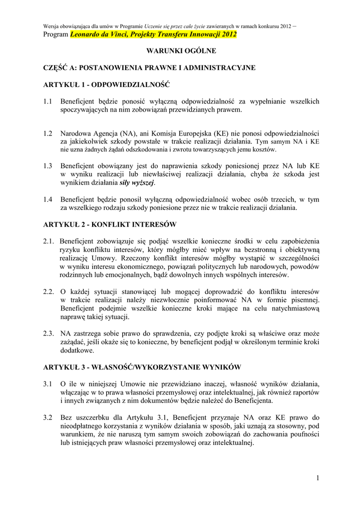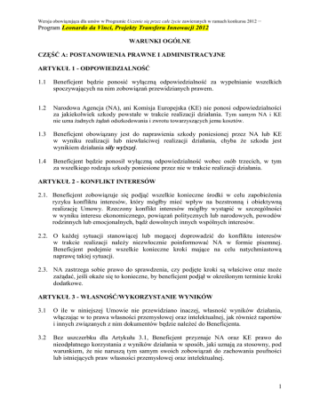 Wersja obowiązująca dla umów w Programie Uczenie się przez całe życie zawieranych w ramach konkursu 2012 – Program Leonardo da Vinci, Projekty Transferu Innowacji 2012 WARUNKI OGÓLNE CZĘŚĆ A: POSTANOWIENIA PRAWNE I ADMINISTRACYJNE ARTYKUŁ 1 - ODPOWIEDZIALNOŚĆ 1.1 Beneficjent będzie ponosić wyłączną odpowiedzialność za wypełnianie wszelkich spoczywających na nim zobowiązań przewidzianych prawem. 1.2 Narodowa Agencja (NA), ani Komisja Europejska (KE) nie ponosi odpowiedzialności za jakiekolwiek szkody powstałe w trakcie realizacji działania. Tym samym NA i KE nie uzna żadnych żądań odszkodowania i zwrotu towarzyszących jemu kosztów. 1.3 Beneficjent obowiązany jest do naprawienia szkody poniesionej przez NA lub KE w wyniku realizacji lub niewłaściwej realizacji działania, chyba że szkoda jest wynikiem działania siły wyższej. 1.4 Beneficjent będzie ponosił wyłączną odpowiedzialność wobec osób trzecich, w tym za wszelkiego rodzaju szkody poniesione przez nie w trakcie realizacji działania. ARTYKUŁ 2 - KONFLIKT INTERESÓW 2.1. Beneficjent zobowiązuje się podjąć wszelkie konieczne środki w celu zapobieżenia ryzyku konfliktu interesów, który mógłby mieć wpływ na bezstronną i obiektywną realizację Umowy. Rzeczony konflikt interesów mógłby wystąpić w szczególności w wyniku interesu ekonomicznego, powiązań politycznych lub narodowych, powodów rodzinnych lub emocjonalnych, bądź dowolnych innych wspólnych interesów. 2.2. O każdej sytuacji stanowiącej lub mogącej doprowadzić do konfliktu interesów w trakcie realizacji należy niezwłocznie poinformować NA w formie pisemnej. Beneficjent podejmie wszelkie konieczne kroki mające na celu natychmiastową naprawę takiej sytuacji. 2.3. NA zastrzega sobie prawo do sprawdzenia, czy podjęte kroki są właściwe oraz może zażądać, jeśli okaże się to konieczne, by beneficjent podjął w określonym terminie kroki dodatkowe. ARTYKUŁ 3 - WŁASNOŚĆ/WYKORZYSTANIE WYNIKÓW 3.1 O ile w niniejszej Umowie nie przewidziano inaczej, własność wyników działania, włączając w to prawa własności przemysłowej oraz intelektualnej, jak również raportów i innych związanych z nim dokumentów będzie należeć do Beneficjenta. 3.2 Bez uszczerbku dla Artykułu 3.1, Beneficjent przyznaje NA oraz KE prawo do nieodpłatnego korzystania z wyników działania w sposób, jaki uznają za stosowny, pod warunkiem, że nie naruszą tym samym swoich zobowiązań do zachowania poufności lub istniejących praw własności przemysłowej oraz intelektualnej. 1 Wersja obowiązująca dla umów w Programie Uczenie się przez całe życie zawieranych w ramach konkursu 2012 – Program Leonardo da Vinci, Projekty Transferu Innowacji 2012 ARTYKUŁ 4 - POUFNOŚĆ NA oraz Beneficjent zobowiązują się zachować poufność wszelkich dokumentów, informacji lub innych materiałów bezpośrednio związanych z przedmiotem Umowy, które zostaną należycie sklasyfikowane jako poufne, jeśli ich ujawnienie mogłoby spowodować poniesienie uszczerbku przez drugą stronę. Strony pozostaną związane tym postanowieniem również po dacie zakończenia działania. ARTYKUŁ 5 - UPUBLICZNIENIE INFORMACJI 5.1 O ile NA nie przedłoży odmiennego żądania, wszelkie komunikaty lub publikacje przekazywane bądź rozpowszechniane przez Beneficjenta w związku z działaniem, w tym na konferencjach lub seminariach, będą wskazywać, że działanie jest finansowane przez Unię Europejską (UE). Wszelkie komunikaty lub publikacje przekazywane bądź przez Beneficjenta, w każdej formie i na dowolnym nośniku, że wyłączna odpowiedzialność spoczywa na autorze, zaś NA, odpowiedzialna za żaden przypadek ewentualnego wykorzystania informacji. 5.2 rozpowszechniane będą wskazywać, ani KE nie jest zawartych w nich Beneficjent upoważnia NA oraz KE do publikowania następujących informacji, w dowolnej formie i na dowolnym nośniku, w tym w Internecie: – – – nazwiska i adresu Beneficjenta, przedmiotu i celu finansowania, przyznanego dofinansowania oraz proporcji jego udziału w pokryciu całkowitych kosztów działania. Na uzasadniony i należycie umotywowany wniosek Beneficjenta NA oraz KE może odstąpić od publikowania powyższych informacji, jeżeli ich ujawnienie naraziłoby na szwank bezpieczeństwo Beneficjenta lub jego interesy. ARTYKUŁ 6 - EWALUACJA W każdym przypadku, gdy NA oraz KE lub dowolna organizacja zewnętrzna upoważniona przez NA lub KE, będzie przeprowadzać cząstkową lub końcową ocenę rezultatów działania w zestawieniu z celami danego programu UE, Beneficjent zobowiązuje się udostępnić NA lub KE i/lub osobom przez nie upoważnionym wszelkich dokumentów lub informacji, w tym informacji w postaci elektronicznej, które umożliwią pomyślne przeprowadzenie ewaluacji oraz przyznać im prawa dostępu określone w Artykule 19. ARTYKUŁ 7 - ZAWIESZENIE WYKONANIA UMOWY 7.1 Beneficjent może zawiesić realizację działania jeśli w wyniku wyjątkowych okoliczności okaże się ona niemożliwa lub nadmiernie utrudniona, szczególnie w przypadkach działania siły wyższej. Beneficjent niezwłocznie, poinformuje o tym fakcie NA podając wszystkie przyczyny oraz informacje szczegółowe, jak również przewidywalną datę wznowienia realizacji działania. 2 Wersja obowiązująca dla umów w Programie Uczenie się przez całe życie zawieranych w ramach konkursu 2012 – Program Leonardo da Vinci, Projekty Transferu Innowacji 2012 7.2 Jeśli NA nie rozwiąże Umowy na podstawie Artykułu 11.2, Beneficjent wznowi realizację gdy tylko pozwolą na to okoliczności i poinformuje o tym NA. Czas trwania działania zostanie przedłużony o okres odpowiadający długości zawieszenia. Zgodnie z Artykułem 13 należy zawrzeć aneks do Umowy w celu przedłużenia okresu trwania działania oraz wprowadzenia wszelkich poprawek, które mogą okazać się konieczne w celu dostosowania dzia