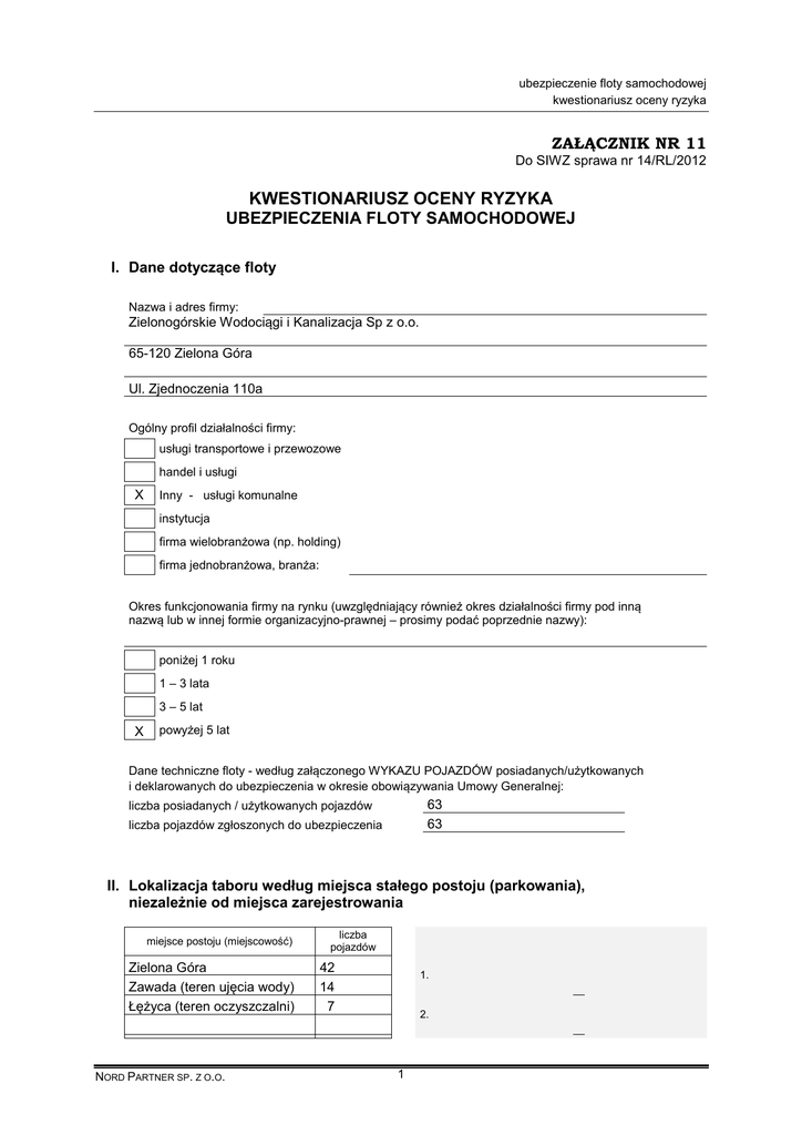 ubezpieczenie floty samochodowej kwestionariusz oceny ryzyka ZAŁĄCZNIK NR 11 Do SIWZ sprawa nr 14/RL/2012 KWESTIONARIUSZ OCENY RYZYKA UBEZPIECZENIA FLOTY SAMOCHODOWEJ I. Dane dotyczące floty Nazwa i adres firmy: Zielonogórskie Wodociągi i Kanalizacja Sp z o.o. 65-120 Zielona Góra Ul. Zjednoczenia 110a Ogólny profil działalności firmy: usługi transportowe i przewozowe handel i usługi X Inny - usługi komunalne instytucja firma wielobranżowa (np. holding) firma jednobranżowa, branża: Okres funkcjonowania firmy na rynku (uwzględniający również okres działalności firmy pod inną nazwą lub w innej formie organizacyjno-prawnej – prosimy podać poprzednie nazwy): poniżej 1 roku 1 – 3 lata 3 – 5 lat X powyżej 5 lat Dane techniczne floty - według załączonego WYKAZU POJAZDÓW posiadanych/użytkowanych i deklarowanych do ubezpieczenia w okresie obowiązywania Umowy Generalnej: 63 63 liczba posiadanych / użytkowanych pojazdów liczba pojazdów zgłoszonych do ubezpieczenia II. Lokalizacja taboru według miejsca stałego postoju (parkowania), niezależnie od miejsca zarejestrowania miejsce postoju (miejscowość) Zielona Góra Zawada (teren ujęcia wody) Łężyca (teren oczyszczalni) NORD PARTNER SP. Z O.O. liczba pojazdów 42 14 7 1. 2. 1 ubezpieczenie floty samochodowej kwestionariusz oceny ryzyka UWAGA! 3. RAZEM: 63 Prosimy o dodatkowe informacje o miejscach postoju poszczególnych grup pojazdów: III. Charakter użytkowania floty UWAGA! Przed wpisaniem danych prosimy o zapoznanie się ze wszystkimi pytaniami na tej stronie, gdyż dotyczą one całej floty. Wpisane przez Państwa dane odpowiadają udziałowi procentowemu liczby pojazdów wykorzystywanych do określonych celów w stosunku do liczby wszystkich pojazdów floty. Suma wpisanych przez Państwa udziałów procentowych wynosi 100%. udział procentowy w całej flocie wypełnia zakład ubezp. użytek własny 100 % 1. % 2. % 3. zaopatrzenie, wspomaganie produkcji % 4. wykorzystanie pojazdów specjalnych, np. dźwigi, cysterny % 5. wypożyczalnie % 6. nauka jazdy % 7. leasing % 8. przewóz osób – PKS, MZA, MZK, MPK itp. % 9. taxi % 10. przewóz / dystrybucja towarów lub usług % 11. usługi specjalne % 12. X cele służbowe samochody przeznaczone dla pracowników biurowych samochody przeznaczone dla pracowników administracyjnych samochody przeznaczone do celów reprezentacyjnych dystrybucja towarów i usług przy użyciu pojazdów osobowych i innych w nadwoziach pojazdów osobowych oraz samochodów dostawczych i ciężarowych o ładowności do 800 kg dystrybucja towarów i usług przy użyciu pojazdów innych, niż wymienione wyżej użytek zewnętrzny (usługowy) łącznie użytek własny i zewnętrzny NORD PARTNER SP. Z O.O. 100 2 % ubezpieczenie floty samochodowej kwestionariusz oceny ryzyka IV. Obszar eksploatacji pojazdów do użytku własnego według rejonu stałego użytkowania UWAGA! Podane poniżej kryteria dotyczą wyłącznie pojazdów wykorzystywanych do użytku własnego. Informacje o pojazdach użytkowanych w dwóch lub więcej strefach prosimy umieścić w odpowiednich polach proporcjonalnie do ich przebiegów / czasu eksploatacji w / na danym obszarze. Prosimy o wpisywanie informacji „kolumnami” odpowiadającymi grupom pojazdów – suma procentowych udziałów w każdej kolumnie wynosi 100%. Użytkowanie pojazdów danej grupy w poszczególnych strefach (udziały procentowe) grupy pojazdów strefy osobowe aglomeracyjna dostawcze autobusy i inne ciężarowe % % % % 13. % % % % 14. % % % % 15. % % % % 16. (użytkowanie pojazdów na terenie następujących miast: Warszawa, Trójmiasto, Łódź, Poznań, Wrocław) miejska (użytkowanie pojazdów na terenie miast powyżej 50.000 mieszkańców, z wyjątkiem miast wymienionych powyżej) pozamiejska (użytkowanie pojazdów na terenie Polski poza obszarami wymienionymi powyżej) międzynarodowa (użytkowanie pojazdów również poza terytorium Polski) 100 % 100 % 100 100 % % Opis zasięgu użytkowania floty: Użytkowanie pojazdów na terenie miasta i gminy Zielona Góra - powiat Zielonogórski. V. Kierowcy 17. Czy firma dopuszcza użytkowanie pojazdów przez pracowników poniżej 25 roku życia? Tak Czy firma dopuszcza użytkowanie pojazdów przez pracowników posiadających stosowne uprawnienia krócej, niż 3 lata? tak X nie 18. nie Informacje uzupełniające o wymogach stawianych kierowcom (wiek, doświadczenie itp.): Dla kierowców pojazdów o DMC >3,5 Mg wymagania zgonie z ustawą o transporcie drogowym NORD PARTNER SP. Z O.O. 3 X ubezpieczenie floty samochodowej kwestionariusz oceny ryzyka VI. Procedury 19. Czy w firmie stosowany jest system nagród / kar za bezwypadkową / wypadkową jazdę? tak X nie Opis: 20. Czy stosowane są szczególne wymogi dotyczące parkowania pojazdów poza godzinami pracy? tak X nie Opis: Czy wszystkie powypadkowe naprawy pojazdów dokonywane będą we własnym warsztatach lub warsztatach akceptowanych przez zakład ubezpieczeń ? 21. tak X nie Opis: VII. Wnioskowane warunki ubezpieczenia floty Opcje ubezpieczenia: X opcja I: Umowa Generalna na bazie stałych okresów ubezpieczenia opcja II: Umowa Generalna na bazie zmiennych okresów ubezpieczenia OC – suma gwarancyjna: X podstawowa podwyższona do sumy: dla pojazdów: ZK: Zielona Karta roczna dla pojazdów wskazanych na wykazie pojazdów. NORD PARTNER SP. Z O.O. 4 tak nie X ubezpieczenie floty samochodowej kwestionariusz oceny ryzyka AC: Wariant ubezpieczenia AC naprawa pojazdu odbywa się w autoryzowanym warsztacie a wypłata rachunków odszkodowania następuje poprzez zwrot poniesionych kosztów na podstawie rachunku z warsztatu zatwierdzonych przez zakład ubezp. X Wypłata odszkodowania na podstawie kosztorysu sporządzonego przez ubezpieczyciela Zniesiona amortyzacja części Zniesienie stosowania udziału własnego w szkodzie tak Odstąpienie od zmniejszenia sumy ubezpieczenia po każdej wypłacie odszkodowania (nie wymaga doubezpieczenia, tj. płat