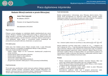 Praca dyplomowa inżynierska Badanie filtracji zawiesin w prasie filtracyjnej Autor: Piotr Gajewski Nr albumu: 253273 Część doświadczalna Badania przeprowadzono wykorzystując prasę filtracyjną płytowo-ramową firmy Schenk. Przed przystąpieniem do właściwych badań filtracji wykonano wstępne badania pracy pompy przy ustawieniu trybu pracy przy stałej wydajności. Na podstawie tych badań wyznaczono współczynniki przeliczeniowe nastaw pompy. 4 Promotor: dr inż. Bogumiła Wrzesińska Spadek ciśnienia [bar] 3,5 Rok akademicki: 2015/2016 Wprowadzenie Filtracja to proces polegający na rozdzielaniu układów niejednorodnych przy użyciu warstwy filtrującej. Działanie przegród filtracyjnych polega na zatrzymywaniu ciała stałego obecnego w zawiesinie, a przepuszczaniu cieczy. Proces filtracji zawiesin jest szeroko rozpowszechniony i ma duże znaczenie w przemyśle. Zalazł on zastosowanie w wielu dziedzinach, między innymi w oczyszczaniu ścieków komunalnych lub przemysłowych, przemyśle naftowym, chemicznym, czy spożywczym. 3 dV/dτ=0,2dm^3/s 2,5 dV/dτ=0,4dm^3/s 2 1,5 1 0,5 0 0 100 200 300 400 Cel i zakres pracy Część teoretyczna W tej części pracy przedstawione zostały teoretyczne podstawy badanego zagadnienia. Dokonano podziału sposobów prowadzenia filtracji, przegród filtracyjnych oraz aparatów wykorzystywanych do rozdzielania układów niejednorodnych. Przedstawiono również wpływ substancji pomocniczych na proces filtracji zawiesin. 600 Czas filtracji [s] Rys.1. Zależność spadku ciśnienia od czasu filtracji ze stałą szybkością Celem pracy było zbadanie procesu filtracji zawiesiny kredy w prasie filtracyjnej płytowo-ramowej, ze szczególnym uwzględnieniem filtracji ze stałą szybkością. Zakres prac eksperymentalnych obejmował: - badania wstępne, mające na celu wyznaczenie charakterystyki przepływowej pompy zawiesiny, - przeprowadzenie filtracji pod stałym ciśnieniem, - przeprowadzenie filtracji ze stałą szybkością, - przemywanie wydzielonego osadu, - opracowanie wyników badań eksperymentalnych, - przygotowanie materiałów edukacyjnych w formie prezentacji multimedialnej. 500 dV dτ dm3 =0,2 s i dV dτ dm3 =0,4 s Filtracji poddawano zawiesinę wodną kredy o stężeniu ok. 1%mas., z dodatkiem soli NaCl o stężeniu ok. 0,5%mas.. Część doświadczalna obejmowała wykonanie filtracji pod stałym ciśnieniem, filtracji ze stałą szybkością oraz przemywania osadu. Na podstawie badań eksperymentalnych opracowano wykresy zależności: objętości filtratu od czasu, odwrotności szybkości filtracji od objętości filtratu oraz przewodnictwa popłuczyn od czasu płukania. Ponadto wyznaczono stałe filtracyjne, współczynnik ściśliwości osadu i objętość cieczy myjącej niezbędnej do przemycia osadu. Wnioski • • • • Podczas wykonywania wszystkich pomiarów otrzymano klarowny filtrat oraz zwarty osad. Grubość placka filtracyjnego rosła wraz z postępem filtracji, Podczas filtracji pod stałym ciśnieniem spadała szybkość filtracji, co było związane z rosnącym oporem wydzielonego na filtrze osadu, W filtracji ze stałą szybkością rosnąca różnica ciśnień na prasie filtracyjnej wynikała ze wzrostu grubości osadu filtracyjnego, Przewodnictwo popłuczyn malało wraz z postępem przemywania osadu. Stwierdzono charakterystyczny „esowaty’’ przebieg krzywych przemywania.