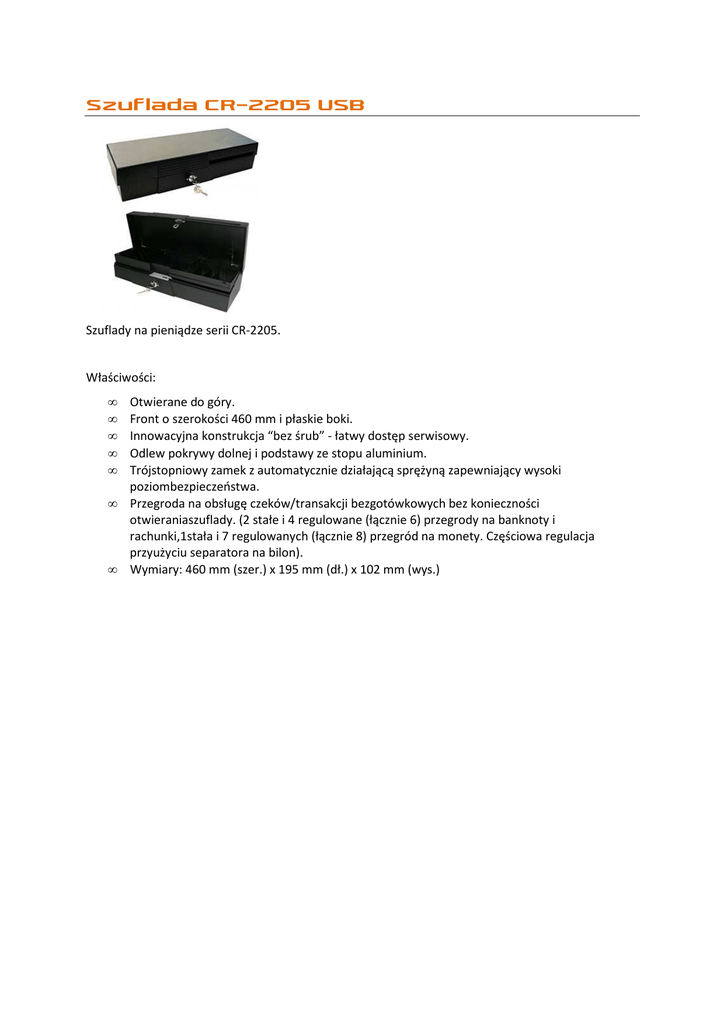 Szuflada CR-2205 USB Szuflady na pieniądze serii CR-2205. Właściwości: • • • • • • • Otwierane do góry. Front o szerokości 460 mm i płaskie boki. Innowacyjna konstrukcja “bez śrub” - łatwy dostęp serwisowy. Odlew pokrywy dolnej i podstawy ze stopu aluminium. Trójstopniowy zamek z automatycznie działającą sprężyną zapewniający wysoki poziombezpieczeństwa. Przegroda na obsługę czeków/transakcji bezgotówkowych bez konieczności otwieraniaszuflady. (2 stałe i 4 regulowane (łącznie 6) przegrody na banknoty i rachunki,1stała i 7 regulowanych (łącznie 8) przegród na monety. Częściowa regulacja przyużyciu separatora na bilon). Wymiary: 460 mm (szer.) x 195 mm (dł.) x 102 mm (wys.)