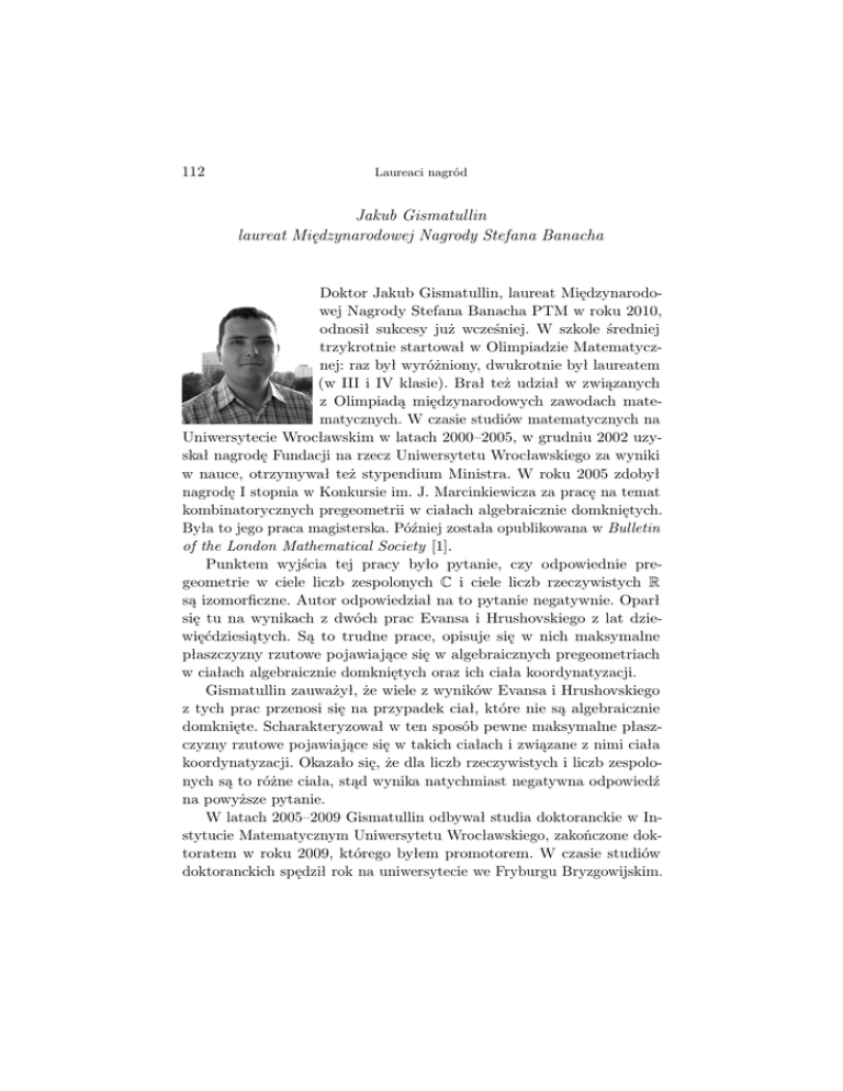112 Laureaci nagród Jakub Gismatullin laureat Międzynarodowej Nagrody Stefana Banacha Doktor Jakub Gismatullin, laureat Międzynarodowej Nagrody Stefana Banacha PTM w roku 2010, odnosił sukcesy już wcześniej. W szkole średniej trzykrotnie startował w Olimpiadzie Matematycznej: raz był wyróżniony, dwukrotnie był laureatem (w III i IV klasie). Brał też udział w związanych z Olimpiadą międzynarodowych zawodach matematycznych. W czasie studiów matematycznych na Uniwersytecie Wrocławskim w latach 2000–2005, w grudniu 2002 uzyskał nagrodę Fundacji na rzecz Uniwersytetu Wrocławskiego za wyniki w nauce, otrzymywał też stypendium Ministra. W roku 2005 zdobył nagrodę I stopnia w Konkursie im. J. Marcinkiewicza za pracę na temat kombinatorycznych pregeometrii w ciałach algebraicznie domkniętych. Była to jego praca magisterska. Później została opublikowana w Bulletin of the London Mathematical Society [1]. Punktem wyjścia tej pracy było pytanie, czy odpowiednie pregeometrie w ciele liczb zespolonych C i ciele liczb rzeczywistych R są izomorficzne. Autor odpowiedział na to pytanie negatywnie. Oparł się tu na wynikach z dwóch prac Evansa i Hrushovskiego z lat dziewięćdziesiątych. Są to trudne prace, opisuje się w nich maksymalne płaszczyzny rzutowe pojawiające się w algebraicznych pregeometriach w ciałach algebraicznie domkniętych oraz ich ciała koordynatyzacji. Gismatullin zauważył, że wiele z wyników Evansa i Hrushovskiego z tych prac przenosi się na przypadek ciał, które nie są algebraicznie domknięte. Scharakteryzował w ten sposób pewne maksymalne płaszczyzny rzutowe pojawiające się w takich ciałach i związane z nimi ciała koordynatyzacji. Okazało się, że dla liczb rzeczywistych i liczb zespolonych są to różne ciała, stąd wynika natychmiast negatywna odpowiedź na powyższe pytanie. W latach 2005–2009 Gismatullin odbywał studia doktoranckie w Instytucie Matematycznym Uniwersytetu Wrocławskiego, zakończone doktoratem w roku 2009, którego byłem promotorem. W czasie studiów doktoranckich spędził rok na uniwersytecie we Fryburgu Bryzgowijskim. Laureaci nagród 113 Jego rozprawa doktorska związana jest z trudnym problemem konstrukcji nowych przykładów teorii nie-G-zwartych. Pojęcie teorii G-zwartej wprowadził Daniel Lascar w roku 1982 w pracy [8]. Lascar rozważał relacje równoważności określone na modelu teorii T, niezmiennicze względem automorfizmów modelu i z ograniczoną liczbą klas abstrakcji. Najdrobniejsza z tych relacji zwana jest równością silnych typów Lascara. Pojęcie to znalazło zastosowanie w latach dziewięćdziesiątych XX wieku w przypadku teorii prostych. Tam równość silnych typów Lascara jest typowo definiowalna, tzn. relacja ta jest definiowalna przy pomocy koniunkcji pewnej liczby formuł. Wtedy właśnie mówimy, że teoria jest G-zwarta. Pierwszy i dotychczas w zasadzie jedyny przykład teorii nie-G-zwartej podał Martin Ziegler z uniwersytetu we Fryburgu w artykule [7]. Struktura silnych typów Lascara została w dużej mierze wyjaśniona w pracy [9]. Jakub Gismatullin powiązał konstrukcję nowego przykładu teorii nie-G-zwartej z innym otwartym problemem teorii modeli: konstrukcją grupy G, w której typowo spójna składowa G00 jest większa od niezmienniczo spójnej składowej G∞. Przez G00 i G∞ oznaczamy najmniejsze podgrupy grupy G ograniczonego indeksu, które są odpowiednio: typowo definiowalne i niezmiennicze na automorfizmy modelu. Gismatullin odkrył oryginalną i obiecującą drogę konstrukcji grupy G, gdzie G00 6= G∞, uzyskując na tej drodze istotny postęp. Zaproponowana przez niego metoda konstrukcji opiera się na planie konstrukcji grupy z niezmienniczo spójną składową generowaną w nieskończenie wielu krokach. Gismatullin wprowadził i zbadał kilka własnych oryginalnych kombinatorycznych pojęć związanych z grupami, takich jak na przykład absolutna spójność. W ten sposób zredukował problem z teorii modeli do problemu z algebry. Warto podkreślić, że przy okazji wzmocnił znacznie niedawny wynik Shelaha na ten temat. Mianowicie Shelah udowodnił w artykule [10], że w przypadku grup abelowych z teorią z własnością NIP , niezmienniczo spójne składowe takich grup istnieją. Gismatullin udowodnił to samo, ale bez założenia abelowości. Wynik ten wzbudził żywe zainteresowanie wśród specjalistów. Gismatullin zbadał też szczegółowo szereg przypadków konkretnych grup (takich jak pewne grupy algebraiczne, grupy pojawiające się w geometrii) pod kątem rozważanych przezeń własności kombinatorycznych. Wyniki z rozprawy doktorskiej zostały opublikowane w killku pracach [2, 4, 6]. Powstały też kolejne prace w tym kierunku [3, 5]. 114 Laureaci nagród Od jesieni 2010 roku Jakub Gismatullin przebywa na uniwersytecie w Leeds, na stypendium Marii Curie. Z ośrodkiem tym związana jest silna grupa specjalistów z teori modeli, z Dugaldem Macphersonem i Anandem Pillayem na czele. Ludomir Newelski (Wrocław) Cytowane prace laureata [1] Combinatorial geometries of field extensions, Bull. Lond. Math. Soc. 40 (2008), no. 5, 789–800. [2] Model theoretic connected components of groups, przyjęta (sierpień 2009) do Israel Journal of Mathematics. [3] Boundedly simple groups of automorphisms of trees, wysłana (wrzesień 2009). [4] Absolute connectedness of the classical groups, wysłana (luty 2010). [5] Bounded simplicity and absolute connectedness of isotropic groups, wysłana. [6] G-compactness and groups, Arch. Math. Logic 47 (2008), no. 5, 479–501 (współautor: L. Newelski). Cytowane prace innych autorów [7] E. Casanovas, D. Lascar, A. Pillay, M. Ziegler, Galois groups of first order theories, J. Math. Log. 1 (2001), no. 2, 305–319. [8] D. Lascar, On the category of models of a complete theory, J. Symbolic Logic 47 (1982), no. 2, 249–266. [9] L. Newelski, The diameter of a Lascar strong type, Fund. Math. 176 (20