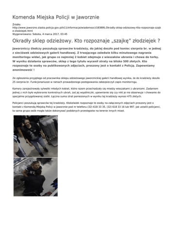 Komenda Miejska Policji w Jaworznie Źródło: http://www.jaworzno.slaska.policja.gov.pl/k11/informacje/wiadomosci/183895,Okradly-sklep-odziezowy-Kto-rozpoznaje-szajk e-zlodziejek.html Wygenerowano: Sobota, 4 marca 2017, 03:45 Okradły sklep odzieżowy. Kto rozpoznaje „szajkę” złodziejek ? Jaworzniccy śledczy poszukują sprawców kradzieży, do jakiej doszło pod koniec sierpnia br. w jednej z sieciówek odzieżowych galerii handlowej. Z trwającego zaledwie kilku minutowego nagrania monitoringu widać, jak grupa co najmniej 2 kobiet zdejmuje z wieszaków ubrania i chowa do torby. W wyniku działania sprawców, sklep z tego tytułu wycenił straty na blisko 500 złotych. Kto rozpoznaje te osoby na publikowanych zdjęciach, proszony jest o kontakt z Policją. Zapewniamy anonimowość ! Ze zgłoszenia przyjętego od pracownika sklepu odzieżowego jaworznickiej galerii handlowej wynika, że do kradzieży doszło 25 sierpnia br. Funkcjonariusze w ramach prowadzonego postępowania zabezpieczyli zapis monitoringu. Kamery zarejestrowały sylwetki młodych kobiet, które razem przechadzały się miedzy wieszakami z ubraniami. Zadaniem jednej z nich było wybieranie konkretnych ubrań, zaś jej wspólniczki, upewnienie się czy nikt je nie obserwuje i chowanie do specjalnie przygotowanej siatki. Łączna suma strat poniesionych w wyniku tej kradzieży wynosi 475 złotych. Policjanci poszukują sprawców tej kradzieży. Ktokolwiek rozpoznaje te osoby na załączonych zdjęciach proszony jest o kontakt z Komendą Miejską Policji w Jaworznie pod nr telefonu (32) 618 33 35, (32) 618 33 16 lub 997. Jak ustalili policjanci, ta sama grupa osób mogła także dokonywać podobnych przestępstw na terenie innych miast. Ocena: 5/5 (1) Tweetnij
