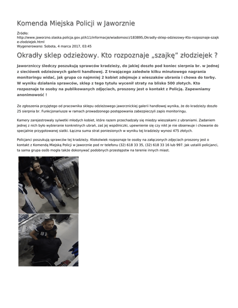 Komenda Miejska Policji w Jaworznie Okradły sklep odzieżowy. Kto