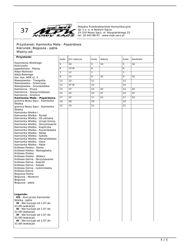 Miejskie Przedsiębiorstwo Komunikacyjne Sp. z o. o. w Nowym Sączu 33-310 Nowy Sącz, ul. Wyspiańskiego 22 tel. 18 443 88 97 www.mpk.sacz.pl 37 Przystanek: Kamionka Mała - Popardowa Kierunek: Bogusza - pętla Ważny od: Przystanki Kazimierza Wielkiego Kościuszki Jagiellońska - Planty Aleja Wolności Aleja Batorego Dw. Aut. MPK st. 3 Nawojowska - Traugutta Nawojowska - Graniczna Nawojowska - Grunwaldzka Kamienna - Prusa Kamienna - Stacja kolejowa Kamienna - Granica Kamionka Mała - Popardowa granica Nowy Sącz - Kamionka Wielka granica Nowy Sącz - Kamionka Wielka Kamionka Wielka I Kamionka Wielka - Rynek Kamionka Wielka - Oś.zdrowia Kamionka Wielka - Urząd Gminy Kamionka Wielka - Skrzyżowanie Kamionka Wielka - Kapliczka Kamionka Wielka - Kocembówka Kamionka Wielka - Sklep Kamionka Wielka - Szkoła Kamionka Wielka - Morańskówka Kamionka Wielka - Góra Kamionka Wielka - Pętla Królowa Polska - Dolna Królowa Polska - Basiagówka Królowa Polska Królowa Polska - Widacz Królowa Górna - Skrzyżowanie Królowa Górna - Kościół Królowa Górna - Szkoła Królowa Górna - Leśniczówka Królowa Górna Bogusza Dolna Bogusza - Muzeum Bogusza Bogusza - pętla Godz Dni robocze Godz Soboty Godz Niedziele 5 24 5 16 5 16 6 23 W 6 6 7 17 7 7 9 22 9 11 12 11 12 47 W 12 13 27 13 42 13 42 15 32 15 47 15 47 17 22 17 52 17 52 19 30 19 19 21 33 21 21 32 9 32 11 12 Legenda: KG - Kurs przez Kamionkę Wielką - pętla W - Nie kursuje od 1.07 do 31.08 (wakacje) W - Nie kursuje od 1.07 do 31.08 (wakacje) W - Nie kursuje od 1.07 do 31.08 (wakacje) W - Nie kursuje od 1.07 do 31.08 (wakacje) 1/1 Powered by TCPDF (www.tcpdf.org)