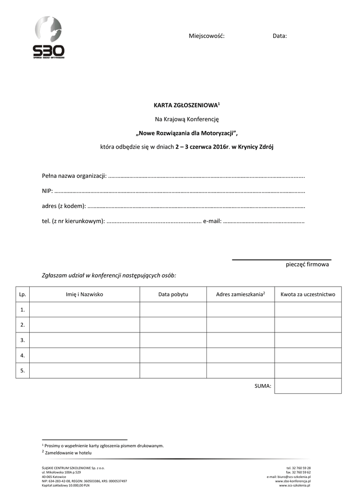 Miejscowość: Data: KARTA ZGŁOSZENIOWA1 Na Krajową Konferencję „Nowe Rozwiązania dla Motoryzacji”, która odbędzie się w dniach 2 – 3 czerwca 2016r. w Krynicy Zdrój Pełna nazwa organizacji: ..…………………………………………………………………..……………………………………......... NIP: ………………………………………………………………………………………………………………………………………………….. adres (z kodem): ………………………………………………………………………………………………………………………………. tel. (z nr kierunkowym): .......................................................... e-mail: ………………………………….………….. pieczęć firmowa Zgłaszam udział w konferencji następujących osób: Lp. Imię i Nazwisko Data pobytu Adres zamieszkania2 Kwota za uczestnictwo 1. 2. 3. 4. 5. SUMA: 1 2 Prosimy o wypełnienie karty zgłoszenia pismem drukowanym. Zameldowanie w hotelu ŚLĄSKIE CENTRUM SZKOLENIOWE Sp. z o.o. ul. Mikołowska 100A p.529 40-065 Katowice NIP: 634-283-42-08, REGON: 360503386, KRS: 0000537497 Kapitał zakładowy 10.000,00 PLN tel. 32 760 59 28 fax. 32 760 59 62 e-mail: [email protected] www.sbo-konferencja.pl www.scs-szkolenia.pl Opłaty za uczestnictwo: 1 750,00 zł netto – dwudniowe uczestnictwo w Konferencji (udział w prelekcjach, jeden nocleg wraz z wyżywieniem, serwis konferencyjny, impreza towarzysząca, materiały konferencyjne, udział w warsztatach), 950,00 zł netto – jednodniowe uczestnictwo w Konferencji (udział w prelekcjach, serwis konferencyjny, materiały konferencyjne), 380,00 zł netto – dodatkowy nocleg ze śniadaniem, 900,00 zł netto – prezentacja/referat, 2 500,00 zł netto – stoisko wystawowe, 500,00 zł netto – sesja plakatowa. Do podanych kwot netto zostanie naliczony podatek VAT w wysokości 23%. Łączną należność za udział w konferencji w wysokości ................................ zł netto przekazaliśmy na konto: Śląskiego Centrum Szkoleniowego - 09 2490 0005 0000 4520 9223 0852 – Alior Bank Prosimy o zabranie ważnego dokumentu tożsamości (paszport lub dowód osobisty). Prosimy o odesłanie wypełnionej karty zgłoszeniowej w terminie 2 – 3 dni od daty otrzymania formularza. Ze względu na ograniczoną ilość miejsc decydować będzie kolejność zgłoszeń. Po otrzymaniu zamówienia, Śląskie Centrum Szkoleniowe zobowiązuje się do przesłania faktury VAT. Integralną część zgłoszenia stanowi podpisany regulamin Konferencji. Upoważniam firmę Śląskie Centrum Szkoleniowe do wystawienia faktury VAT bez podpisu odbiorcy. Podpis osoby upoważnionej* ŚLĄSKIE CENTRUM SZKOLENIOWE Sp. z o.o. ul. Mikołowska 100A p.529 40-065 Katowice NIP: 634-283-42-08, REGON: 360503386, KRS: 0000537497 Kapitał zakładowy 10.000,00 PLN tel. 32 760 59 28 fax. 32 760 59 62 e-mail: [email protected] www.sbo-konferencja.pl www.scs-szkolenia.pl *Osoby uprawnione do reprezentowania zgodnie z odpisem z KRS lub z wpisem do Centralnej Ewidencji i Informacji o Działalności Gospodarczej. ŚLĄSKIE CENTRUM SZKOLENIOWE Sp. z o.o. ul. Mikołowska 100A p.529 40-065 Katowice NIP: 634-283-42-08, REGON: 360503386, KRS: 0000537497 Kapitał zakładowy 10.000,00 PLN tel. 32 760 59 28 fax. 32 760 59 62 e-mail: [email protected] www.sbo-konferencja.pl www.scs-szkolenia.pl