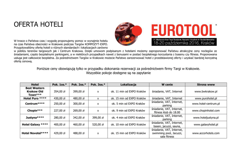 OFERTA HOTELI W trosce o Państwa czas i wygodę proponujemy pomoc w wynajmie hotelu na czas Państwa obecności w Krakowie podczas Targów KOMPOZYT-EXPO. Przygotowaliśmy ofertę hoteli o różnych standardach i lokalizacjach zarówno w pobliżu terenów targowych jak i Centrum Krakowa. Dzięki umowom podpisanym z hotelami możemy zaproponować Państwu atrakcyjne ceny noclegów ze śniadaniami, często bezpłatnymi parkingami, a w niektórych przypadkach nawet z bonusami w postaci bezpłatnego korzystania z basenu czy fitness. Proponowana usługa jest całkowicie bezpłatna. Za pośrednictwem Targów w Krakowie możecie Państwo zarezerwować hotel z przedstawionej oferty i uzyskać bardziej korzystną ofertę cenową. Poniższe ceny obowiązują tylko w przypadku dokonania rezerwacji za pośrednictwem firmy Targi w Krakowie. Wszystkie pokoje dostępne są na zapytanie Hotel Best Western Krakow Old Town*** Hotel Puro **** Pok. 1os.* Pok. 2os.* Pok. 3os.* Lokalizacja W cenie Strona www 354,00 zł 399,00 zł x ok. 11 min od EXPO Kraków śniadanie, VAT, Internet www.bwkrakow.pl 430,00 zł 480,00 zł x ok. 15 min od EXPO Kraków www.purohotel.pl Centrum**** 250,00 zł 300,00 zł x ok. 5 min od EXPO Kraków Chopin*** 227,00 zł 269,00 zł x ok. 9 min od EXPO Kraków Justyna**** 280,00 zł 342,00 zł 399,00 zł ok. 4 min od EXPO Kraków Hotel Galaxy **** 400,00 zł 460,00 zł 520,00 zł ok. 10 min od EXPO Kraków Hotel Novotel**** 429,00 zł 488,00 zł x ok. 15 min od EXPO Kraków śniadanie, VAT, Internet śniadanie, VAT, Internet, parking śniadanie, VAT, Internet, fitness klub do 18.00 śniadanie, VAT, Internet, parking śniadanie, VAT, Internet, basen, jacuzzi, sauna, śniadanie, VAT, Internet, swimming pool, Jacuzzi, sala fitness www.hotel-centrum.pl www.chopinhotel.com www.hoteljustyna.pl www.galaxyhotel.pl www.accorhotels.com Krakus Junior*, pokoje z łazienkami 116,00 zł 165,00 zł 229,00 zł ok. 3 min od EXPO Kraków śniadanie, VAT, Internet, dowóz na Targi www.turystyka-krakus.com.pl Krakus *** 244,00 zł 280,00 zł x ok. 3 min od EXPO Kraków śniadanie, VAT, Internet, dowóz na Targi www.turystyka-krakus.com.pl 171,00 zł 218,00 zł 280,00 zł ok. 3 min od EXPO Kraków śniadanie, VAT, Internet www.hotel-krakus.com.pl 250,00 zł 300,00 zł 390,00 zł ok. 15 min od EXPO Kraków www.hotelmaksymilian.pl Hotel Swing *** 290,00 zł 320,00 zł x ok. 10 min od EXPO Kraków Hotel Leopolis*** Hotel Wielopole *** Hotel Maksymilian *** RT Regent*** 160,00 zł 240,00 zł x ok. 20 min od EXPO Kraków śniadanie, VAT, Internet śniadanie, VAT, Internet, Centrum rekreacji, voucher do Aqua Parku (1 godzina) śniadanie, VAT, Internet 329,00 zł 429,00 zł x ok. 15 min od EXPO Kraków śniadanie, VAT, Internet www.wielopole.pl 270,00 zł 310,00 zł 360,00 zł ok 15 min od EXPO Kraków śniadanie, VAT, Internet www.hotelmaksymilian.pl 204,00 zł 249,00 zł x ok. 12 min od EXPO Kraków śniadanie, VAT, Internet www.rthotels.com.pl Krakus***, pokoje Economic Hotel B.A.S *** www.hotelswing.pl www.leopolis.com.pl W celu dokonania rezerwacji w jednym z hoteli znajdujących się w naszej ofercie, prosimy o kontakt z Panią Agnieszką Otwinowską: tel.: +4812 651 90 45, email: [email protected] Po otrzymaniu od nas potwierdzenia rezerwacji stajecie się Państwo klientem wybranego hotelu i ponosicie całkowitą odpowiedzialność finansową za dokonaną za naszym pośrednictwem rezerwację.