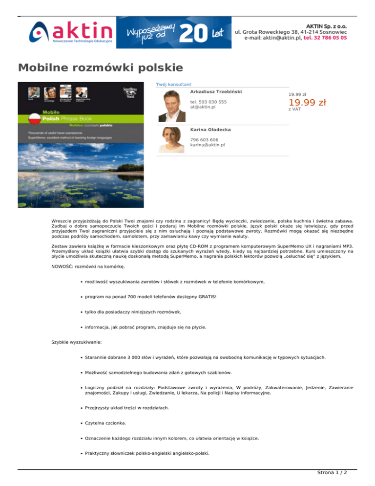 Mobilne rozmówki polskie Twój konsultant Arkadiusz Trzebiński tel. 503 030 555 [email protected] NOWOŚĆ W OFERCIE 19.99 zł 19.99 zł z VAT Karina Gładecka 796 603 606 [email protected] Wreszcie przyjeżdżają do Polski Twoi znajomi czy rodzina z zagranicy! Będą wycieczki, zwiedzanie, polska kuchnia i świetna zabawa. Zadbaj o dobre samopoczucie Twoich gości i podaruj im Mobilne rozmówki polskie. Język polski okaże się łatwiejszy, gdy przed przyjazdem Twoi zagraniczni przyjaciele się z nim osłuchają i poznają podstawowe zwroty. Rozmówki mogą okazać się niezbędne podczas podróży samochodem, samolotem, przy zamawianiu kawy czy wymianie waluty. Zestaw zawiera książkę w formacie kieszonkowym oraz płytę CD-ROM z programem komputerowym SuperMemo UX i nagraniami MP3. Przemyślany układ książki ułatwia szybki dostęp do szukanych wyrażeń wtedy, kiedy są najbardziej potrzebne. Kurs umieszczony na płycie umożliwia skuteczną naukę doskonałą metodą SuperMemo, a nagrania polskich lektorów pozwolą „osłuchać się” z językiem. NOWOŚĆ: rozmówki na komórkę. możliwość wyszukiwania zwrotów i słówek z rozmówek w telefonie komórkowym, program na ponad 700 modeli telefonów dostępny GRATIS! tylko dla posiadaczy niniejszych rozmówek, informacja, jak pobrać program, znajduje się na płycie. Szybkie wyszukiwanie: Starannie dobrane 3 000 słów i wyrażeń, które pozwalają na swobodną komunikację w typowych sytuacjach. Możliwość samodzielnego budowania zdań z gotowych szablonów. Logiczny podział na rozdziały: Podstawowe zwroty i wyrażenia, W podróży, Zakwaterowanie, Jedzenie, Zawieranie znajomości, Zakupy i usługi, Zwiedzanie, U lekarza, Na policji i Napisy informacyjne. Przejrzysty układ treści w rozdziałach. Czytelna czcionka. Oznaczenie każdego rozdziału innym kolorem, co ułatwia orientację w książce. Praktyczny słowniczek polsko-angielski angielsko-polski. Strona 1 / 2 Skuteczna nauka: Doskonały program komputerowy SuperMemo UX do nauki słownictwa zawartego w książce. Pozwala opanować cały materiał rozmówek nawet w ciągu jednego miesiąca dzięki genialnej metodzie optymalizacji powtórek. Pliki MP3 z nagraniami wszystkich słów i wyrażeń, wykonane przez profesjonalnych lektorów polskich i chińskich. Można je wgrać na odtwarzacz MP3, iPod®, komórkę lub komputer, aby słuchać i powtarzać w dowolnej chwili. Ponad 7 godzin nagrań! Prosty przewodnik ułatwiający zapamiętywanie uznaną metodą SuperMemo, do wykorzystania bez użycia komputera. Wymagania sprzętowe programu: Procesor 400 MHz, 256 MB RAM, CD-ROM, karta dźwiękowa, mikrofon, Windows 2000 SP3, XP lub Vista. Wymagania sprzętowe dla nagrań MP3: dowolny odtwarzacz MP3. Informacje dodatkowe: 232 strony, 14 x 10 cm, oprawa miękka, lakierowana. Strona 2 / 2 Powered by TCPDF (www.tcpdf.org)