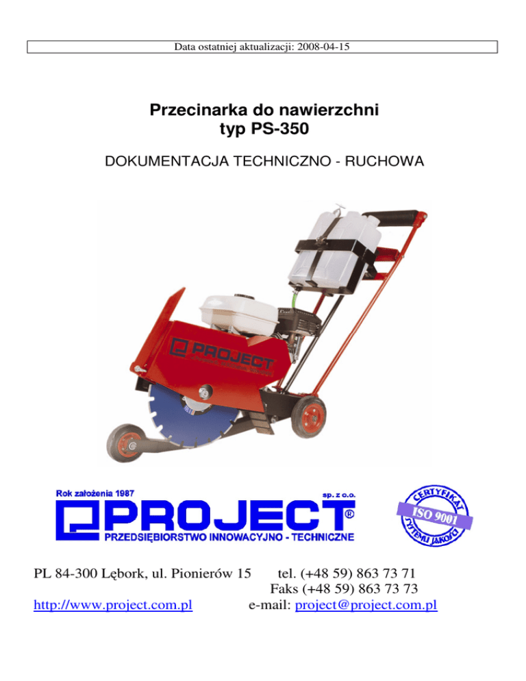 Data ostatniej aktualizacji: 2008-04-15 Przecinarka do nawierzchni typ PS-350 DOKUMENTACJA TECHNICZNO - RUCHOWA PL 84-300 Lębork, ul. Pionierów 15 http://www.project.com.pl tel. (+48 59) 863 73 71 Faks (+48 59) 863 73 73 e-mail: [email protected] 1 SPIS TREŚCI: UWAGI, OZNAKOWANIE ………………………………………………. 1. ZAKRES I WARUNKI STOSOWANIA PRZECINARKI …………….. 2. CHARAKTERYSTYKA ……………………………………………….. 3. OPIS TECHNICZNY ……………………………………........................ 3.1. Ogólny opis budowy i działania ………………………………………. 3.2. Zespoły ………………………………………………………………... 4. OBSŁUGA PRZECINARKI …………………………………………… 4.1. Dopuszczalny czas pracy ………………………………....................... 4.2. Warunki pierwszego uruchomienia ……………………........................ 4.3. Przygotowanie przecinarki do pracy ………………………………….. 4.4. Obsługa przecinarki ……………………………………....................... 4.5. Obsługa przecinarki po pracy ………………………………………… 5. PRZECHOWYWANIE …………………………………………………. 6. TRANSPORT ……………………………………………....................... 7. PRZEGLĄDY ……………………………………………....................... 8. REGULACJA ……………………………………………....................... 8.1. Regulacja naciągu paska klinowego ………………………………….. 8.2. Regulacja silnika ……………………………………………………… 9. KONSERWACJA ………………………………………………………. 9.1. Konserwacja silnika ……………………………………....................... 9.2. Wymiana oleju w silniku ………………………………....................... 10. PRZEPISY BHiP ……………………………………………………… 10.1. Hałas ………………………………………………………………… 10.2. Maksymalny poziom dźwięku A ……………………………………. 10.3. Szczytowy poziom dźwięku C ………………………………………. 10.4. Drgania ………………………………………………………………. 10.5. Zalecenia ogólne ...……………………………………....................... 11. WYPOSAśENIE ……………………………………………………… TABELA ZABIEGÓW KONSERWACYJNYCH ……………………….. GWARANCJA JAKOŚCI ……….. ………………………………………. 2 3 3 3 3 5 7 7 7 7 9 10 10 10 11 11 11 12 12 12 13 13 13 13 13 13 13 13 14 15 2 OZNAKOWANIE Pracownik obsługujący maszynę powinien posiadać indywidualne ochronniki słuchu o skuteczności wytłumiania dźwięku powyŜej 10 dB. Gwarantowany poziom mocy akustycznej zgodnie z Dyrektywą 2000/14/EC wynosi 107 dB(A). UWAGA ! 1. 2. 3. 4. 5. Zabrania się pracować maszyną przy innej częstotliwości wibracji, niŜ wynikającej z obrotów nominalnych silnika. Obroty te są fabrycznie ustawione na 3600 obr./min., ograniczone od góry i zaplombowane. Zmiana częstotliwości pracy grozi uszkodzeniem maszyny, utratą gwarancji, a nawet utratą zdrowia. Pracownik obsługujący maszyną powinien kierować nią trzymając za rękojeść antywibracyjną dyszla. W trakcie przerw w pracy oraz po jej zakończeniu naleŜy bezwzględnie zamykać kurek dopływu paliwa ! Ze względu na moŜliwość uszkodzenia maszyny nie naleŜy jej uruchamiać w temperaturach otoczenia poniŜej 0oC lub powyŜej +40oC. Dopu8sczczalne pochylenie maszyny wynosi: 15o – w płaszczyźnie „przód – tył” 20o – w płaszczyźnie „na boki” 3 1. ZAKRES I WARUNKI STOSOWANIA PRZECINARKI Przecinarka typ PS-350 przeznaczona jest do prac przy remontach dróg o nawierzchniach bitumicznych betonowych, przy nacinaniu szczelin dylatacyjnych oraz przy odcinaniu poboczy. Istnieje moŜliwość cięcia róŜnych nawierzchni: bitumicznych i betonowych poprzez stosowanie odpowiednich tarcz dobranych do rodzaju ciętego materiału. Konstrukcja maszyny umoŜliwia stosowanie tarcz o średnicy zewnętrznej maks. 350 mm oraz o otworach mocujących 20, 22,2 lub 25,4 mm poprzez stosowanie wymiennych tulejek redukcyjnych znajdujących się w standardowym wyposaŜeniu. 2. CHARAKTERYSTYKA: • • • • • • • • • • 3. Maks. średn. tarczy ……………………………... 350 mm Średnica otworu tarczy …………………………. 20/22,2/25,4 mm Maks.głębokość cięcia ………………………….. 100 mm Maks. prędkość liniowa tarczy …………………. 73,3 m/s 10 dm3 Poj. zbiornika na wodę …………………………. Masa …………………………………………….. 60 kg Moc ……………………………………………… 4,8 kW Silnik spalin. HONDA GX 200 Napęd Maks. zuŜycie paliwa ……………………….…... ok 1,5 dm3/godz Gabaryty: • Długość ………………………………... 900 ± 20 mm • Szerokość ……………………………… 330 ± 5 mm • Wysokość ……………………………… 1000 ± 20 mm OPIS TECHNICZNY 3.1. Ogólny opis budowy i działania Przecinarka typ PS-350 składa się z następujących głównych elementów (Rys.1.) Poz.1 – płyta główna Poz.7 – osłona Poz.2 – belka Poz.8 – instalacja wodna Poz.3 – sprzęgło kpl. Poz.9 - korba Poz.4 – wał główny kpl. Poz.10 – trasa Poz.5 – dyszel kpl. Poz.11 - zawór Poz.6 – oś jezdna kpl. 4 5 3 11 9 1 4 2 8 7 10 6 Rys.1. 5 Zespół napędowy poprzez przekładnię pasową wprawia w ruch obrotowy wał główny kpl. z tarczą. Głębokość cięcia ustalana jest za pomocą korby na dyszlu. Woda chłodząca spuszczana jest na tarczę grawitacyjnie. Przesuw podczas ci