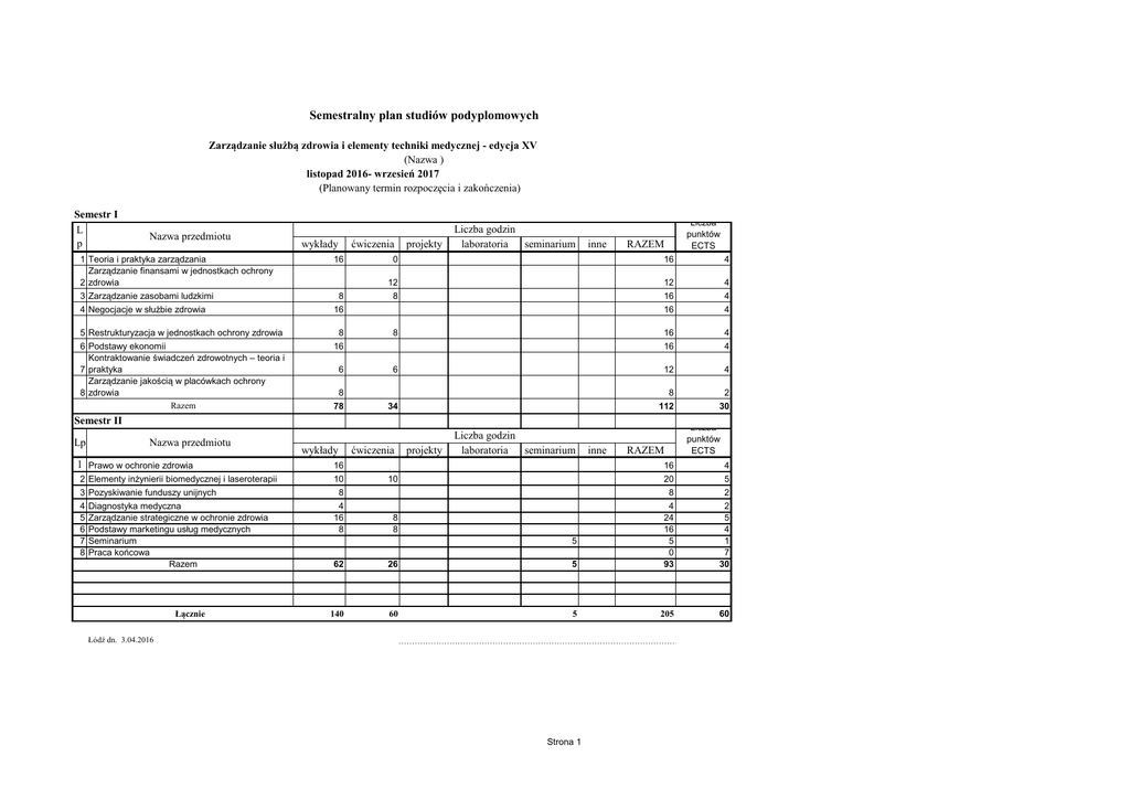 Semestralny plan studiów podyplomowych Zarządzanie służbą zdrowia i elementy techniki medycznej - edycja XV (Nazwa ) listopad 2016- wrzesień 2017 (Planowany termin rozpoczęcia i zakończenia) Semestr I L p Nazwa przedmiotu wykłady ćwiczenia 1 Teoria i praktyka zarządzania Zarządzanie finansami w jednostkach ochrony 2 zdrowia 16 3 Zarządzanie zasobami ludzkimi 4 Negocjacje w służbie zdrowia 8 16 5 Restrukturyzacja w jednostkach ochrony zdrowia 6 Podstawy ekonomii Kontraktowanie świadczeń zdrowotnych – teoria i 7 praktyka Zarządzanie jakością w placówkach ochrony 8 zdrowia Razem projekty Liczba godzin laboratoria seminarium inne RAZEM 0 16 4 12 8 12 16 16 4 4 4 8 16 16 4 4 6 6 12 4 8 78 34 8 112 2 30 8 16 Semestr II Lp Nazwa przedmiotu 1 Prawo w ochronie zdrowia 2 Elementy inżynierii biomedycznej i laseroterapii 3 Pozyskiwanie funduszy unijnych 4 Diagnostyka medyczna 5 Zarządzanie strategiczne w ochronie zdrowia 6 Podstawy marketingu usług medycznych 7 Seminarium 8 Praca końcowa Razem Łącznie Łódź dn. 3.04.2016 Liczba punktów ECTS wykłady 16 10 8 4 16 8 ćwiczenia projekty Liczba godzin laboratoria seminarium 10 inne RAZEM 16 20 4 5 2 2 5 4 1 7 30 60 62 26 5 8 4 24 16 5 0 93 140 60 5 205 8 8 5 Liczba punktów ECTS …………………………………………………………………………………………………… Strona 1
