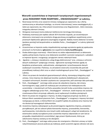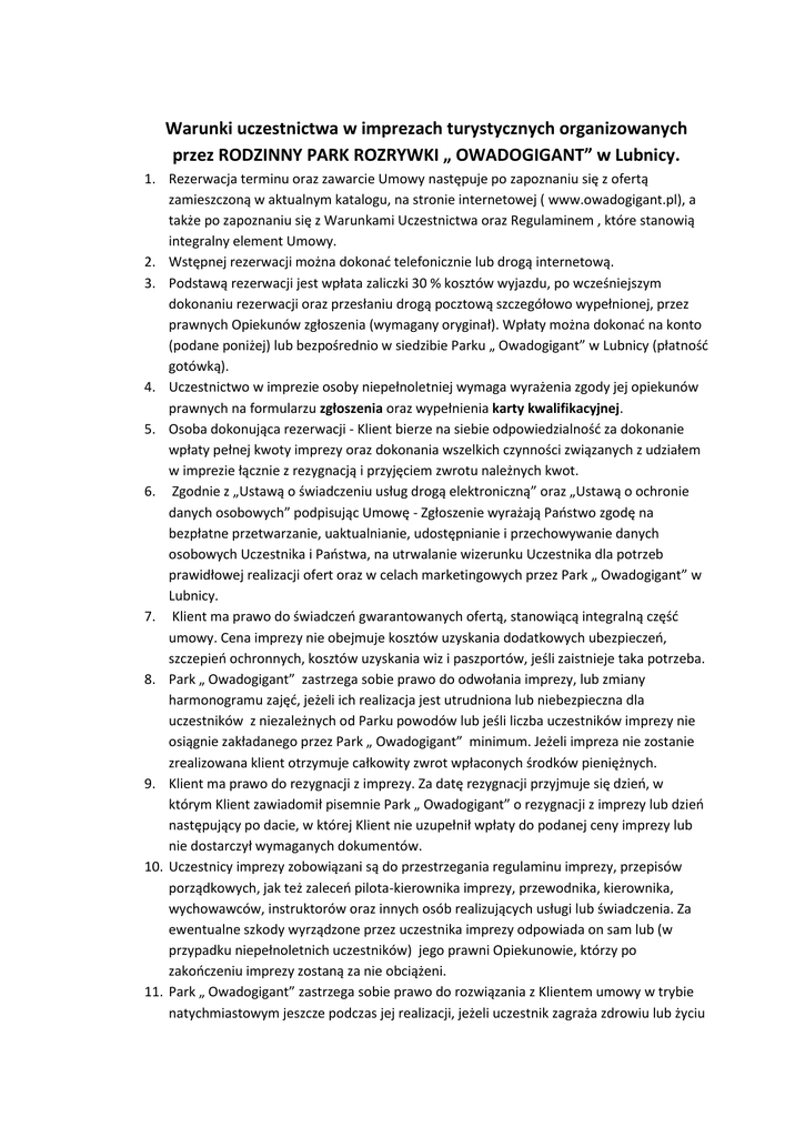 Warunki uczestnictwa w imprezach turystycznych organizowanych przez RODZINNY PARK ROZRYWKI „ OWADOGIGANT” w Lubnicy. 1. Rezerwacja terminu oraz zawarcie Umowy następuje po zapoznaniu się z ofertą zamieszczoną w aktualnym katalogu, na stronie internetowej ( www.owadogigant.pl), a także po zapoznaniu się z Warunkami Uczestnictwa oraz Regulaminem , które stanowią integralny element Umowy. 2. Wstępnej rezerwacji można dokonać telefonicznie lub drogą internetową. 3. Podstawą rezerwacji jest wpłata zaliczki 30 % kosztów wyjazdu, po wcześniejszym dokonaniu rezerwacji oraz przesłaniu drogą pocztową szczegółowo wypełnionej, przez prawnych Opiekunów zgłoszenia (wymagany oryginał). Wpłaty można dokonać na konto (podane poniżej) lub bezpośrednio w siedzibie Parku „ Owadogigant” w Lubnicy (płatność gotówką). 4. Uczestnictwo w imprezie osoby niepełnoletniej wymaga wyrażenia zgody jej opiekunów prawnych na formularzu zgłoszenia oraz wypełnienia karty kwalifikacyjnej. 5. Osoba dokonująca rezerwacji - Klient bierze na siebie odpowiedzialność za dokonanie wpłaty pełnej kwoty imprezy oraz dokonania wszelkich czynności związanych z udziałem w imprezie łącznie z rezygnacją i przyjęciem zwrotu należnych kwot. 6. Zgodnie z „Ustawą o świadczeniu usług drogą elektroniczną” oraz „Ustawą o ochronie danych osobowych” podpisując Umowę - Zgłoszenie wyrażają Państwo zgodę na bezpłatne przetwarzanie, uaktualnianie, udostępnianie i przechowywanie danych osobowych Uczestnika i Państwa, na utrwalanie wizerunku Uczestnika dla potrzeb prawidłowej realizacji ofert oraz w celach marketingowych przez Park „ Owadogigant” w Lubnicy. 7. Klient ma prawo do świadczeń gwarantowanych ofertą, stanowiącą integralną część umowy. Cena imprezy nie obejmuje kosztów uzyskania dodatkowych ubezpieczeń, szczepień ochronnych, kosztów uzyskania wiz i paszportów, jeśli zaistnieje taka potrzeba. 8. Park „ Owadogigant” zastrzega sobie prawo do odwołania imprezy, lub zmiany harmonogramu zajęć, jeżeli ich realizacja jest utrudniona lub niebezpieczna dla uczestników z niezależnych od Parku powodów lub jeśli liczba uczestników imprezy nie osiągnie zakładanego przez Park „ Owadogigant” minimum. Jeżeli impreza nie zostanie zrealizowana klient otrzymuje całkowity zwrot wpłaconych środków pieniężnych. 9. Klient ma prawo do rezygnacji z imprezy. Za datę rezygnacji przyjmuje się dzień, w którym Klient zawiadomił pisemnie Park „ Owadogigant” o rezygnacji z imprezy lub dzień następujący po dacie, w której Klient nie uzupełnił wpłaty do podanej ceny imprezy lub nie dostarczył wymaganych dokumentów. 10. Uczestnicy imprezy zobowiązani są do przestrzegania regulaminu imprezy, przepisów porządkowych, jak też zaleceń pilota-kierownika imprezy, przewodnika, kierownika, wychowawców, instruktorów oraz innych osób realizujących usługi lub świadczenia. Za ewentualne szkody wyrządzone przez uczestnika imprezy odpowiada on sam lub (w przypadku niepełnoletnich uczestników) jego prawni Opiekunowie, którzy po zakończeniu imprezy zostaną za nie obciążeni. 11. Park „ Owadogigant” zastrzega sobie prawo do rozwiązania z Klientem umowy w trybie natychmiastowym jeszcze podczas jej realizacji, jeżeli uczestnik zagraża zdrowiu lub życiu 12. 13. 14. 15. innych, bądź utrudnia sprawne przeprowadzenie programu imprezy ze szkodą dla innych uczestników. W takim przypadku, Park „ Owadogigant” może podjąć decyzję o usunięciu uczestnika na jego koszt lub (w przypadku niepełnoletnich uczestników) na koszt jego prawnych Opiekunów. Uczestnikom nie przysługuje zwrot kosztów za niewykorzystane dni pobytu czy świadczenia, z przyczyn leżących po ich stronie lub podczas dobrowolnej rezygnacji. Uczestnik lub jego prawny Opiekun oświadcza, iż został pouczony o: obowiązujących przepisach , w szczególności o wymaganiach zdrowotnych dotyczących udziału w imprezie, o osobie, która będzie przyjmowała informacje dotyczące trudności podczas uczestniczenia w imprezie, czasie przejazdu, miejscach i czasie trwania postojów oraz o mogących powstać trudnościach z tym związanych. Faktury VAT wystawiane są na prośbę Klienta, jednak nie później niż w terminie do 7 dni od daty wpłaty zaliczki i do 7 dni od daty dopłaty do całości kwoty W sprawach nieuregulowanych niniejszą Umową zastosowanie mają odpowiednie przepisy Kodeksu Cywilnego oraz Ustawy o Usługach Turystycznych z dnia 29 sierpnia 1997r. (z późniejszymi zmianami). Strony zgodnie oświadczają, iż wszelkie spory mogące wynikać z tytułu realizacji Umowy będą rozstrzygane polubownie, a w razie nie osiągnięcia porozumienia, przez Sąd właściwy dla siedziby Organizatora. Rodzinny Park Rozrywki „ Owadogigant” Lubnica 40 , 64-965 Okonek Wpłaty na konto: BGŻ O/PIŁA 57 2030 0045 1110 0000 0352 1440 Tel. 600 839 908 , 606 729 340