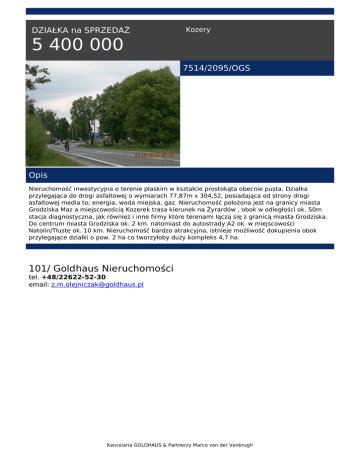 DZIAŁKA na SPRZEDAŻ Kozery 5 400 000 7514/2095/OGS Opis Nieruchomość inwestycyjna o terenie płaskim w kształcie prostokąta obecnie pusta. Działka przylegająca do drogi asfaltowej o wymiarach 77,87m x 304,52, posiadająca od strony drogi asfaltowej media to; energia, woda miejska, gaz. Nieruchomość położona jest na granicy miasta Grodziska Maz a miejscowością Kozerek trasa kierunek na Żyrardów , obok w odległości ok. 50m stacja diagnostyczna, jak również i inne firmy które terenami łączą się z granicą miasta Grodziska. Do centrum miasta Grodziska ok. 2 km. natomiast do autostrady A2 ok. w miejscowości Natolin/Tłuste ok. 10 km. Nieruchomość bardzo atrakcyjna, istnieje możliwość dokupienia obok przylegające działki o pow. 2 ha co tworzyłoby duży kompleks 4,7 ha. 101/ Goldhaus Nieruchomości tel. +48/22622-52-30 email: [email protected] Kancelaria GOLDHAUS & Partnerzy Marco von der Vanbrugh Powered by TCPDF (www.tcpdf.org)