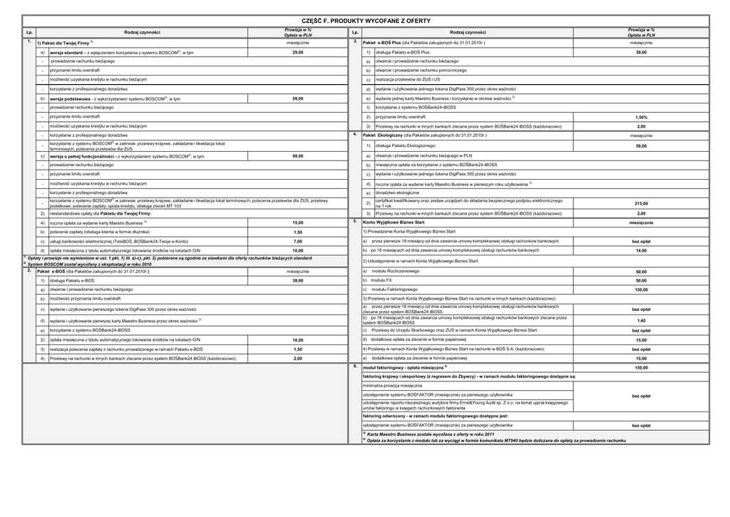 CZĘŚĆ F. PRODUKTY WYCOFANE Z OFERTY Rodzaj czynności Lp. 1. 1) 2) 1) Pakiet dla Twojej Firmy 1) Prowizja w % Opłata w PLN Lp. miesięcznie 3. Prowizja w % Opłata w PLN Rodzaj czynności Pakiet e-BOŚ Plus (dla Pakietów zakupionych do 31.01.2010r.) miesięcznie 1) obsługa Pakietu e-BOŚ Plus: prowadzenie rachunku bieżącego a) otwarcie i prowadzenie rachunku bieżącego - przyznanie limitu overdraft b) otwarcie i prowadzenie rachunku pomocniczego - możliwość uzyskania kredytu w rachunku bieżącym c) realizacja przelewów do ZUS i US - korzystanie z profesjonalnego doradztwa d) wydanie i użytkowanie jednego tokena DigiPass 300 przez okres ważności b) wersja podstawowa - z wykorzystaniem systemu BOSCOM2), w tym e) wydanie jednej karty Maestro Business i korzystanie w okresie ważności 3) - prowadzenie rachunku bieżącego f) korzystanie z systemu BOŚBank24-iBOSS - przyznanie limitu overdraft 2) przyznanie limitu overdraft - możliwość uzyskania kredytu w rachunku bieżącym 3) Przelewy na rachunki w innych bankach zlecane przez system BOŚBank24 iBOSS (każdorazowo): - korzystanie z profesjonalnego doradztwa - korzystanie z systemu BOSCOM2) w zakresie: przelewy krajowe, zakładanie i likwidacja lokat terminowych, polecenia przelewów dla ZUS c) wersja o pełnej funkcjonalności - z wykorzystaniem systemu BOSCOM2), w tym: - a) wersja standard – z wyłączeniem korzystania z systemu BOSCOM2), w tym - 29,00 59,00 4. 39,00 1,50% Pakiet Ekologiczny (dla Pakietów zakupionych do 31.01.2010r.) 1) obsługa Pakietu Ekologicznego: a) otwarcie i prowadzenie rachunku bieżącego w PLN prowadzenie rachunku bieżącego b) miesięczna opłata za korzystanie z systemu BOŚBank24-iBOSS przyznanie limitu overdraft c) wydanie i użytkowanie jednego tokena DigiPass 300 przez okres ważności - możliwość uzyskania kredytu w rachunku bieżącym d) roczna opłata za wydanie karty Maestro Business w pierwszym roku użytkowania - korzystanie z profesjonalnego doradztwa e) doradztwo ekologiczne - korzystanie z systemu BOSCOM2) w zakresie: przelewy krajowe, zakładanie i likwidacja lokat terminowych, polecenia przelewów dla ZUS, przelewy podatkowe, polecenie zapłaty, splata kredytu, obsługa zleceń MT 103 2) certyfikat kwalifikowany oraz zestaw urządzeń do składania bezpiecznego podpisu elektronicznego na 1 rok 2) niestandardowe opłaty dla Pakietu dla Twojej Firmy: 3) Przelewy na rachunki w innych bankach zlecane przez system BOŚBank24 iBOSS (każdorazowo): a) roczna opłata za wydanie karty Maestro Business 3) 15,00 b) polecenie zapłaty (obsługa klienta w formie dłużnika) 1,50 1) Prowadzenie Konta Wyjątkowego Biznes Start c) usługi bankowości elektronicznej (TeleBOŚ, BOŚBank24-Twoje e-Konto) 7,00 a) przez pierwsze 18 miesięcy od dnia zawarcia umowy kompleksowej obsługi rachunków bankowych d) opłata miesięczna z tytułu automatycznego lokowania środków na lokatach O/N 10,00 b) po 18 miesiącach od dnia zawarcia umowy kompleksowej obsługi rachunków bankowych 99,00 5. Opłaty i prowizje nie wymienione w ust. 1 pkt. 1) lit. a)-c), pkt. 2) pobierane są zgodnie ze stawkami dla oferty rachunków bieżących standard System BOSCOM został wycofany z eksploatacji w roku 2010 2. Pakiet e-BOŚ (dla Pakietów zakupionych do 31.01.2010r.) miesięcznie 2,00 miesięcznie 59,00 3) Konto Wyjątkowe Biznes Start 215,00 2,00 miesięcznie bez opłat 14,00 2) Udostępnienie w ramach Konta Wyjątkowego Biznes Start: a) modułu Rozliczeniowego 50,00 b) modułu FX 50,00 otwarcie I prowadzenie rachunku bieżącego c) modułu Faktoringowego 150,00 b) możliwość przyznania limitu overdraft 3) Przelewy w ramach Konta Wyjątkowego Biznes Start na rachunki w innych bankach (każdorazowo): c) wydanie i użytkowanie pierwszego tokena DigiPass 300 przez okres ważności d) wydanie i użytkowanie pierwszej karty Maestro Business przez okres ważności e) korzystanie z systemu BOŚBank24-iBOSS 2) opłata miesięczna z tytułu automatycznego lokowania środków na lokatach O/N 10,00 d) dodatkowa opłata za zlecenie w formie papierowej 3) realizacja polecenia zapłaty z rachunku prowadzonego w ramach Pakietu e-BOŚ 1,50 4) Przelewy w ramach Konta Wyjątkowego Biznes Start na rachunki w BOŚ S.A. (każdorazowo): 4) Przelewy na rachunki w innych bankach zlecane przez system BOŚBank24 iBOSS (każdorazowo): 2,00 1) obsługa Pakietu e-BOŚ: a) 39,00 a) przez pierwsze 18 miesięcy od dnia zawarcia umowy kompleksowej obsługi rachunków bankowych zlecane przez system BOŚBank24 iBOSS b) po 18 miesiącach od dnia zawarcia umowy kompleksowej obsługi rachunków bankowych zlecane przez system BOŚBank24 iBOSS 3) c) Przelewy do Urzędu Skarbowego oraz ZUS w ramach Konta Wyjątkowego Biznes Start 6. bez opłat 1,40 bez opłat 15,00 bez opłat a) dodatkowa opłata za zlecenie w formie papierowej 15,00 moduł faktoringowy - opłata miesięczna 4) 150,00 faktoring krajowy i eksportowy (z regresem do Zbywcy) - w ramach modułu faktoringowego dostępne są: minimalna prowizja miesięczna udostępnienie systemu BOŚFAKTOR (miesięcznie) za pierwszego użytkownika bez opłat udostępnienie raportu niezależnego audytora firmy Ernst&Young Audit sp. Z o.o. na temat ujęcia księgowego umów faktoringu w księgach rachunkowych faktoranta faktoring odwrócony - w ramach modułu faktoringowego dostępne jest: udostępnienie systemu BOŚFAKTOR (miesięcznie) za pierwszego użytkownika 3) 4) Karta Maestro Business została wycofana z oferty w roku 2011 Opłata za korzystanie z modułu lub za wyciągi w formie komunikatu MT940 będzie doliczana do opłaty za prowadzenie rachunku bez opłat