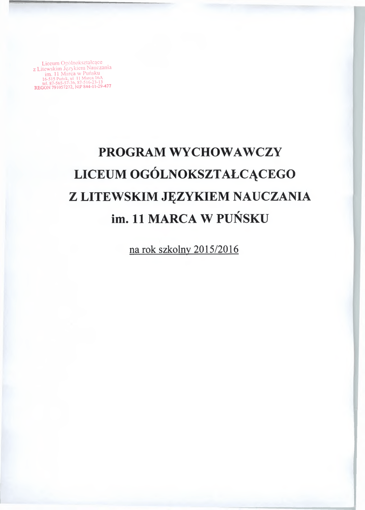 Liceum Ogólnokształcące z Litewskim Językiem Nauczania im. 11 Marca w Puńsku 16-515 Puńsk, ul 11 Marca 16A tel. 87-565-57-36, 87-516-23-13 REGON 791057272, NIP 844-11-29-477 PROGRAM WYCHOWAWCZY LICEUM OGÓLNOKSZTAŁCĄCEGO Z LITEWSKIM JĘZYKIEM NAUCZANIA im. 11 MARCA W PUŃSKU na rok szkolny 2015/2016 SPIS TREŚCI 1. Wstęp. 2. Misja szkoły. 3. Powinności osób realizujących proces wychowania: □ wychowawca, □ każdy nauczyciel, □ dyrektor. 4. Współpraca wychowawcy z rodzicami. 5. Współpraca z samorządami. 6. Cele wychowawcze szkolnego samorządu uczniowskiego. 7. Kalendarz imprez szkolnych. 8. Tradycje szkolne. 9. Portret absolwenta szkoły. 10. Zadania wychowawcze na bieżący rok szkolny. I WSTĘP Liceum Ogólnokształcące z Litewskim Językiem Nauczania im. 11 Marca w Puńsku w oparciu o obowiązujące akty prawne (Ustawa o systemie oświaty, Konstytucja RP oraz Deklaracja Praw Dziecka), Rozporządzenia MEN w sprawie podstawy programowej kształcenia ogólnego., Rozporządzenie Ministra Edukacji Narodowej z dniał 8 sierpnia 2015r. w sprawie zakresu i form prowadzenia w szkołach i placówkach systemu oświaty działalności wychowawczej, edukacyjnej, informacyjnej i profilaktycznej w celu przeciwdziałania narkomanii (Dz.U. 28 sierpnia 2015r. poz.1249) ustanawia następujące wartości w celu ich osiągania, przestrzegania i poszanowania przez uczniów szkoły: 1. Patriotyzm, miłość do własnej miejscowości i regionu, szacunek dla kraju zamieszkania. 2. Szacunek dla litewskiego i polskiego dziedzictwa kulturowego. 3. Tolerancja, otwarcie na innych, wrażliwość, uczynność i umiejętność przeciwstawienia się różnym formom agresji. 4. Aktywność społeczna, odpowiedzialna przynależność do społeczności, których członkami są uczniowie szkoły. 5. Samodzielność samodyscyplina, odpowiedzialność za własne działania i decyzje. 6. Dociekliwość poznawcza ukierunkowana na dobro, prawdę i piękno. 7. Uczciwość, wytrwałość, rzetelna praca i przedsiębiorczość, prowadząca do zbudowania koncepcji swego życia. 8. Dbałość o zdrowy i higieniczny tryb życia, estetykę otoczenia i ochronę środowiska. II MISJA SZKOŁY 1. Kształcenie w Liceum ma na celu wszechstronny rozwój osobowości uczniów, uwzględniające indywidualne zainteresowania i predyspozycje psychofizyczne oraz wychowanie ich w duchu przywiązania do tradycji narodowych i jednocześnie świadomych, twórczych i odpowiedzialnych obywateli Polski poprzez: □ wyposażenie uczniów w wiedzę humanistyczną społeczną przyrodniczą matematyczną techniczną i ekonomiczną a w związku z tym rozwijanie zainteresowań, uzdolnień i aspiracji oraz wyrabianie umiejętności wartościowania, oceniania i wnioskowania jako warunku postępowania i działania; □ kształtowanie humanistycznej, patriotycznej postawy uczniów poszanowania tradycji i trwałych wartości kultury narodowej i powszechnej, norm społecznego współżycia oraz instytucji państwowych i społecznych; □ przygotowanie uczniów do świadomego samodzielnego, aktywnego i odpowiedzialnego spełniania zadań w życiu rodzinnym, społecznym, gospodarczym, kulturalnym i obronnym kraju; □ wyrabianie wrażliwości społecznej, emocjonalnej i estetycznej uczniów, ich sprawności fizycznej, a także nawyków dbania o własny rozwój fizyczny, zdrowie, higienę psychiczną racjonalny wypoczynek i wartościową organizację czasu wolnego. 2. Liceum realizuje statutowe cele, zapewnia uczniom zdobycie wysokiej kultury intelektualnej i szerokiej wiedzy, w szczególności o: □ przyrodzie, człowieku, społeczeństwie, cywilizacji, kulturze i technice oraz społecznych i technicznych uwarunkowaniach rozwoju narodów i państw; □ trwałych wartościach kultury narodowej, jej związkach z kulturą światową □ różnych systemach wartości, reprezentujących je światopoglądach, stosunkach międzynarodowych i normach zachowania jako podstawie kształtowania własnego miejsca w społeczeństwie; □ zasadach racjonalnej organizacji pracy własnej i zespołowej, metodach oceny efektywności działań i sposobach kierowania ich przebiegiem; □ metodach i technikach samodzielnego zdobywania wiedzy i umiejętności oraz współczesnych systemach wymiany i upowszechniania informacji. 3. Liceum, stanowiące ośrodek życia intelektualnego i kulturalnego oraz środowisko wychowawcze uczniów, zapewnia im w szczególności: □ rozwój intelektualny, społeczny, moralny, estetyczny i fizyczny oraz ukształtowanie społecznie wartościowych przekonań, warunkujących racjonalność działań zmierzających do osiągania celów indywidualnych i społecznych; □ rozwijanie dociekliwości poznawczej, własnych uzdolnień i zainteresowań oraz umiejętności spostrzegania, myślenia, posługiwania się zdobytą wiedzą, uczenia się, emocjonalnego reagowania i wrażliwości na otoczenie ; □ kształtowanie prawości charakteru i dążeń, poszanowania norm społecznych oraz godności własnej osoby i drugiego człowieka, a także osobistej wrażliwości, rzetelności i odpowiedzialności; □ ukształtowanie przekonania o podmiotowym i społecznym charakterze egzystencji człowieka oraz pozytywnej motywacji do nauki, pracy i osobistego uczestnictwa w życiu szkoły, lokalnego środowiska i całego społeczeństwa; □ uczestniczenie w życiu intelektualnym i kulturalnym szkoły i środowiska, inspirowanie jego treści i form oraz rozwijanie samorządności organizacji uczniowskich. 4. Liceum umożliwia uczniom podtrzymanie poczucia tożsamości narodowej, etnicznej, językowej poprzez nauczanie w języku litewskim historii i geografii Litwy i organizowanie innych form, służących kultywowaniu tradycji i kultury regionalnej: □ wyjazdy do Litwy na różnego rodzaju imprezy kulturalno-oświatowe; □ współpraca z ludźmi kultury, życia społeczno-politycznego Litwy; □ współpraca z Gimnazjum im. Dariusa i Girenasa w Puńsku