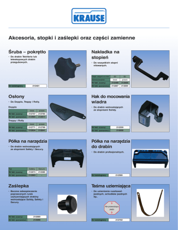 Akcesoria, stopki i zaślepki oraz części zamienne Śruba – pokrętło • Do drabin TeleVario lub teleskopowych drabin przegubowych. Nakładka na stopień • Do wszystkich stopni nitowanych. 80 80 Zamocowanie lewe prawe Nr kat. (czarny) 212498 212504 Nr kat. (pomarańcz) 212887 212894 Głęb. stopni w mm 212481 Nr katalogowy Osłony Hak do mocowania wiadra • Do Dopplo, Treppy i Rolly. Dopplo lewe prawe Nr kat. (czarny) 212757 212764 Nr kat. (pomarańcz) 212900 212917 • Do drabin wolnostojących ze stopniami Solidy. Treppy i Rolly lewe prawe Nr kat. (czarny) 212771 212788 Nr kat. (czarny) 212559 Nr kat. (pomarańcz) 212634 212641 Nr kat. (pomarańcz.) 212658 Półka na narzędzia • Do drabin wolnostojących ze stopniami Safety i Secury. Półka na narzędzia do drabin • Do drabin profesjonalnych. Typ Safety Secury Nr kat. (czarny) 212573 212580 Nr kat. (pomarańcz) 212665 - 212566 Nr katalogowy Zaślepka Taśma uziemiająca • Boczne zabezpieczenie poprzecznych rurek usztywniających drabiny wolnostojące Solidy, Safety i Secury. • Do uziemiania rusztowań jezdnych, schodków jezdnych itp.. Nie przewodząca prądu Nr kat. (czarny) 212689 Nr kat. (pomarańcz) 212696 Nr katalogowy 212702