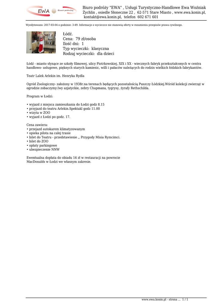 Biuro podróży "EWA" , Usługi Turystyczno-Handlowe Ewa Woźniak Żychlin , osiedle Słoneczne 22 , 62-571 Stare Miasto , www.ewa.konin.pl, [email protected], telefon 602 671 601 Wyedytowano: 2017-03-04 o godzinie: 3-49. Informacje o wycieczce nie stanowią oferty w rozumieniu przepisów prawa cywilnego. Łódź. Cena: 79 zł/osoba Ilość dni: 1 Typ wycieczki: klasyczna Rodzaj wycieczki: dla dzieci Łódź - miasto słynące ze szkoły filmowej, ulicy Piotrkowskiej, XIX i XX - wiecznych fabryk przekształconych w centra handlowo- usługowe, pięknych starych kamienic, willi i pałaców należących do rodzin wielkich łódzkich fabrykantów. Teatr Lalek Arlekin im. Henryka Rydla Ogród Zoologiczny- założony w 1938r.na terenach będących pozostałością Puszczy Łódzkiej.Wśród kolekcji zwierząt w ogrodzie zobaczymy:lwy azjatyckie, zebry Chapmana, tygrysy, żyrafy Rethschilda. Program w Łodzi: • wyjazd z miejsca zamieszkania do Łodzi godz 8.15 • przyjazd do teatru Arlekin.Spektakl godz 11.00 • wizyta w ZOO • wyjazd z Łodzi po godz. 17. Cena zawiera: • przejazd autokarem klimatyzowanym • opieka pilota na całej trasie • bilet do Teatru - przedstawienie ,, Przygody Misia Rymcimci. • bilet do ZOO • opłaty parkingowe • ubezpieczenie NNW Ewentualna dopłata do obiadu 16 zł w restauracji na powrocie MacDonalds w Łodzi we własnym zakresie. www.ewa.konin.pl - strona ... 1 / 1