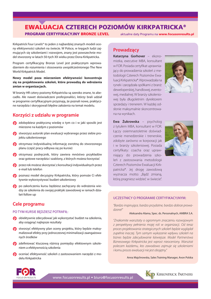 Kirkpatrick Four Levels® to jeden z najbardziej znanych modeli oceny efektywności szkoleń na świecie. W Polsce, w kręgach ludzi zajmujących się szkoleniami i rozwojem, znany jest powszechnie model stworzony w latach 50-tych XX wieku przez Dona Kirkpatricka. Program certyfikacyjny Bronze Level jest praktycznym wprowadzeniem do rozumienia i stosowania uwspółcześnionego The New World Kirkpatrick Model. Nowy model poza mierzeniem efektywności koncentruje się na projektowaniu szkoleń, które prowadzą do wdrożenia zmian w organizacjach. W branży HR cztery poziomy Kirkpatricka są szeroko znane, to abecadło. Ale nawet doświadczeni profesjonaliści, którzy brali udział w programie certyfikacyjnym przyznają, że poznali nowe, praktyczne narzędzia i skorygowali błędne założenia na temat modelu. Korzyści z udziału w programie zdobędziesz praktyczną wiedzę o tym co i w jaki sposób jest mierzone na każdym z poziomów stworzysz autorski plan ewaluacji wybranego przez siebie projektu szkoleniowego otrzymasz indywidualną informację zwrotną do stworzonego planu (część pracy odbywa się po kursie) otrzymasz podręcznik, który zawiera mnóstwo przykładów oraz gotowe narzędzia i szablony, z których możesz korzystać przez rok możesz skorzystać z konsultacji indywidualnych przez e-mail lub telefon poznasz model decyzyjny Kirkpatricka, który pomoże Ci efektywnie wykorzystywać budżet szkoleniowy po zakończeniu kursu będziesz zachęcany do wdrożenia wiedzy ze szkolenia do swojej praktyki zawodowej w ramach działań follow up Cele programu PO TYM KURSIE BĘDZIESZ POTRAFIŁ: obiektywnie zdecydować jak wykorzystać budżet na szkolenia, aby osiągnąć najlepsze rezultaty stworzyć efektywny plan oceny projektu, który będzie maksymalizował efekty przy jednoczesnej minimalizacji zaangażowanych środków zdefiniować kluczową różnicę pomiędzy efektownym szkoleniem a efektywnością szkolenia oceniać efektywność szkoleń z zastosowaniem narzędzi z modelu Kirkpatricka Prowadzący Katarzyna Gorhover – ekonomistka, executive MBA, konsultant w FOR. Posiada certyfikat uprawniający do prowadzenia szkoleń z metodologii Czterech Poziomów Ewaluacji Kirkpatricka®. Wprowadzała na rynek i zarządzała spółkami z branż: deweloperskiej, handlowej, eventowej, medialnej. W branży szkoleniowej była długoletnim dyrektorem sprzedaży i trenerem. W każdej odsłonie maksymalnie skoncentrowana na wynikach. Ewa Żukrowska – psycholog z tytułem MBA, konsultant w FOR. Łączy osiemnastoletnie doświadczenie menedżerskie i trenerskie, zdobyte zarówno w korporacji jak i w branży szkoleniowej. Posiada certyfikaty: coacha oraz uprawniający do prowadzenia szkoleń z zastosowania metodologii Czterech Poziomów Ewaluacji Kirkpatricka®. Jej drogę zawodową wyznacza motto: „Bądź zmianą, którą pragniesz widzieć w świecie”. UCZESTNICY O PROGRAMIE CERTYFIKACYJNYM: “Bardzo inspirujące, bardzo przydatne, bardzo dobrze prowadzone!” Aleksandra Alama, Spec. ds. Personalnych, AMBRA S.A. “Znakomite warsztaty o ogromnym znaczeniu rozwojowym z perspektywy pełnienia mojej roli w organizacji. Od teraz proces projektowania strategicznych szkoleń będzie wyglądał zupełnie inaczej. Tym samym wykazanie wpływu szkoleń na biznes będzie zdecydowanie łatwiejsze. Model Partnerstwa Biznesowego Kirkpatricka jest wprost nieoceniony. Warsztat polecam każdemu, kto zawodowo zajmuje się szkoleniami i komu proces ewaluacji nie jest obojętny.” Anna Majchrowska, Sales Training Manager, Avon Polska Cena Programu certyfikacyjnego obejmuje: Merytoryczny pakiet przedszkoleniowy Udział w dwudniowym kursie prowadzonym przez Katarzynę Gorhover i Ewę Żukrowską Podręcznik zawierający szablony, narzędzia i przykłady Dodatkowy materiał merytoryczny, esej Program kursu PAKIET PRZEDSZKOLENIOWY ~~ Wstęp do Czterech Poziomów Kirkpatricka – the New World Model ~~ Przygotowanie studium przypadku ze swojej realności DZIEŃ PIERWSZY Moduł 1 Wprowadzenie do Modelu Kirkpatricka Zadanie domowe – autorski plan ewaluacji ~~ Cele oceny efektywności Ocenę i zindywidualizowaną informację zwrotną na temat autorskiego planu ewaluacji Certyfikat ukończenia programu na Poziomie Brązowym i oficjalne zaświadczenie ~~ Cztery poziomy i ich historia ~~ Efektywne szkolenie versus efektywność szkoleniowa Moduł 2 Poziom 4 – Rezultaty ~~ Zasady, techniki i planowanie na Poziomie 4 ~~ Definiowanie Poziomu 4 dla Twojego projektu Trzymiesięczny follow-up drogą mailową Nieformalne konsultacje telefoniczne/mailowe przez rok od zakończenia programu Lunch i przerwy kawowe w trakcie szkolenia ~~ Wiodące wskaźniki Moduł 3 Poziom 3 – Zachowania ~~ Zasady, techniki i planowanie na Poziomie 3 ~~ Zachowania krytyczne i stymulatory zmian Moduł 4 Poziom 2 – Uczenie Cennik ~~ Zasady, techniki i planowanie na Poziomie 2 Kategoria cenowa Cena w PLN Przedsprzedaż (płatność do 30 dni przed szkoleniem) 3230,00 + VAT ~~ Retrospektywna samoocena Moduł 5 Poziom 1 - Reakcja ~~ Zasady, techniki i planowanie na Poziomie 1 Ceny regularne (płatność do 5 dni przed szkoleniem): ~~ Metody ewaluacji w trakcie szkolenia Udział w programie – 1 osoba 3990,00 + VAT Udział w programie (3-5 osób z tej samej firmy) 3230,00 + VAT Udział w programie (powyżej 5 osób z tej samej firmy) 2990,00 + VAT Udział w programie (dla przedstawicieli administracji publicznej i organizacji pozarządowych) 3590,00 + VAT Dla kogo przeznaczony jest program certyfikacyjny Kurs adresowany jest do wszystkich profesjonalistów zajmujących się szkoleniami i rozwojem, chcących realizować projekty maksymalizując efekty dla organizacji przy jednoczesnej minimalizacji zaangażowanych środków. Uczestnikami mogą być osoby pracujące w średnich i dużych firmach, administracji publicznej i samorządowej, wojsku, firmach szkoleniowych czy konsultingowych. Nie ma żadnych warunków wstępnych. Nawet doś