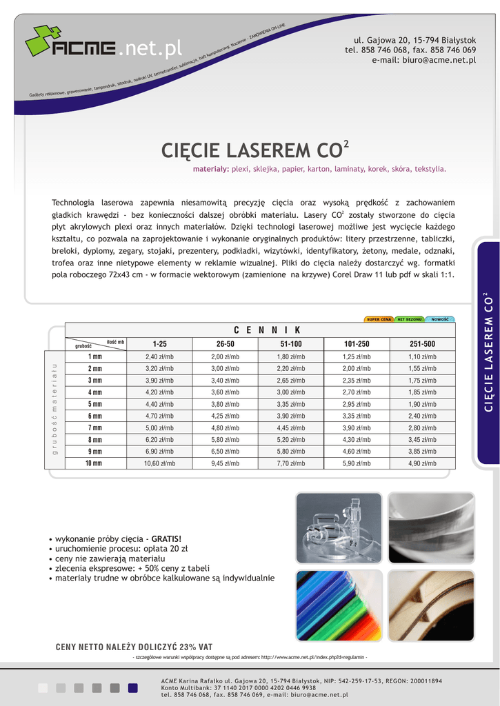 ie zen tłoc wy, ero t u p kom haft ja, mac i l b su sfer, tran ermo UV, t i k u r nad druk, k, sito pondru anie, tam w ro e w a gr we, Gadżety reklamo NE N-LI AO IENI W Ó M - ZA ul. Gajowa 20, 15-794 Białystok tel. 858 746 068, fax. 858 746 069 e-mail: [email protected] CIĘCIE LASEREM CO 2 materiały: plexi, sklejka, papier, karton, laminaty, korek, skóra, tekstylia. Technologia laserowa zapewnia niesamowitą precyzję cięcia oraz wysoką prędkość z zachowaniem C E N N I K 1-25 26-50 51-100 101-250 251-500 1 mm 2,40 zł/mb 2,00 zł/mb 1,80 zł/mb 1,25 zł/mb 1,10 zł/mb 2 mm 3,20 zł/mb 3,00 zł/mb 2,20 zł/mb 2,00 zł/mb 1,55 zł/mb 3 mm 3,90 zł/mb 3,40 zł/mb 2,65 zł/mb 2,35 zł/mb 1,75 zł/mb 4 mm 4,20 zł/mb 3,60 zł/mb 3,00 zł/mb 2,70 zł/mb 1,85 zł/mb 5 mm 4,40 zł/mb 3,80 zł/mb 3,35 zł/mb 2,95 zł/mb 1,90 zł/mb 6 mm 4,70 zł/mb 4,25 zł/mb 3,90 zł/mb 3,35 zł/mb 2,40 zł/mb 7 mm 5,00 zł/mb 4,80 zł/mb 4,45 zł/mb 3,90 zł/mb 2,80 zł/mb 8 mm 6,20 zł/mb 5,80 zł/mb 5,20 zł/mb 4,30 zł/mb 3,45 zł/mb 9 mm 6,90 zł/mb 6,50 zł/mb 5,80 zł/mb 4,60 zł/mb 3,85 zł/mb 10 mm 10,60 zł/mb 9,45 zł/mb 7,70 zł/mb 5,90 zł/mb 4,90 zł/mb grubość materiału grubość • • • • • ilość mb wykonanie próby cięcia - GRATIS! uruchomienie procesu: opłata 20 zł ceny nie zawierają materiału zlecenia ekspresowe: + 50% ceny z tabeli materiały trudne w obróbce kalkulowane są indywidualnie CENY NETTO NALEŻY DOLICZYĆ 23% VAT - szczegółowe warunki współpracy dostępne są pod adresem: http://www.acme.net.pl/index.php?d=regulamin - ACME Karina Rafałko ul. Gajowa 20, 15-794 Białystok, NIP: 542-259-17-53, REGON: 200011894 Konto Multibank: 37 1140 2017 0000 4202 0446 9938 tel. 858 746 068, fax. 858 746 069, e-mail: [email protected] CIĘCIE LASEREM CO2 gładkich krawędzi - bez konieczności dalszej obróbki materiału. Lasery CO2 zostały stworzone do cięcia płyt akrylowych plexi oraz innych materiałów. Dzięki technologi laserowej możliwe jest wycięcie każdego kształtu, co pozwala na zaprojektowanie i wykonanie oryginalnych produktów: litery przestrzenne, tabliczki, breloki, dyplomy, zegary, stojaki, prezentery, podkładki, wizytówki, identyfikatory, żetony, medale, odznaki, trofea oraz inne nietypowe elementy w reklamie wizualnej. Pliki do cięcia należy dostarczyć wg. formatki pola roboczego 72x43 cm - w formacie wektorowym (zamienione na krzywe) Corel Draw 11 lub pdf w skali 1:1.