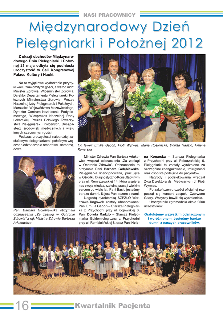 NASI PRACOWNICY Międzynarodowy Dzień Pielęgniarki i Położnej 2012 Z okazji obchodów Międzynarodowego Dnia Pielęgniarki i Położnej 21 maja odbyła się podniosła uroczystość w Sali Kongresowej Pałacu Kultury i Nauki. Na to wyjątkowe wydarzenie przybyło wielu znakomitych gości, a wśród nich: Minister Zdrowia, Wiceminister Zdrowia, Dyrektor Departamentu Pielęgniarek i Położnych Ministerstwa Zdrowia, Prezes Naczelnej Izby Pielęgniarek i Położnych, Marszałek Województwa Mazowieckiego, Dyrektor Centrum Kształcenia Podyplomowego, Wiceprezes Naczelnej Rady Lekarskiej, Prezes Polskiego Towarzystwa Pielęgniarek i Położnych, Duszpasterz środowisk medycznych i wielu innych szacownych gości. Podczas uroczystości najbardziej zasłużonym pielęgniarkom i położnym wręczono odznaczenia resortowe i samorządowe. Od lewej: Emilia Gacoń, Piotr Wyrwas, Maria Rosłońska, Dorota Radzio, Helena Konarska Pani Barbara Gołębiewska otrzymała odznaczenia „Za zasługi w Ochronie Zdrowia” z rąk Ministra Zdrowia Bartosza Arłukowicza 16 Minister Zdrowia Pan Bartosz Arłukowicz wręczał odznaczenia „Za zasługi w Ochronie Zdrowia”. Odznaczenie to otrzymała Pani Barbara Gołębiewska. Pielęgniarka licencjonowana, pracująca w Ośrodku Diagnostyczno-Konsultacyjnym przy ul. Remiszewskiej 14, która wspiera nas swoją wiedzą, rzetelną pracą i wielkim sercem od wielu lat. Pani Basiu jesteśmy bardzo dumni, iż jest Pani razem z nami. Nagrodą dyrektorską SZPZLO Warszawa-Targówek zostały uhonorowane: Pani Emilia Gacoń – Starsza Pielęgniarka z Przychodni przy ul. Łojewskiej 6, Pani Dorota Radzio – Starsza Pielęgniarka Epidemiologiczna z Przychodni przy ul. Rembielińskiej 8, oraz Pani Hele- na Konarska – Starsza Pielęgniarka z Przychodni przy ul. Poborzańskiej 6. Pielęgniarki te zostały wyróżnione za szczególne zaangażowanie, umiejętności oraz osobiste podejście do pacjentów. Nagrody i podziękowania wręczał Z-ca Dyrektora ds. Medycznych dr Piotr Wyrwas. Po zakończeniu części oficjalnej rozpoczął się koncert zespołu Czerwone Gitary. Wszyscy bawili się wyśmienicie. Uroczystość zgromadziła około 2500 uczestników. Gratulujemy wszystkim odznaczonym i wyróżnionym. Jesteśmy bardzo dumni z naszych pracowników. Kwartalnik Pacjenta