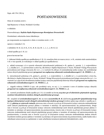 Sygn. akt I Ns 778/13 POSTANOWIENIE Dnia 16 września 2016 r. Sąd Rejonowy w Nysie, Wydział I Cywilny w składzie: Przewodniczący: Sędzia Sądu Rejonowego Remigiusz Drzewiecki Protokolant: sekretarka Anna Jakubiszyn po rozpoznaniu na rozprawie w dniu 2 września 2016 r. w N. sprawy z wniosku C. K. z udziałem: R. K. (1), S. K., G. K., R. K. (2), M. (...) , (...), M. K. (1) o dział spadku po J. K. (1) p o s t a n a w i a: I. dokonać działu spadku po spadkodawcy J. K. (1), zmarłym dnia 20 marca 2012 r. w B., ostatnio stale zamieszkałym w B. w ten sposób, że wchodzące w skład spadku po spadkodawcy: a. udział wynoszący 1/2 w prawie własności nieruchomości położonej w B., gmina Ł., powiat (...), województwo (...), działka nr (...) o powierzchni 0,1600 ha, dla której w Sądzie Rejonowym w Nysie, Wydział V Ksiąg Wieczystych prowadzona jest księga wieczysta Kw nr (...) o wartości 81.168,50 zł (osiemdziesiąt jeden tysięcy sto sześćdziesiąt osiem złotych pięćdziesiąt groszy) przyznać na wyłączną własność wnioskodawczyni C. K. PESEL (...), b. nieruchomość położoną w B., gmina Ł., powiat (...), województwo (...), działki nr (...) o powierzchni 1,7000 ha, dla której w Sądzie Rejonowym w Nysie, Wydział V Ksiąg Wieczystych prowadzona jest księga wieczysta Kw nr (...) o wartości 127.459 zł (sto dwadzieścia siedem tysięcy czterysta pięćdziesiąt dziewięć złotych) przyznać na wyłączną własność wnioskodawczyni C. K. PESEL (...), c. ciągnik rolniczy URSUS C-330, rok produkcji 1974, nr rej. (...) o wartości 7.000 zł (siedem tysięcy złotych) przyznać na wyłączną własność wnioskodawczyni C. K. PESEL (...), II. wartość przedmiotu działu spadku po J. K. (1) ustalić na kwotę 215.627,50 zł (dwieście piętnaście tysięcy sześćset dwadzieścia siedem złotych pięćdziesiąt groszy), III. zasądzić od wnioskodawczyni C. K. na rzecz uczestnika R. K. (1) kwotę 53.906,87 (pięćdziesiąt trzy tysiące dziewięćset sześć złotych osiemdziesiąt siedem groszy) tytułem spłaty jego udziału w spadku po J. K. (1), płatną w czterech ratach: pierwsza rata w kwocie 13.476,50 zł (trzynaście tysięcy czterysta siedemdziesiąt sześć złotych pięćdziesiąt groszy) płatna w terminie 6 miesięcy od uprawomocnienia się postanowienia, druga rata w kwocie 13.476,50 zł (trzynaście tysięcy czterysta siedemdziesiąt sześć złotych pięćdziesiąt groszy) płatna w terminie 12 miesięcy od uprawomocnienia się postanowienia, trzecia rata w kwocie 13.476,50 zł (trzynaście tysięcy czterysta siedemdziesiąt sześć złotych pięćdziesiąt groszy) płatna w terminie 18 miesięcy od uprawomocnienia się postanowienia, a czwarta rata w kwocie 13.477,37 zł (trzynaście tysięcy czterysta siedemdziesiąt siedem złotych trzydzieści siedem groszy) płatna w terminie 24 miesięcy od uprawomocnienia się postanowienia, nadto każda rata z odsetkami ustawowymi za opóźnienie w razie uchybienia terminowi płatności którejkolwiek z nich, IV. zasądzić od wnioskodawczyni C. K. na rzecz uczestniczki S. K. kwotę 53.906,87 (pięćdziesiąt trzy tysiące dziewięćset sześć złotych osiemdziesiąt siedem groszy) tytułem spłaty jej udziału w spadku po J. K. (1), płatną w czterech ratach: pierwsza rata w kwocie 13.476,50 zł (trzynaście tysięcy czterysta siedemdziesiąt sześć złotych pięćdziesiąt groszy) płatna w terminie 6 miesięcy od uprawomocnienia się postanowienia, druga rata w kwocie 13.476,50 zł (trzynaście tysięcy czterysta siedemdziesiąt sześć złotych pięćdziesiąt groszy) płatna w terminie 12 miesięcy od uprawomocnienia się postanowienia, trzecia rata w kwocie 13.476,50 zł (trzynaście tysięcy czterysta siedemdziesiąt sześć złotych pięćdziesiąt groszy) płatna w terminie 18 miesięcy od uprawomocnienia się postanowienia, a czwarta rata w kwocie 13.477,37 zł (trzynaście tysięcy czterysta siedemdziesiąt siedem złotych trzydzieści siedem groszy) płatna w terminie 24 miesięcy od uprawomocnienia się postanowienia, nadto każda rata z odsetkami ustawowymi za opóźnienie w razie uchybienia terminowi płatności którejkolwiek z nich, V. nakazać ściągnąć na rzecz Skarbu Państwa - Sądu Rejonowego w Nysie od wnioskodawczyni C. K. kwotę 723,39 zł (siedemset dwadzieścia trzy złote trzydzieści dziewięć groszy) tytułem części kosztów postępowania poniesionych przez Skarb Państwa, VI. nakazać ściągnąć na rzecz Skarbu Państwa - Sądu Rejonowego w Nysie od uczestniczki S. K. kwotę 723,39 zł (siedemset dwadzieścia trzy złote trzydzieści dziewięć groszy) tytułem części kosztów postępowania poniesionych przez Skarb Państwa, VII. nakazać ściągnąć na rzecz Skarbu Państwa - Sądu Rejonowego w Nysie od uczestnika R. K. (1) kwotę 723,40 zł (siedemset dwadzieścia trzy złote czterdzieści groszy) tytułem części kosztów postępowania poniesionych przez Skarb Państwa. UZASADNIENIE Wnioskodawczyni C. K. dniu 26 lipca 2013 r. złożyła do tutejszego Sądu wniosek o dział spadku po spadkodawcy J. K. (1). We wniosku wnioskodawczyni wskazała, że wartość spadku po spadkodawcy wynosi 80.000 zł, a w skład spadku wchodzi 1,78 gruntów ornych oraz 1/2 budynków. Wnioskodawczyni podała, że postepowanie w przedmiocie stwierdzenia nabycia spadku po spadkodawcy toczyło się w Sądzie Rejonowym w Nysie pod sygn. I Ns 1058/12. Domagała podziału nieruchomości po 1/4 części oraz rozliczenia jej prywatnych nakładów na remont budynku i obejścia oraz całkowite utrzymanie brata przez 88 miesięcy. Podała, że zmarły brat nie miał żadnego dochodu, bo ziemia została oddana w dzierżawę od jesieni 1997 r. Na rozprawie w dniu 8 listopada 2013 r. (k. 27-28) wnioskodawczyni domagała się, aby przyznać jej całą spadkową nieruchomość bez spłaty uczestników postępowania. Oświadczyła, iż w skład spadku po spadkodawcy wchodzą grunty o powierz
