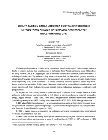 XXX Międzynarodowe Sympozjum Polarne Gdynia, 23–25 września 2004 Streszczenia ZMIANY ZASIĘGU CZOŁA LODOWCA SCOTTA (SPITSBERGEN) NA PODSTAWIE ANALIZY MATERIAŁÓW ARCHIWALNYCH ORAZ POMIARÓW GPS ∗ Zagórski Piotr Zakład Geomorfologii, Instytut Nauk o Ziemi UMCS ul. Akademicka 19, 20–033 Lublin [email protected] Bartoszewski Stefan Zakład Hydrografii, Instytut Nauk o Ziemi UMCS ul. Akademicka 19, 20–033 Lublin [email protected] W niniejszym komunikacje podjęto próbę zestawienia danych dotyczących zmian zasięgu lodowca Scotta w ostatnim stuleciu. Jest on położonego w NW części Ziemi Wedela Jarlsberga około 2 kilometrów od Stacji Polarnej UMCS w Calypsobyen. Jest to lodowiec o charakterze dolinnym, szerokości około 1.3 m i długości około 5 km. Wypełnia on dolinę, którą można podzielić na dwa odcinki: górny – stanowiący obszar pola firnowego, ograniczonego silnie zaznaczającym się w profilu lodowca progiem (ryglem) oraz dolny wypełniony przez jęzor lodowcowy. Od strony zachodniej lodowiec ogranicza pasmo Wijkanderberget a od strony wschodniej Bohlinryggen. Natomiast ujście doliny zamyka kilkudziesięciometrowy wał moren spiętrzonych (wały lodowo-morenowe) rozcięty bramą lodowcową związaną z odpływem wód proglacjalnych. Ze względu na brak szczegółowych i systematycznych pomiarów zmian zasięgu lodowca Scotta położenie czoła lodowca wyznaczono tylko w tych latach, z których dostępne są materiały archiwalne (mapy, zdjęcia lotnicze – 1936, 1960, 1990) oraz z bezpośrednich pomiarów terenowych (naziemne zdjęcie fotogrametryczne – 1987, pomiary odbiornikami GPS – 2000, 2001, 2002). Uwzględniono lata: 1) XIX wiek (Mała Epoka Lodowa) – w wyznaczeniu zasięgu czoła wykorzystano terenowe obserwacje w ramach kartowania geomorfologicznego i wykonana mapy fotogeologicznej dla przedpoli lodowców Renarda, Scotta i Blomli (Szczęsny i in. 1989). 2) 1936 – zasięg lodowca wyznaczono na podstawie archiwalnej norweskiej mapy topograficznej 1:100 000 powiększona do 1:25 000. 3) 1960 – jako materiał archiwalny wykorzystano pierwsze dla tego regionu pionowe zdjęcia lotnicze. Jednaj analizując zdjęcie, zamieszczone w pracy J. Landvika i innych (1992, str. 337), wykonane w 1963 ∗ Praca wykonana w ramach realizacji grantów KBN: 6 P04E 044 19, 6 P04E 034 20 209 209 roku, czoło lodowca Scotta ma wyraźnie znacznie większy zasięg niż na zdjęciu lotniczym z 1960 roku. Prawdopodobnie jest to wynikiem szarży lodowca (mini szarży – Jania 1993; Reder 1998). Ze względu na typ zdjęcia nie było możliwe wykreślenie zasięgu czoła lodowca Scotta w 1963 roku. 4) 1987 – podczas II wyprawy polarnej UMCS na Spitsbergen w 1987 roku po raz pierwszy wykonano szczegółowe naziemne pomiary fotogrametryczne na przedpolu lodowca Scotta (Merta, Ozimkowski 1990). Dokonano również porównania z danymi uzyskanymi z analizy fotogrametrycznej zdjęć lotniczych z 1960 oraz analizy zmian zasięgu i geometrii lodowca w okresie 1960 – 1987. Stwierdzono, że w okresie 27 lat lodowiec Scotta wycofał się o około 530 m (z nowszych pomiarów GPS wynika, że jest to wartość zawyżona), tj. około 20 m/rok, a powierzchnia uległa obniżeniu o około 75 m (2.7 m/rok). Jednak zarówno w przypadku pomiarów z 1987 jak i mapy fotogeologicznej w skali 1:10 000 brak jest informacji o układzie współrzędnych oraz odwzorowaniu, co w sposób zasadniczy utrudnia szczegółowe porównywanie z nowszymi danymi. 5) 1990 – zasięg lodowca Scotta wyznaczono na podstawie analizy fotogrametrycznej zdjęć lotniczych udostępnionych przez Norweski Instytut Polarny. Wykonany na ich podstawie cyfrowy model terenu pozwolił na opracowanie podkładu hipsometrycznego z dokładnością do 1 m (Zagórski 2002). 6) 2000 – z pomiarach zasięgu czoła lodowca Scotta po raz pierwszy wykorzystano wysokiej klasy geodezyjne odbiorniki GPS (Ahtech Z12, Leica SR530), dające dokładności centymetrowe (Zagórski, Sękowski, 2000). Jednak w trakcie przejścia nie został wyznaczony faktyczny zasięg czoła lodowca, ale zasięg moreny ablacyjnej występujące na jego powierzchni. 7) 2001, 2002 – pomiary wykonywano odbiornikiem GPS Garmin eTrex Summit, rejestrując punktowo zasięg czoła lodowca. Jednak był to pomiar nawigacyjny, nie odniesiony do żadnej stacji referencyjne, a przez to obciążony błędem (kilka, kilkanaście metrów). Tabela 1. Zmiana powierzchni lodowca Scotta w odniesieniu do maksymalnego zasięgu w okresie Małej Epoki Lodowej Rok Powierzchnia (km2) XIX wiek 1936 1960 1987 1990 2000 2001 2002 6.11 5.80 5.74 5.37 5.32 5.04 5.02 5.00 Ubytek powierzchni od XIX wieku (km2) Ubytek powierzchni od XIX wieku (%) 0.31 0.37 0.74 0.79 1.07 1.08 1.11 5.0 6.0 12.0 12.9 17.5 17.3 18.0 Wszystkie dane uzyskane zarówno na podstawie analizy materiałów archiwalnych jak i nowszych danych pomiarowych GPS, transformowano do jednolitego układu współrzędnych UTM 33 na elipsoidzie WGS84 i zestawiono w programie ArcView 3.1 (rys. 1). Dzięki temu możliwe było obliczenie przybliżonej powierzchni lodowca w analizowanych okresach. Dane te zestawiono w tabelach 1 i 2. Dostępne dane pozwoliły również na wykonanie dla 4 lat profili podłużnych wzdłuż lodowca, które umożliwiają analizę zmiany geometrii lodowca Scotta. Przedstawione dane wskazują na recesję lodowca Scotta w ostatnim stuleciu. Przejawia się ona w cofaniu czoła oraz zmianie profilu podłużnego lodowca (rys. 1). Największe obniżenie powierzchni stwierdzono w strefie najniżej położonej. 210 210 Rys. 1. Profile podłużne i zasięgi czoła lodowca Scotta. A: Profile podłużne wzdłuż lodowca Scotta: A-B – 1960, 1987 wg Merta, Ozimkowski 1990; A’-B’ – 1990 – na podstawie modelu cyfrowego uzyskanego z obróbki fotogrametrycznej zdjęć lotniczych, 2002 – pomiary odbiornikiem GPS; B: Zasięgi czoła lodowca Scotta zestawione na podstawie materiałów archiwalnych i pomiar